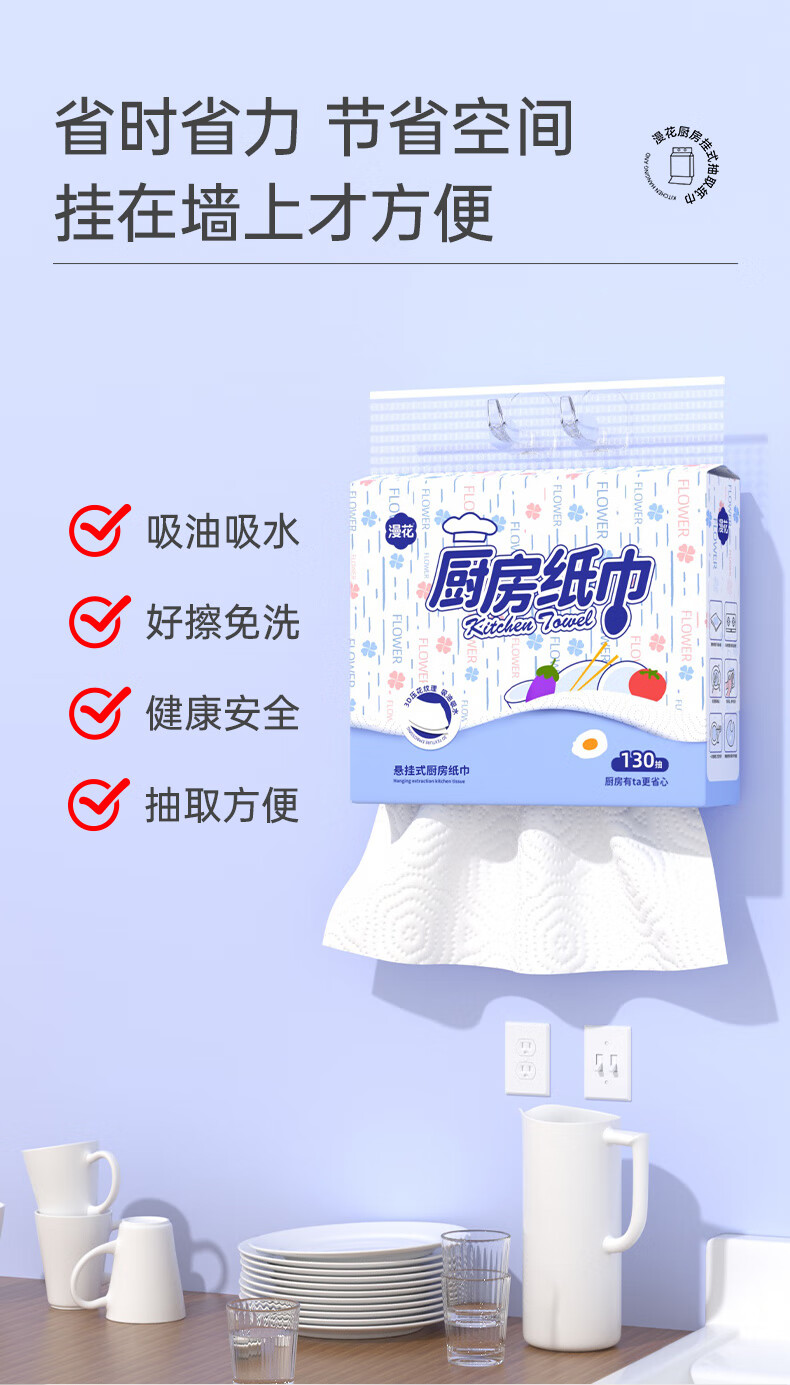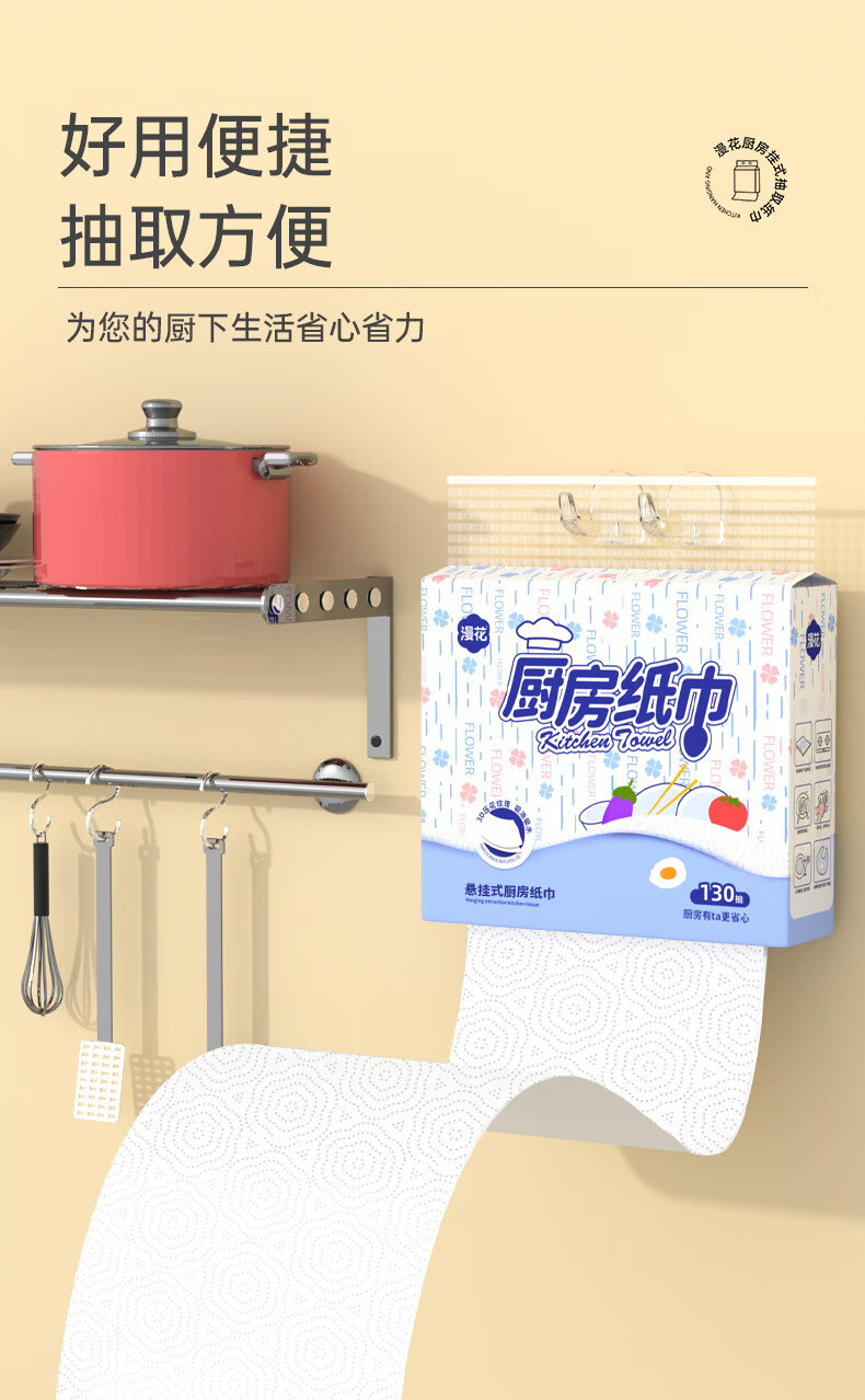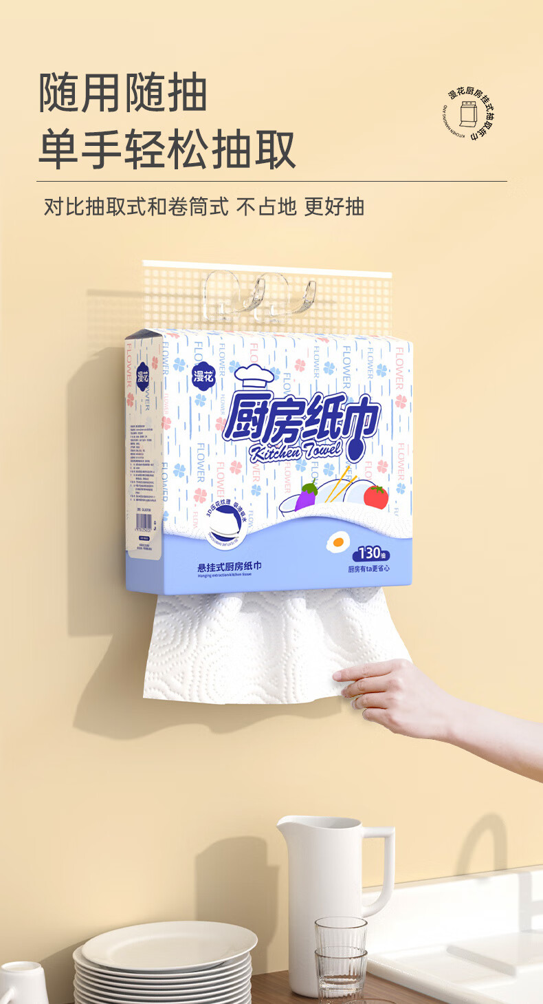 漫花厨房用纸悬挂式厨房纸巾抽纸吸油吸水加大加厚大包一次性厨房纸 【绿色】 2层 130抽*3提