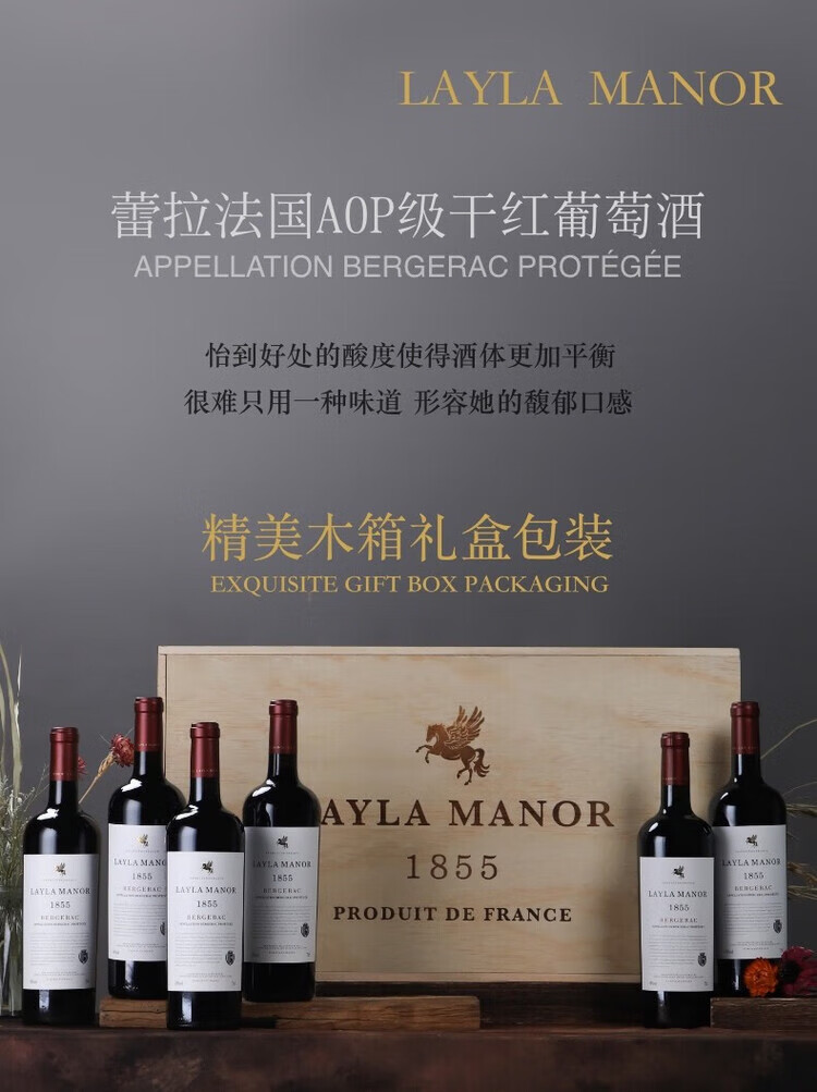 LAYLA【法国蕾拉】AOP级原瓶进口14度干红葡萄酒木箱礼盒装750mlX6瓶