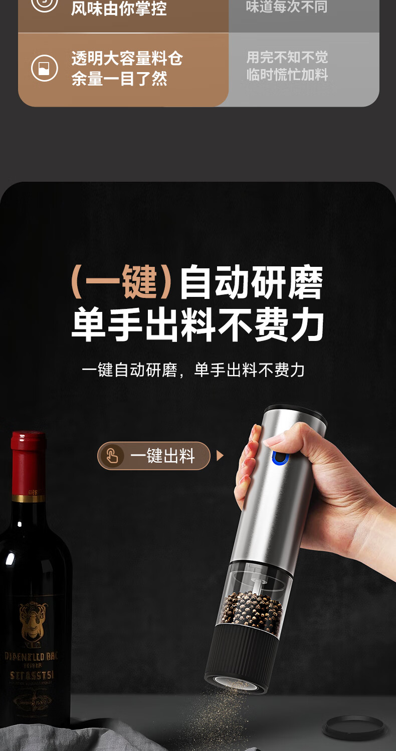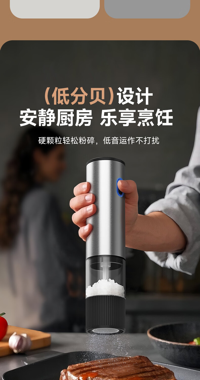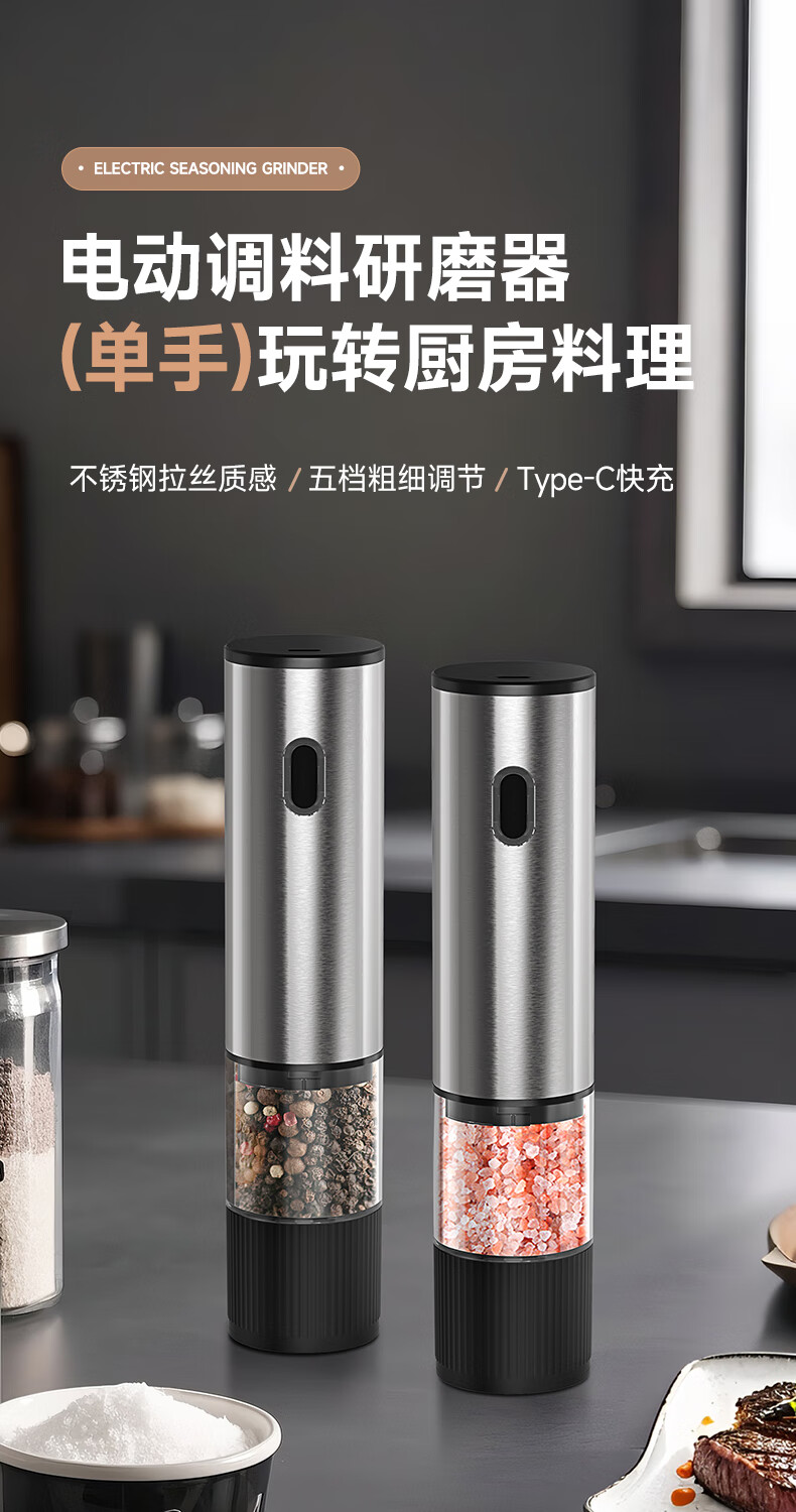 双立人德国进口高端同款品质电动胡椒研磨器家用海盐花椒粉自动研磨机黑 【两个装】升级款(5档调节粗细+长续航+细腻研磨)