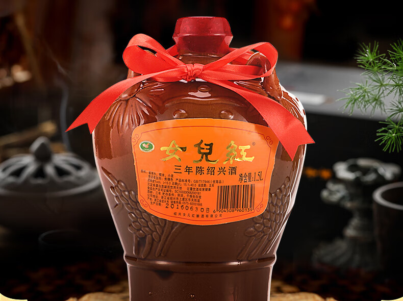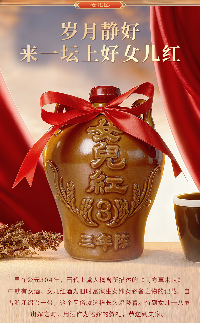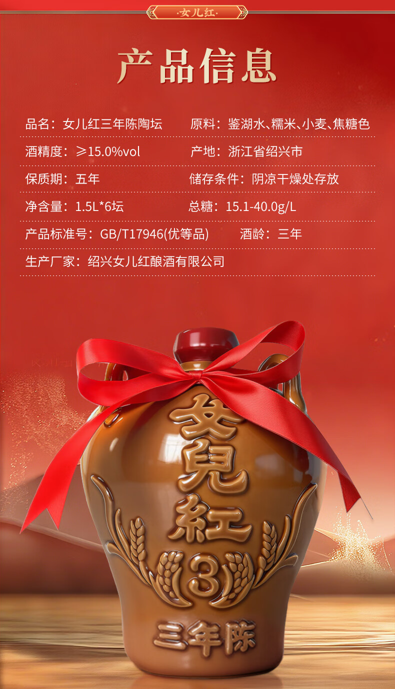 女兒红 陶坛三年 半干型 绍兴黄酒 1.5L*6坛 整箱装 小坛冬酿 送礼 年货