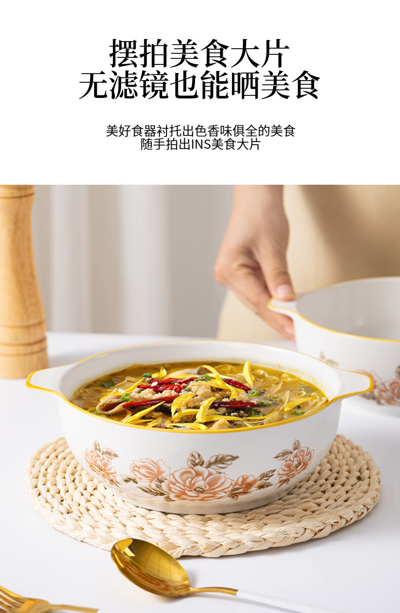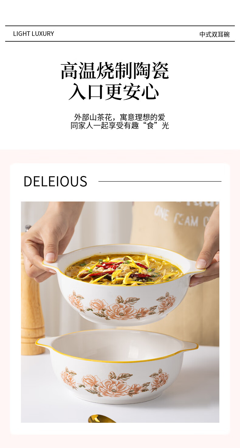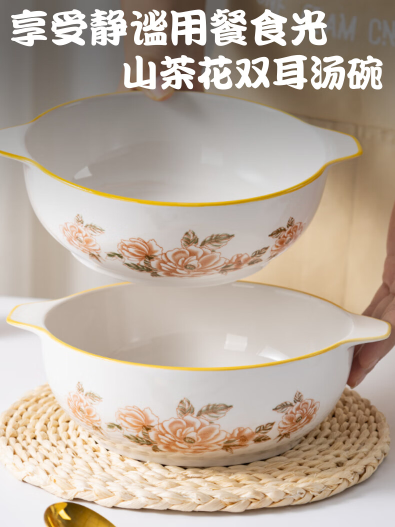 山茶花双耳加厚汤碗9.5英寸耐高温陶瓷水煮鱼碗大盆碗酸菜鱼汤碗 山茶花9.5英寸大汤碗【1个装】 无规格