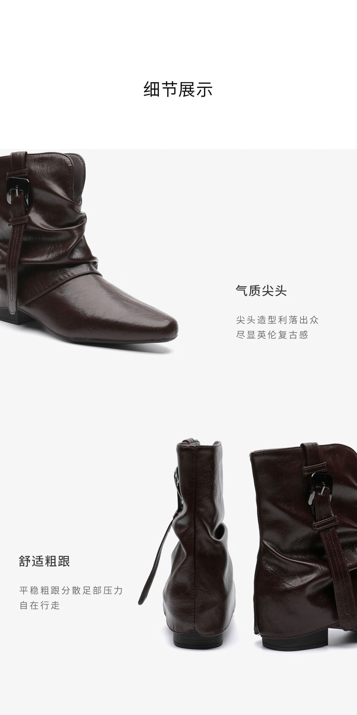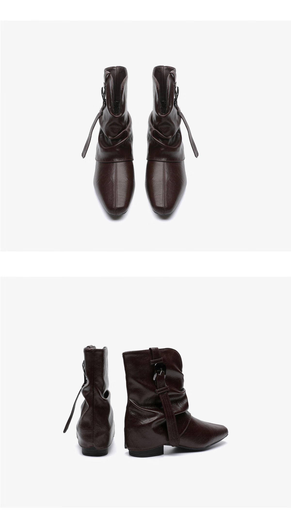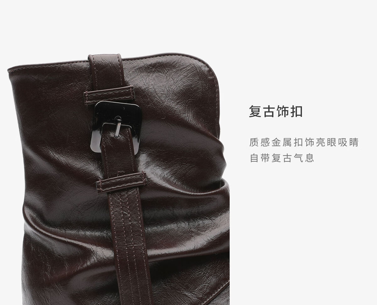 月芽儿2025冬季复古皮带扣堆堆短靴女棕色尖头瘦瘦靴裤管靴时装靴 绒里黑色01T 34