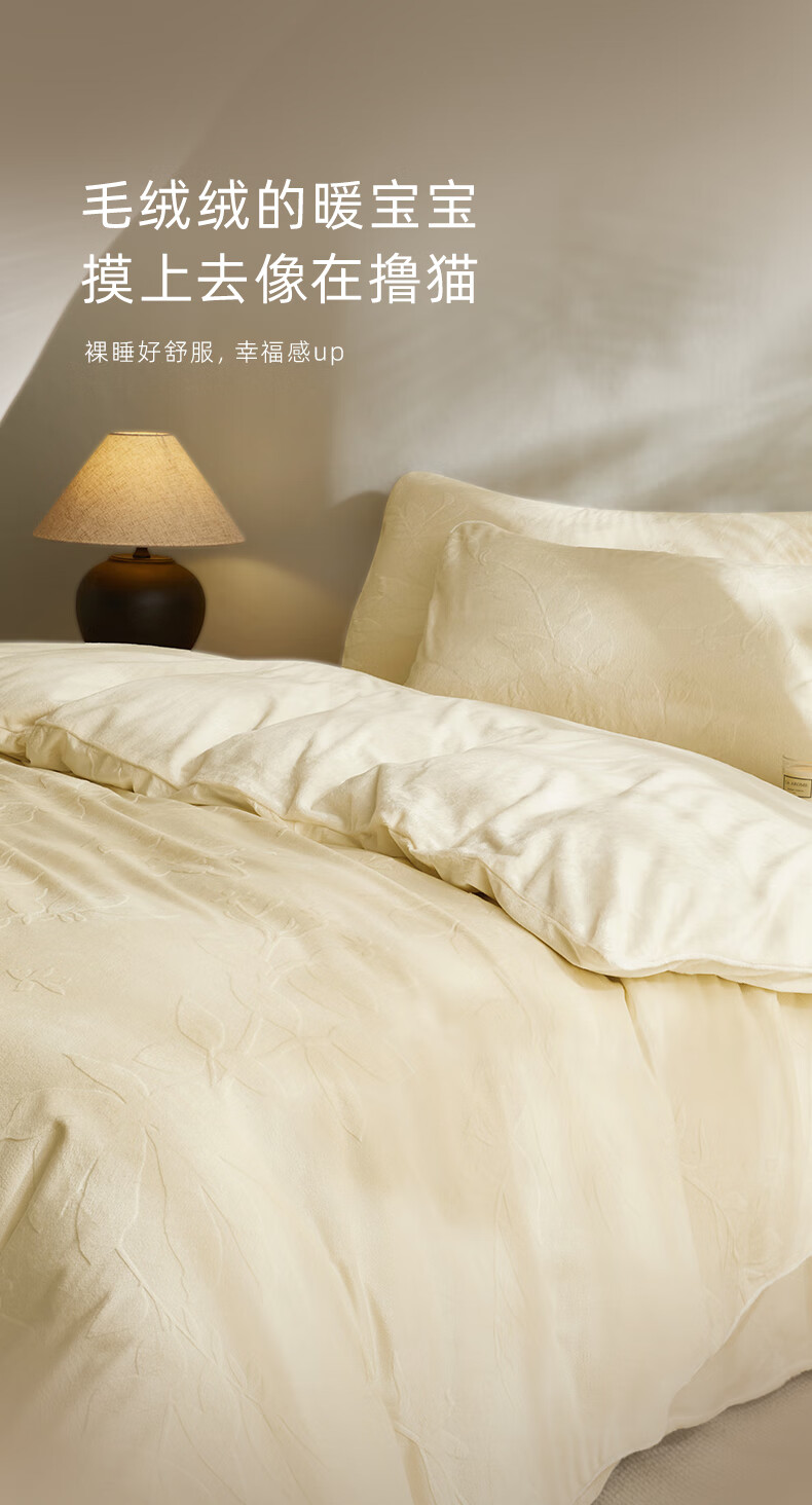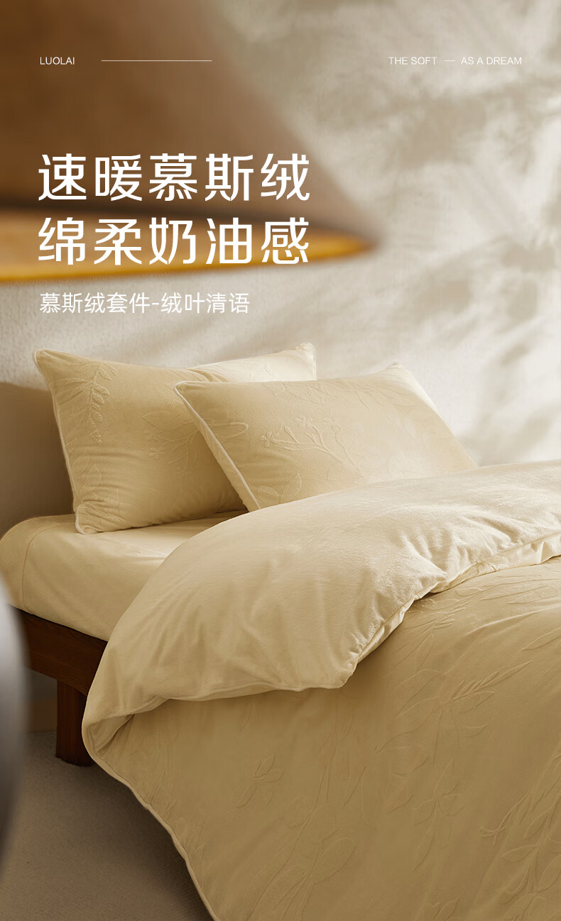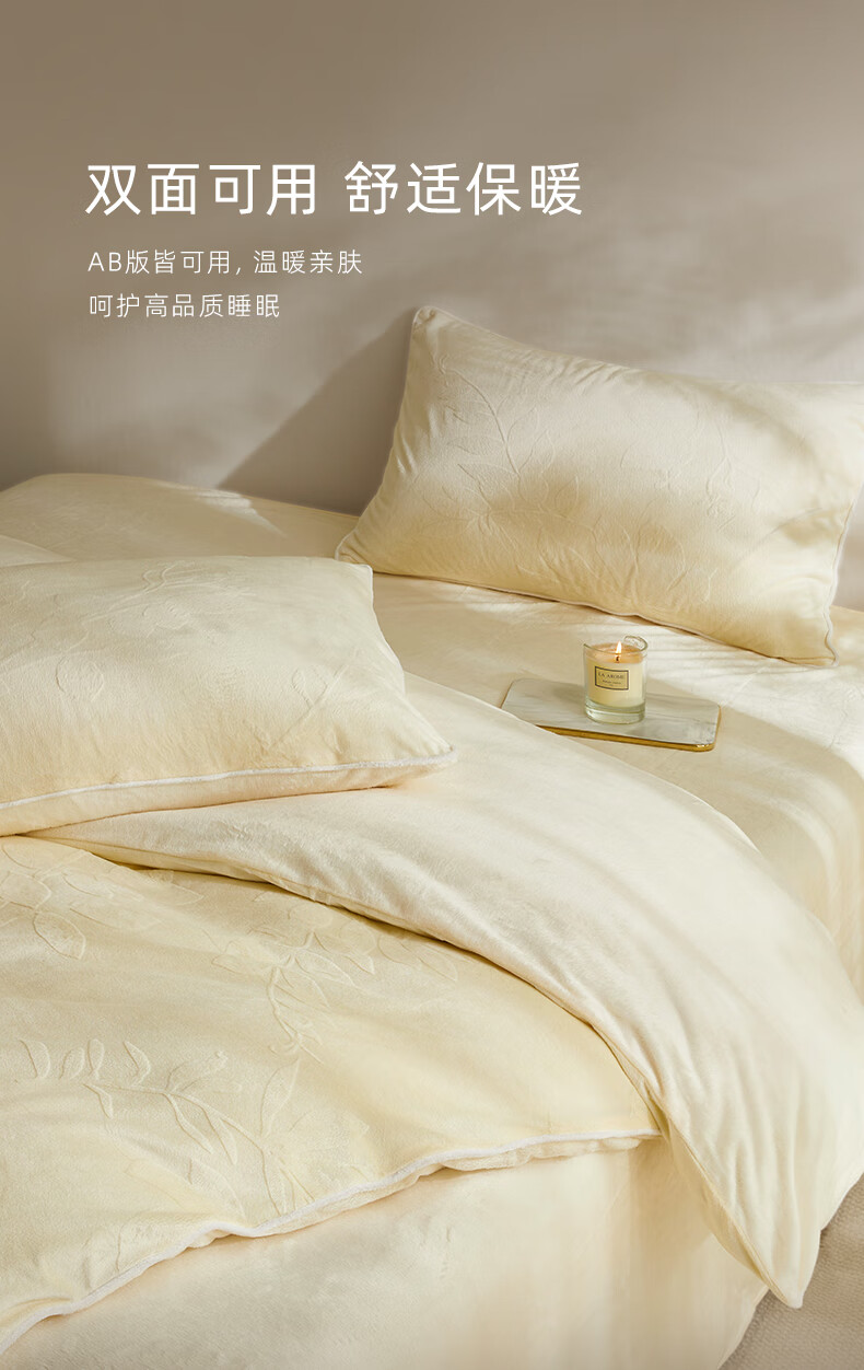 罗莱家纺 A类慕斯绒冬季加绒四件套牛奶绒套件珊瑚绒 浅黄色220*250