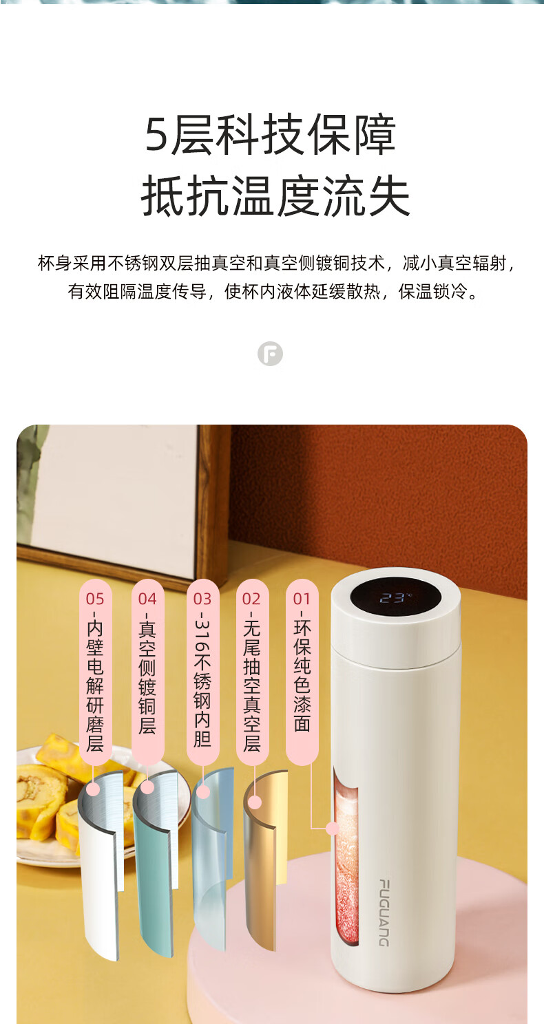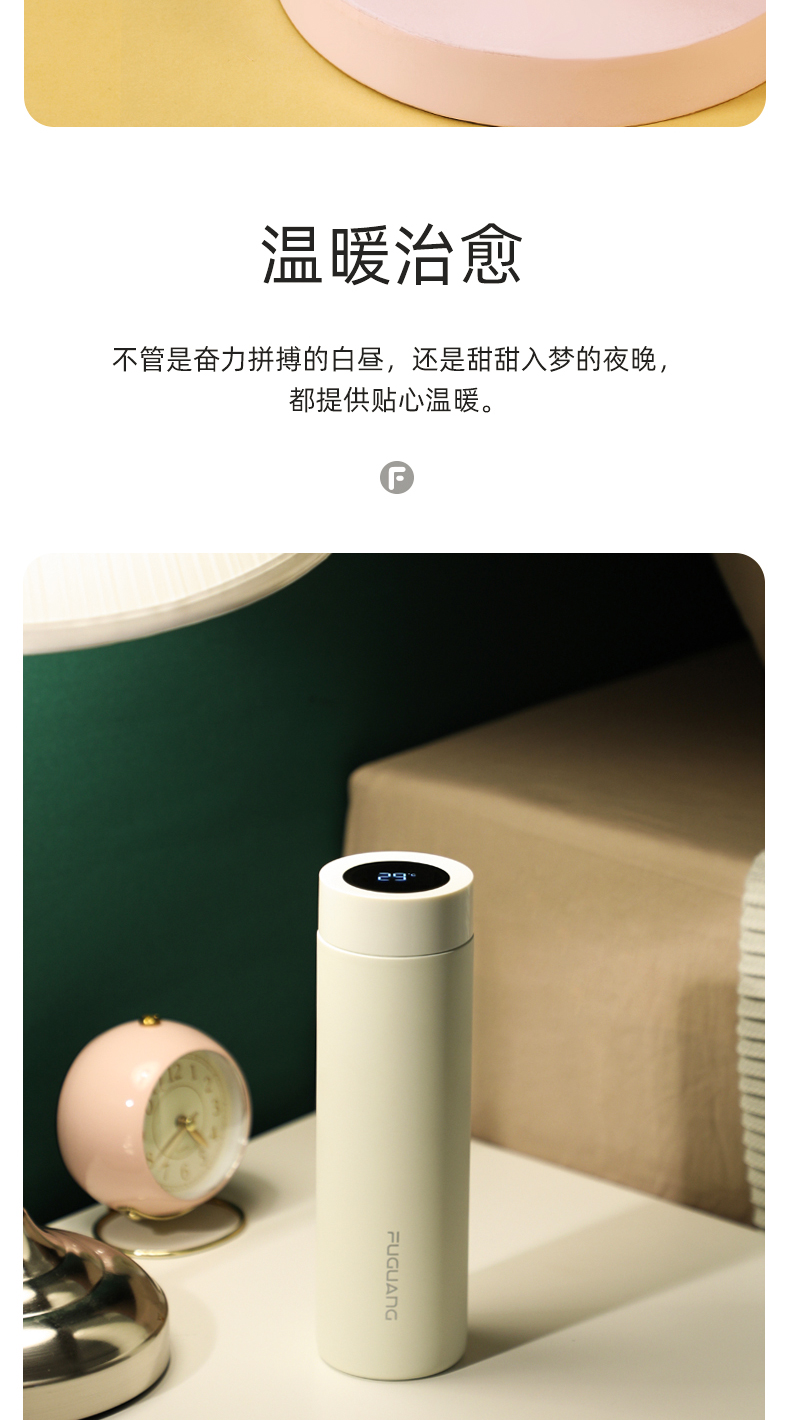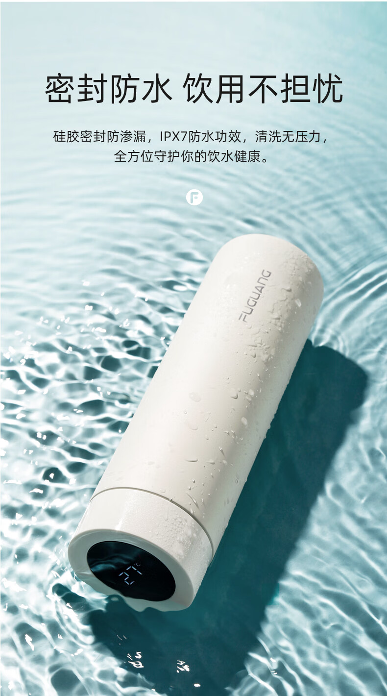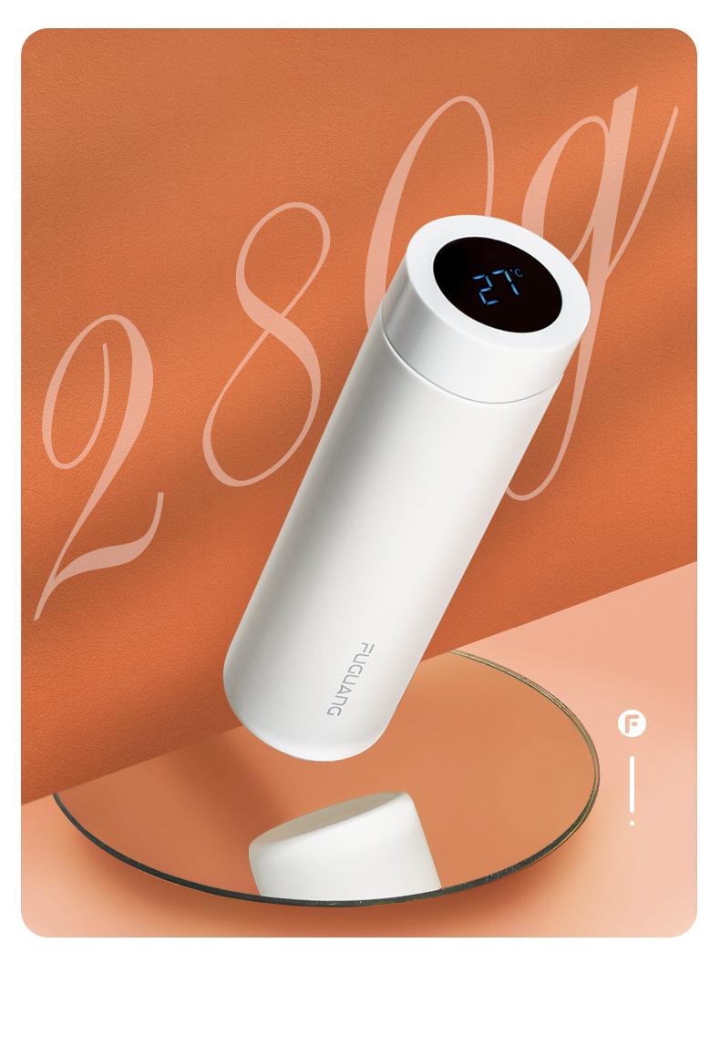 富光 保温杯 SUMMER系列智能显温杯 316不锈钢杯子男女车载水杯便携简约时尚泡茶杯带温度显示 白色380ml