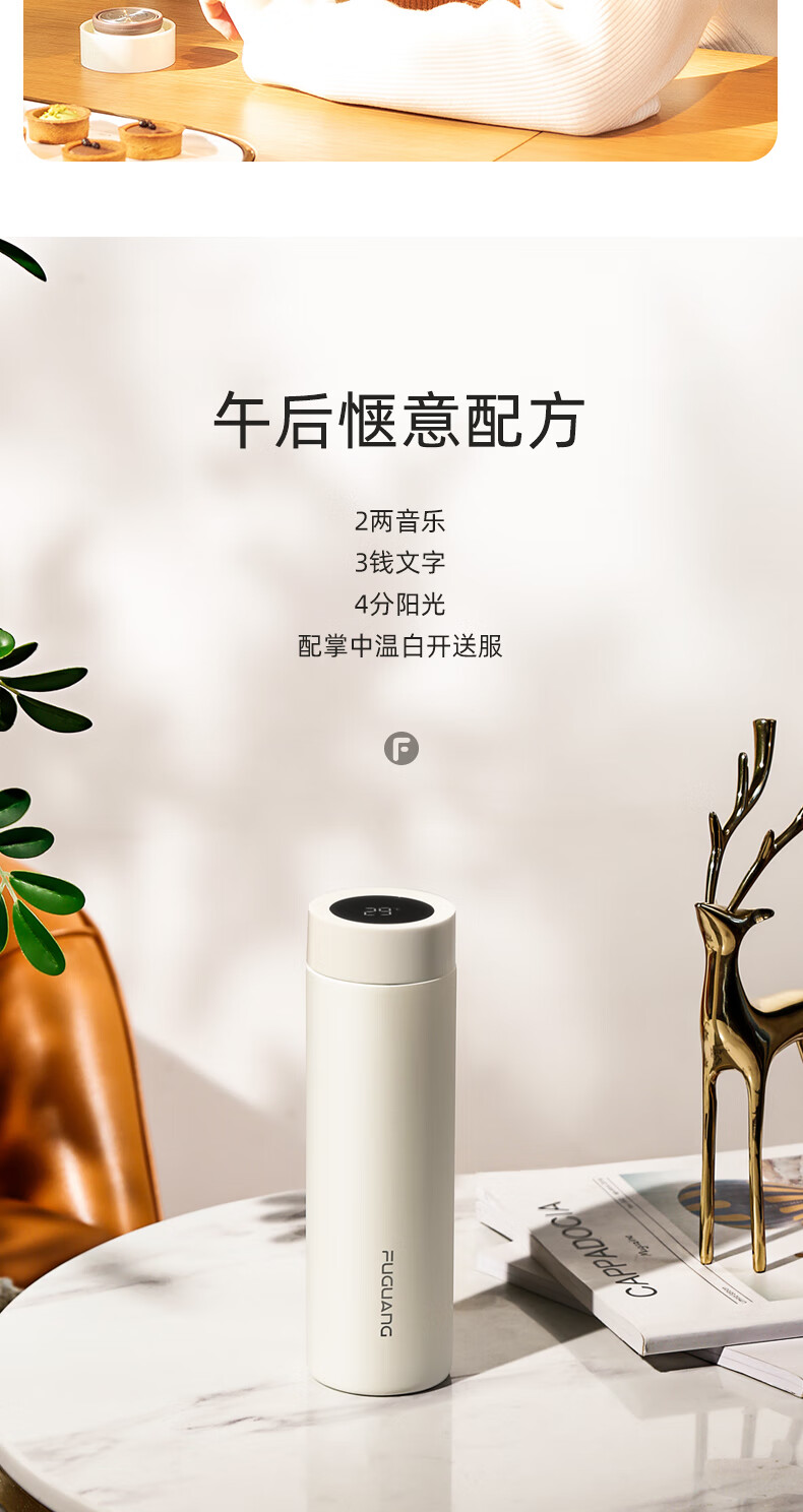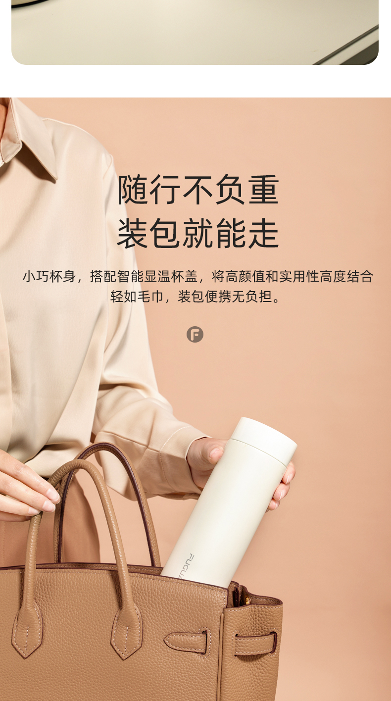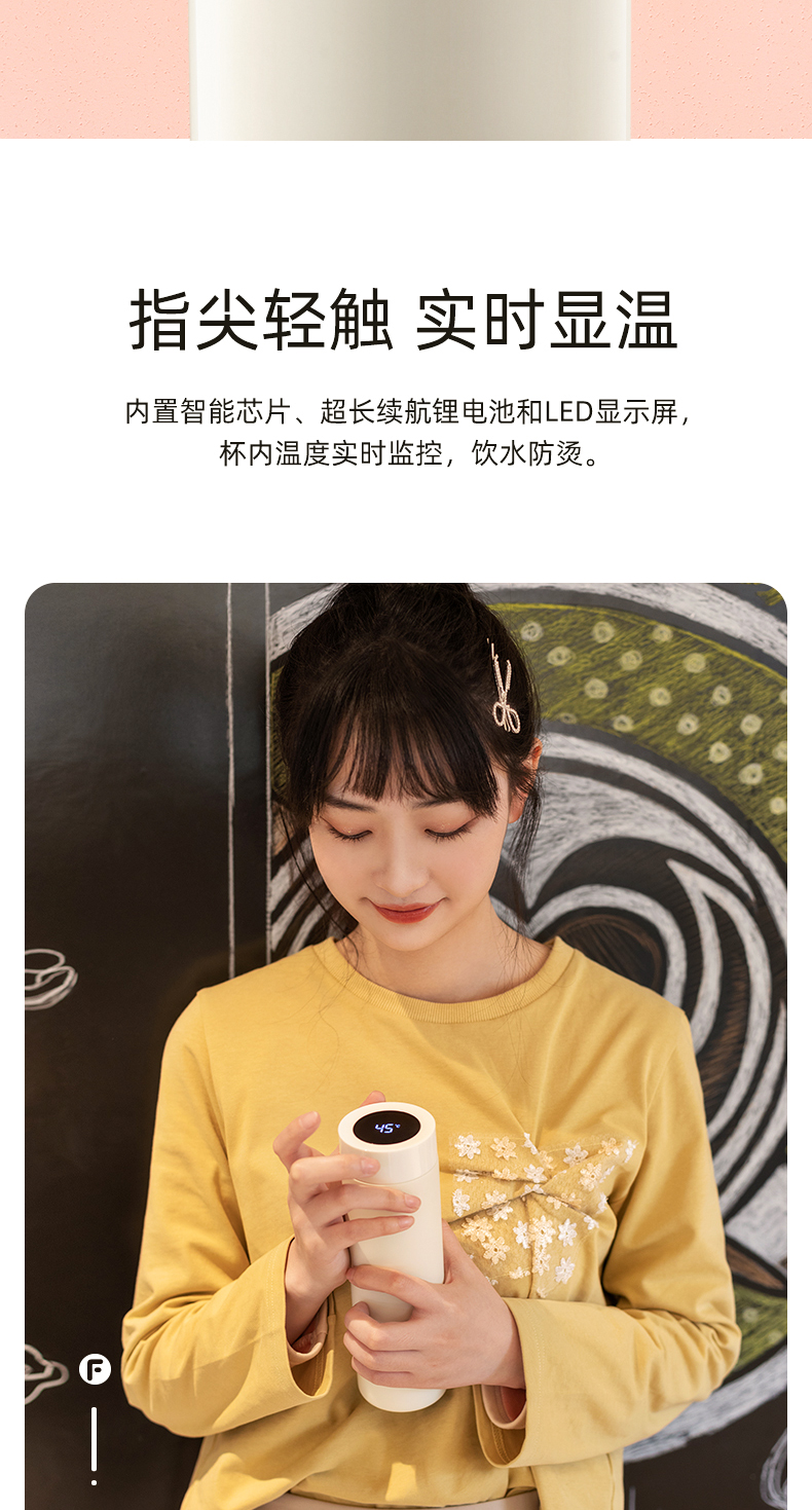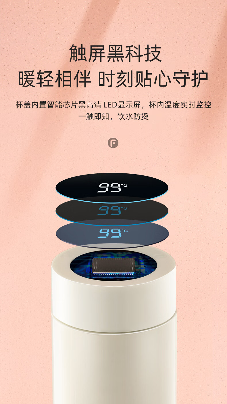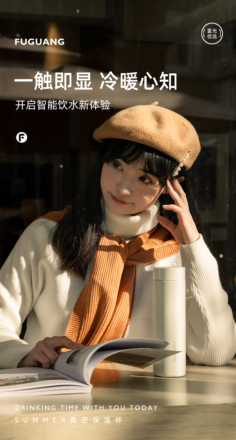 富光 保温杯 SUMMER系列智能显温杯 316不锈钢杯子男女车载水杯便携简约时尚泡茶杯带温度显示 白色380ml