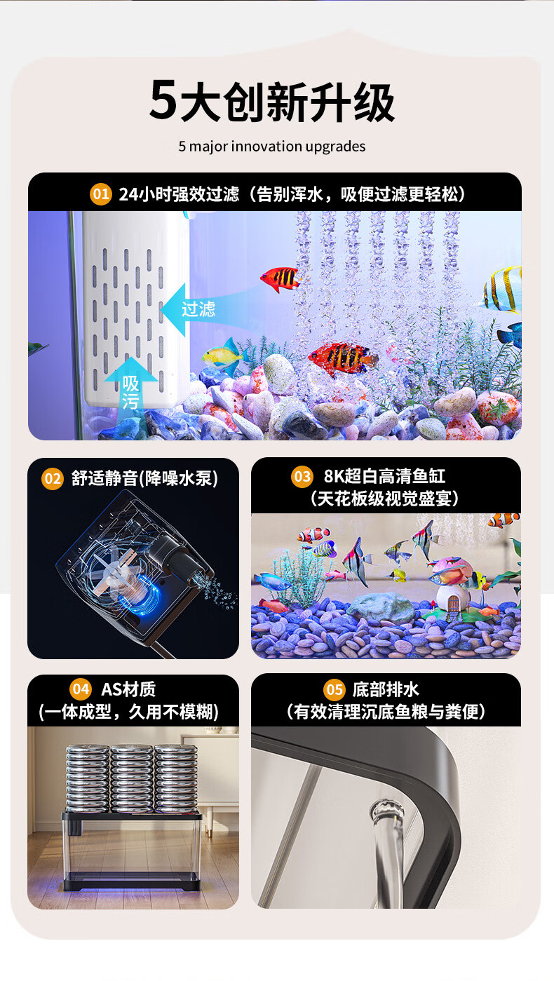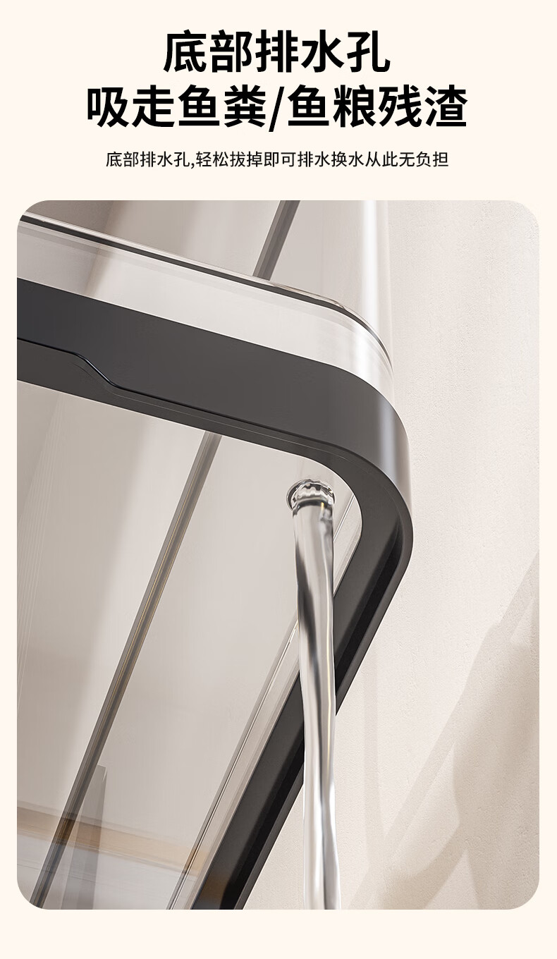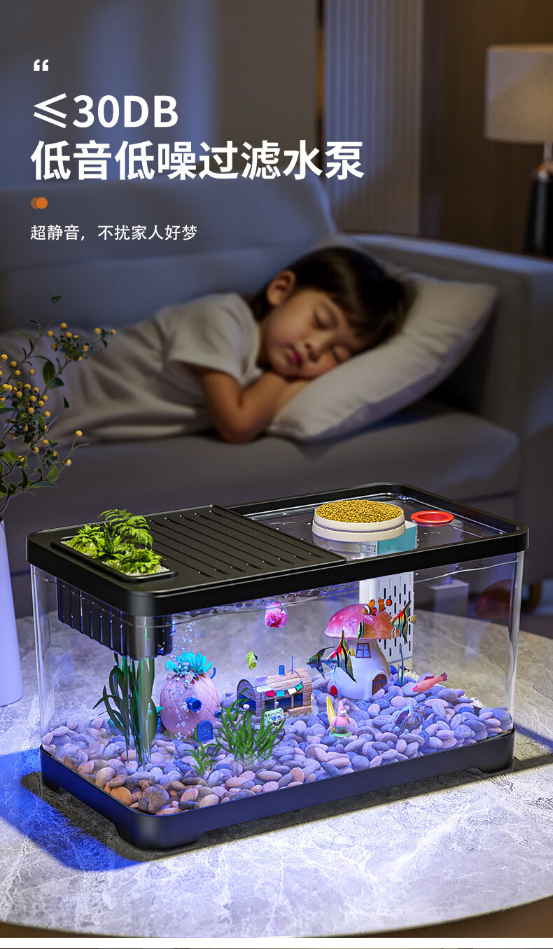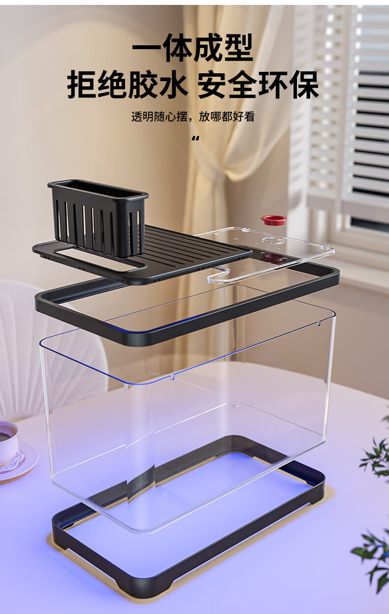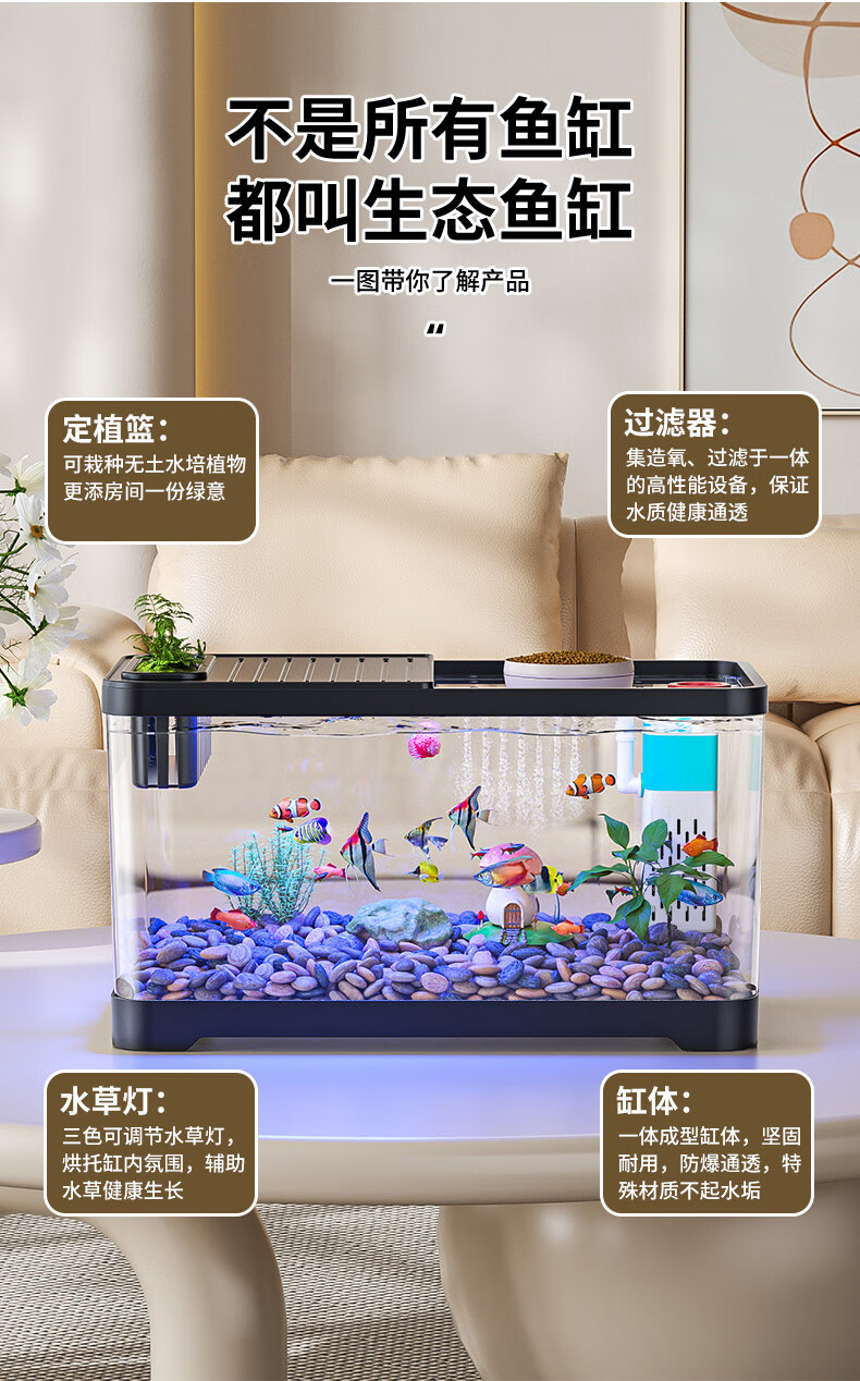 宠小岛鱼缸水族箱新款高级懒人客厅生态高清带盖造景过滤制氧塑料金鱼缸 【经典黑】60高清缸带灯测温简易造景款