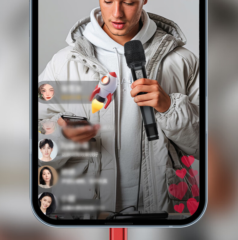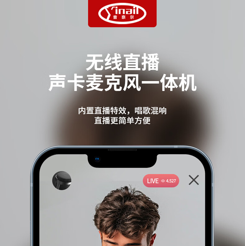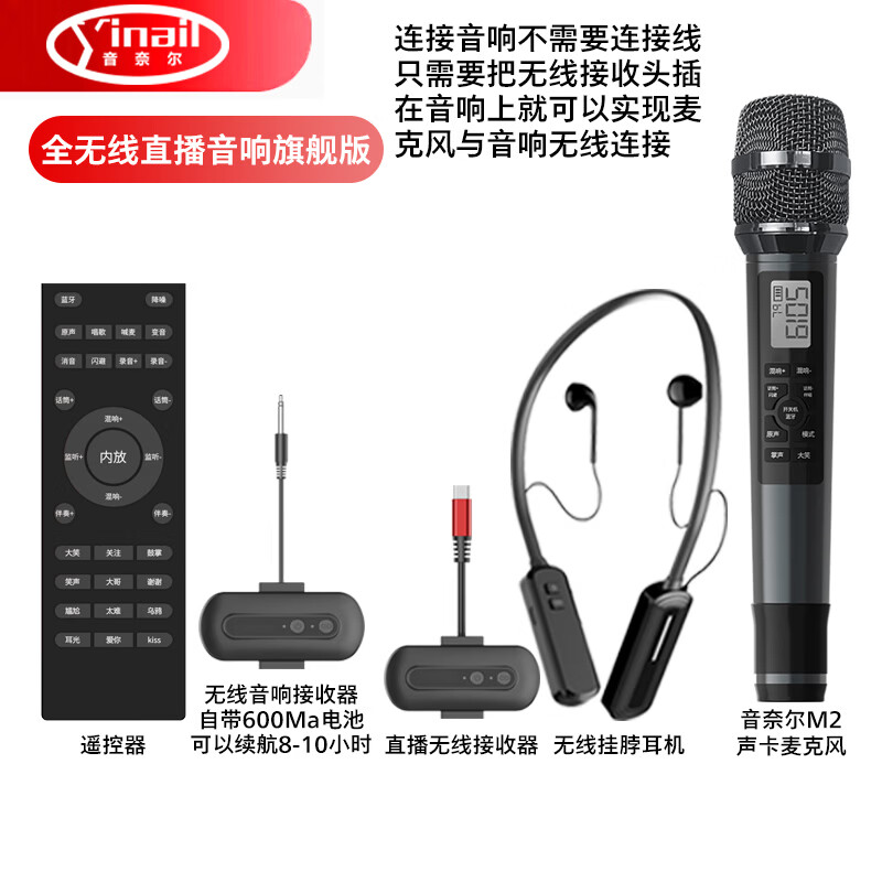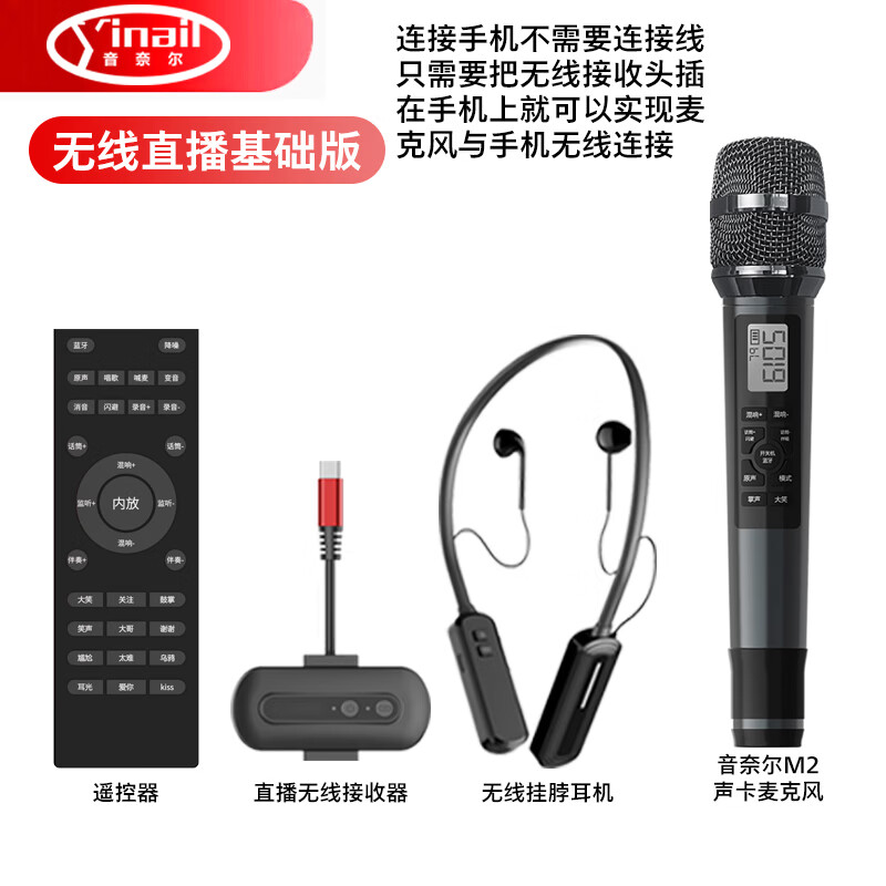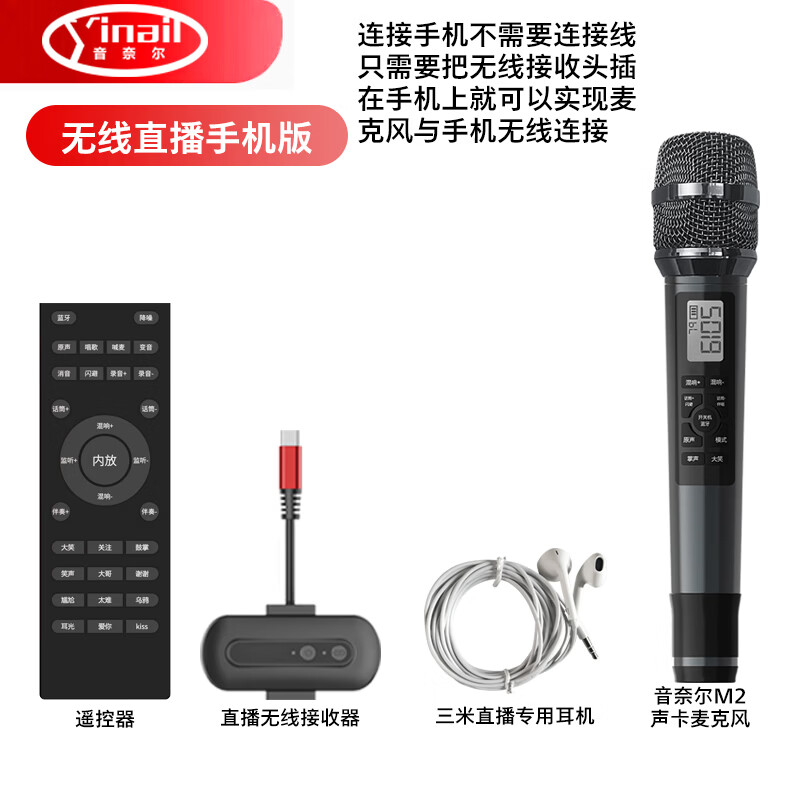 音奈尔(yinail)自带声卡无线麦克风 无线连接音响免接线 户外K歌 手机直播唱歌设备 主播手持无线话筒 即插即用 M2无线声卡麦+手机和音箱接收器+遥控器+无线耳机