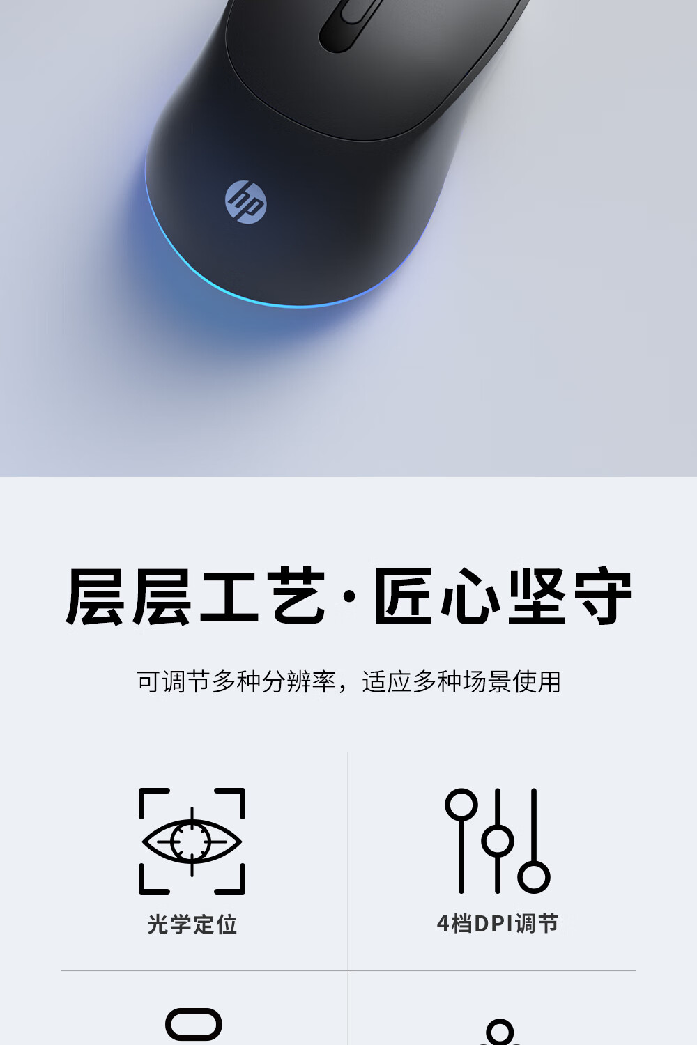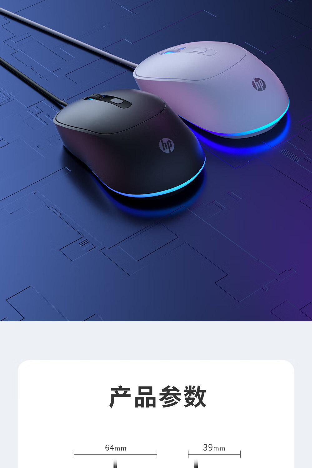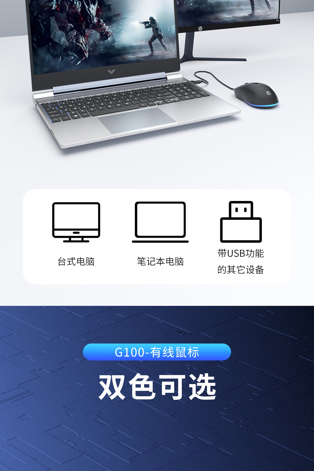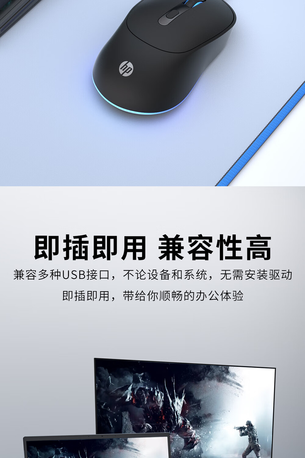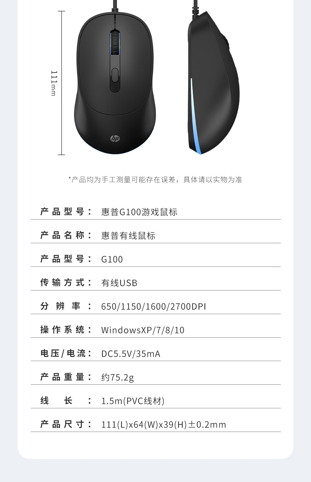 惠普(HP)G100鼠标有线办公人体工学 笔记本电脑台式机通用USB适用 黑色静音