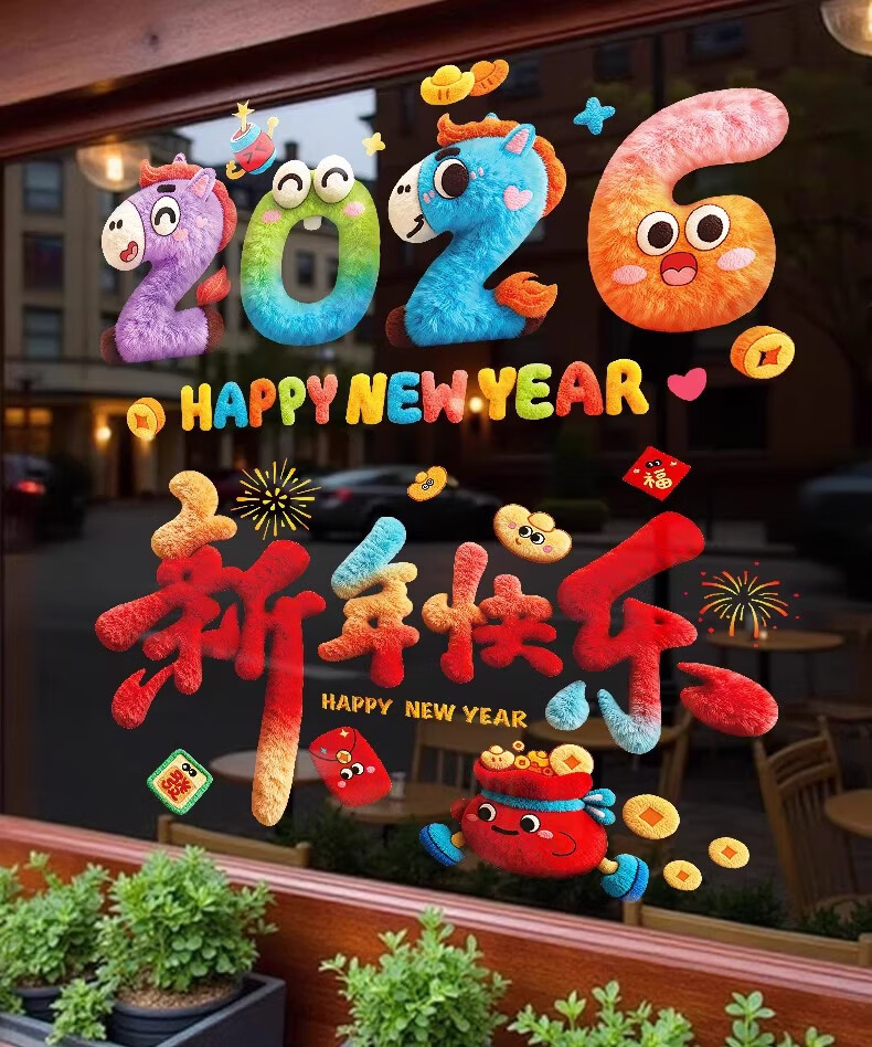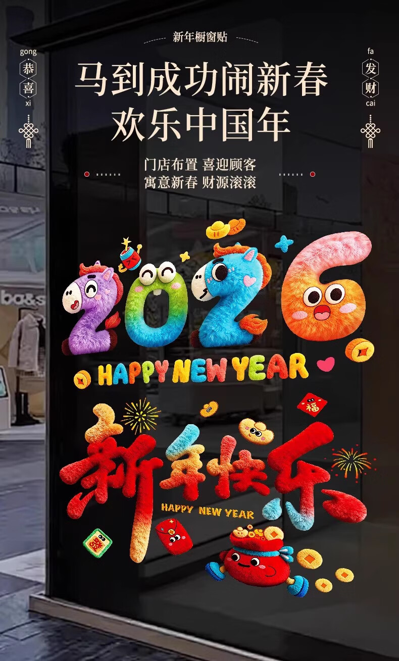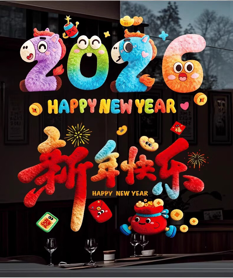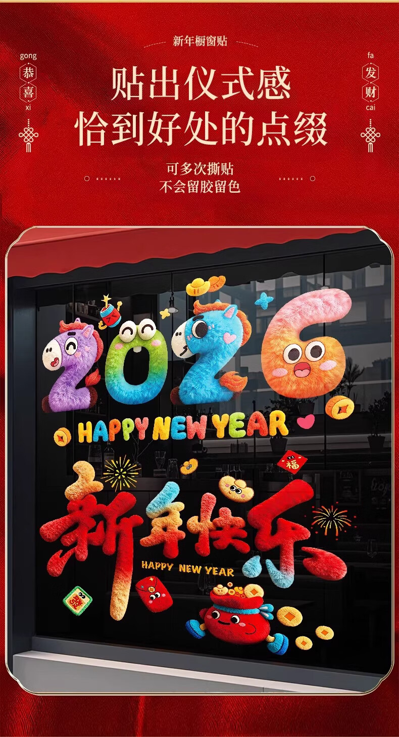 米卡博2026马年窗花静电贴新款装饰玻璃贴过年春节氛围布置橱窗花贴纸 【2026+新年快乐】1套2张:强静电/无残留胶 无规格