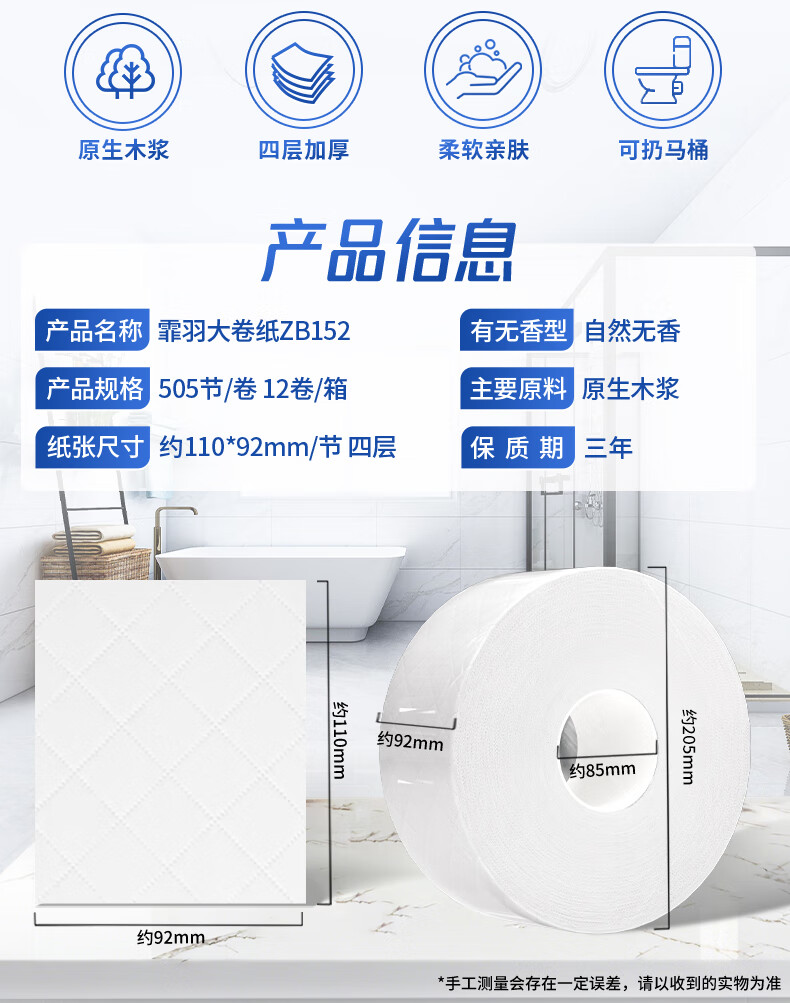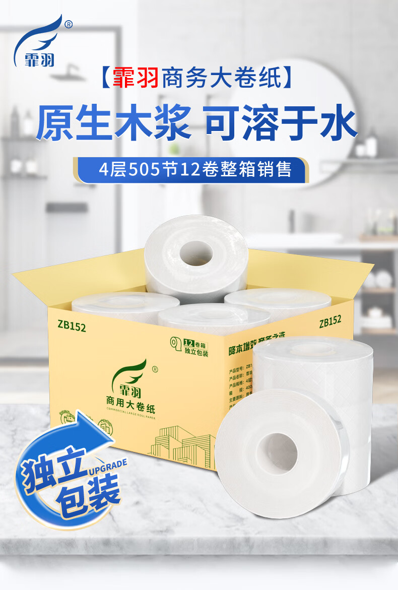 霏羽商用大卷纸大盘纸酒店卫生间厕纸卫生纸手纸4层505节*12卷整箱
