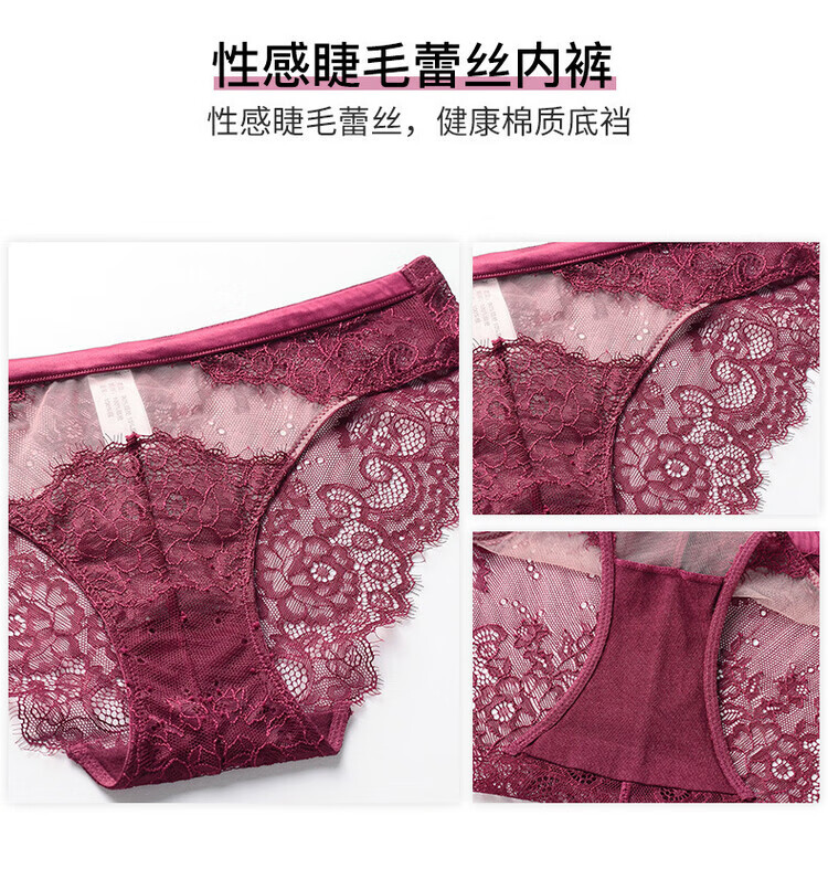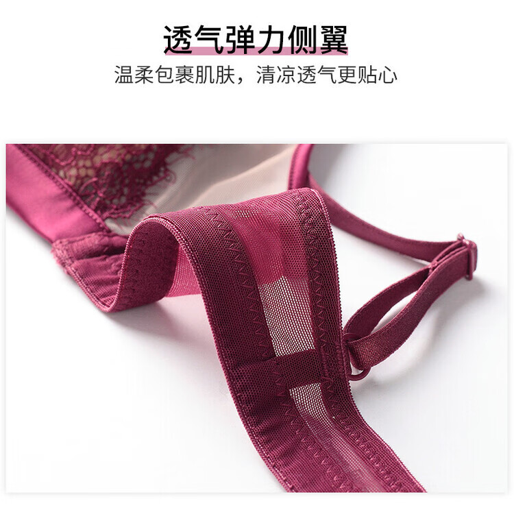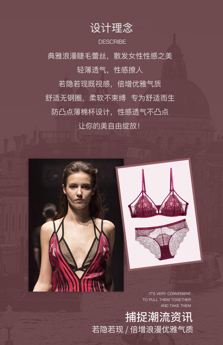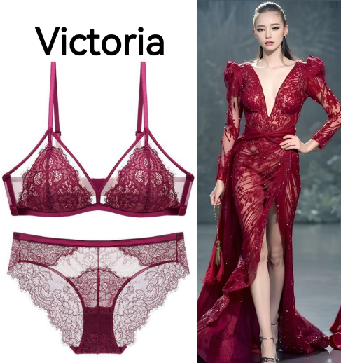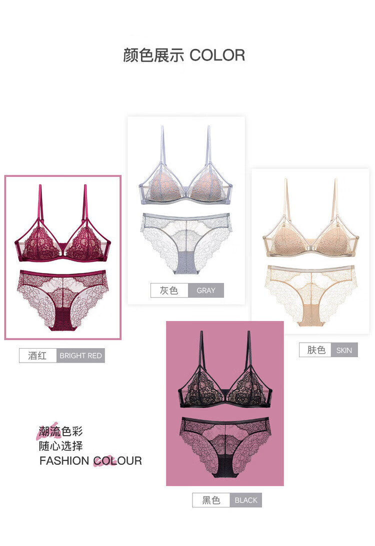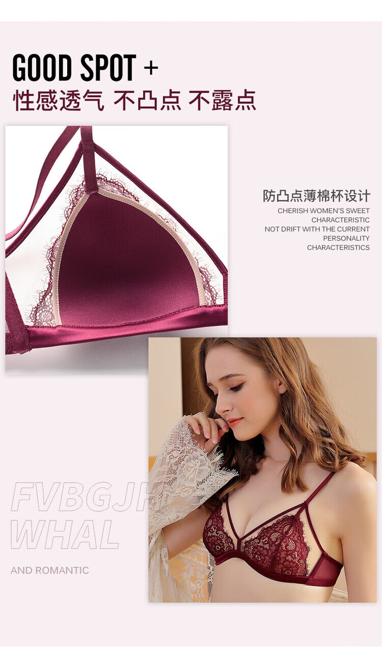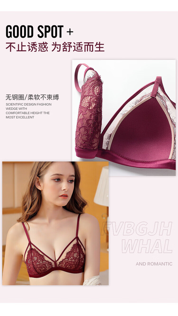 VICTTORIS BARS性感内衣女无钢圈大胸显小聚拢上托薄棉三角杯文胸蕾丝高级感套装 酒红套装 L 【适合80A.80B.80C】