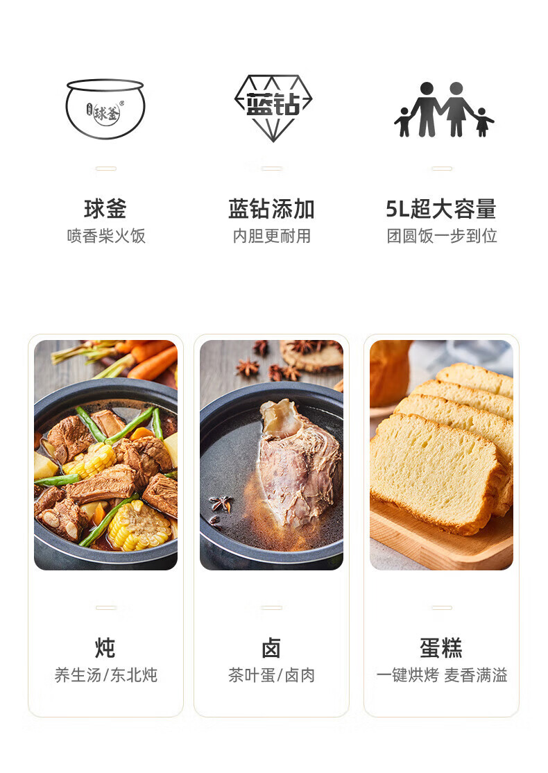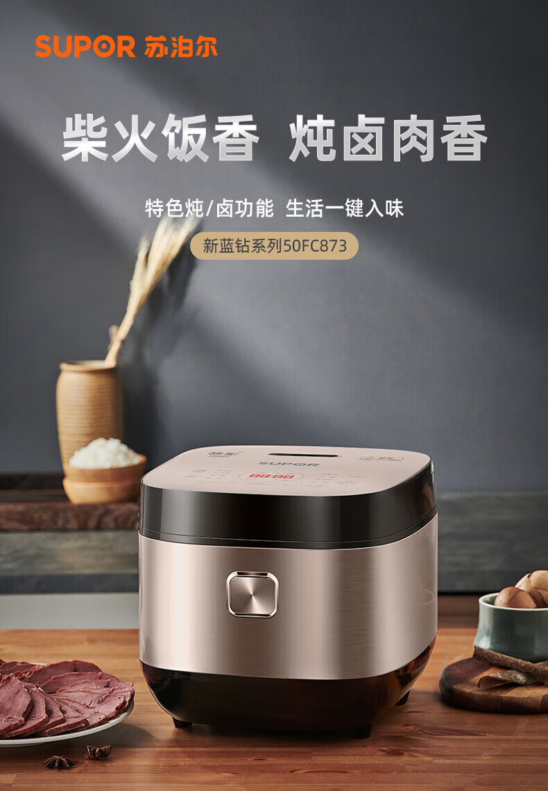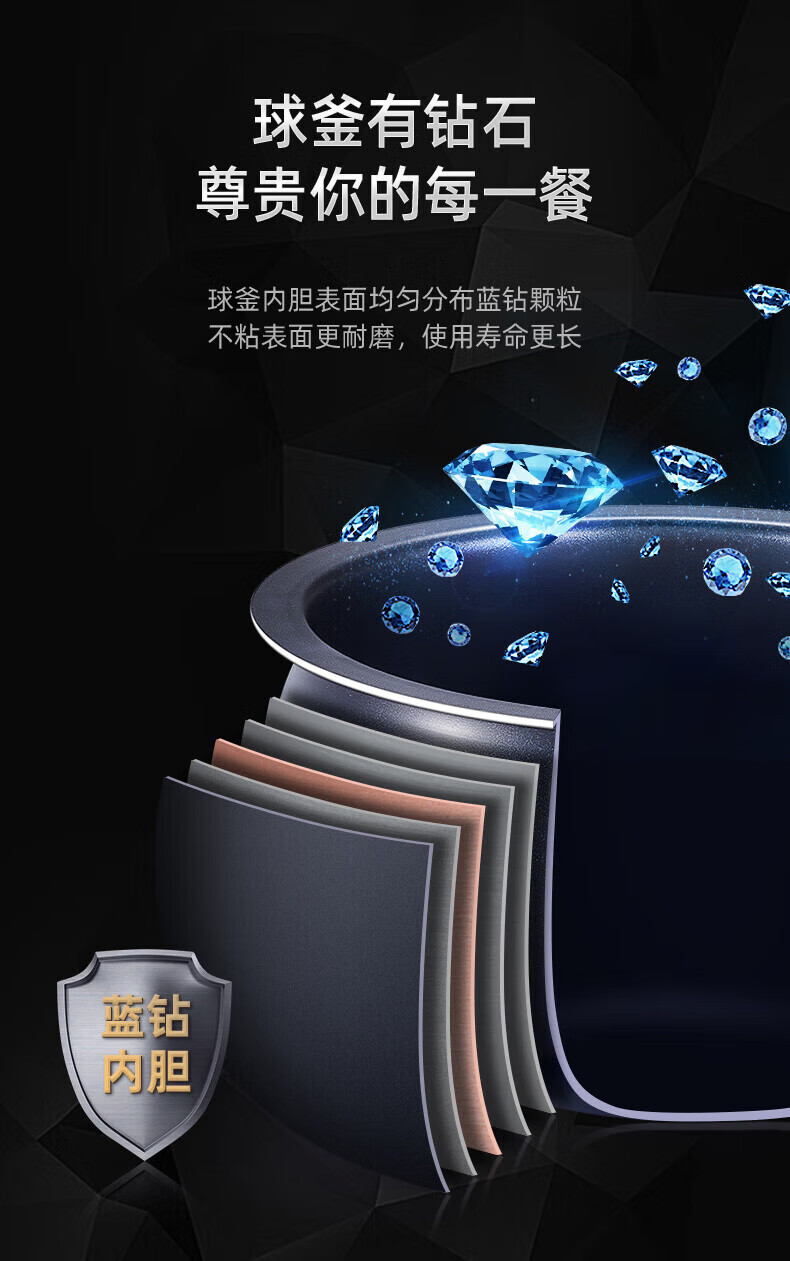 苏泊尔(SUPOR)电饭煲5L大容量家用5-8-10个人电饭锅多功能微压一体蓝钻球釜特色炖卤功能煮粥锅24小时预约熬粥锅 聚能加厚球釜内胆 5L