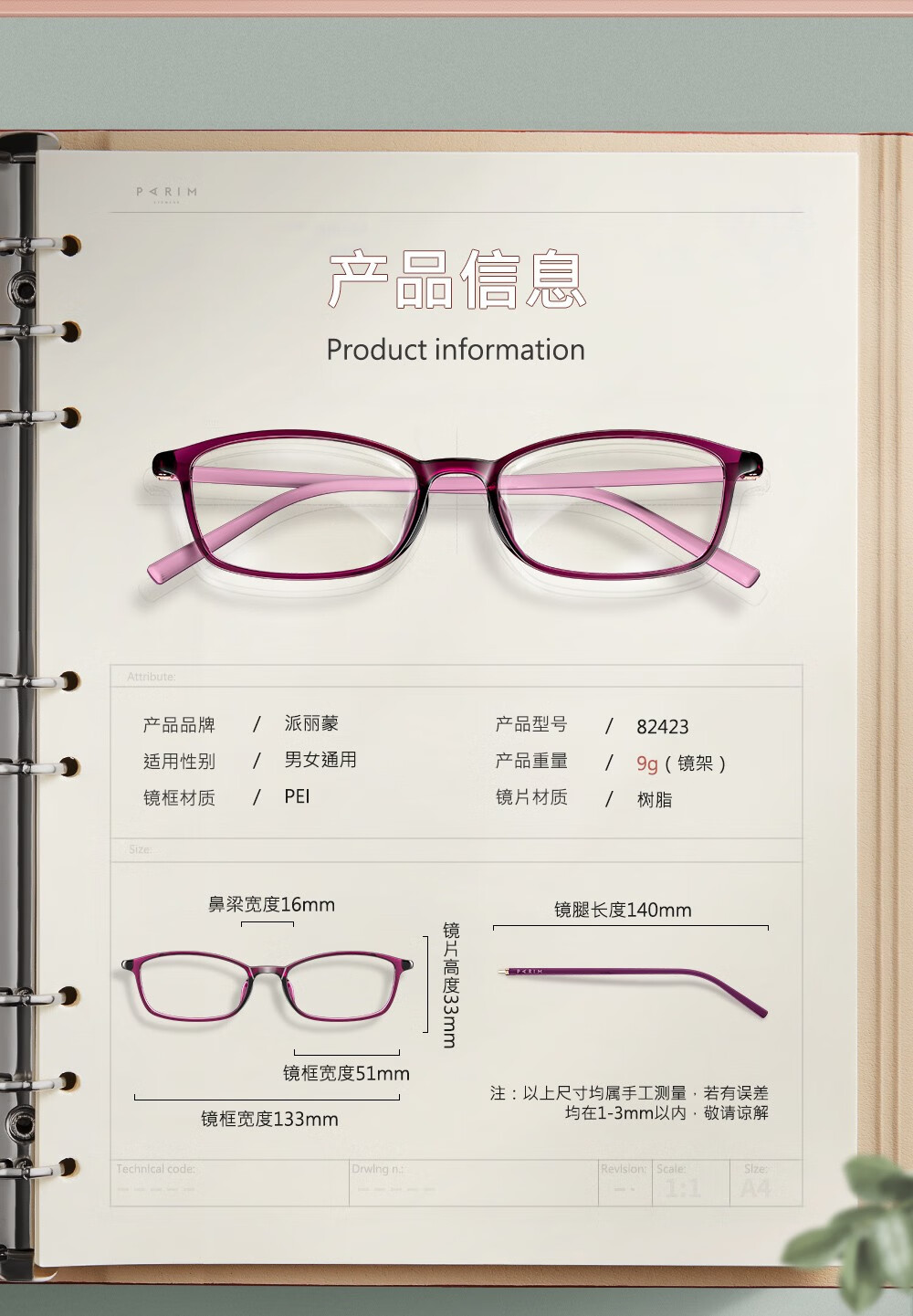 派丽蒙(PARIM) 高度近视眼镜女款可配近视防蓝光小框眼镜框近视架显脸小82423 R1-酒红-内酒红外黑