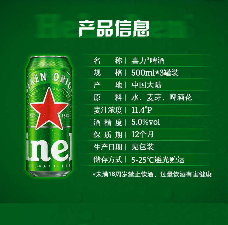 喜力经典500ml*3听 喜力啤酒Heineken