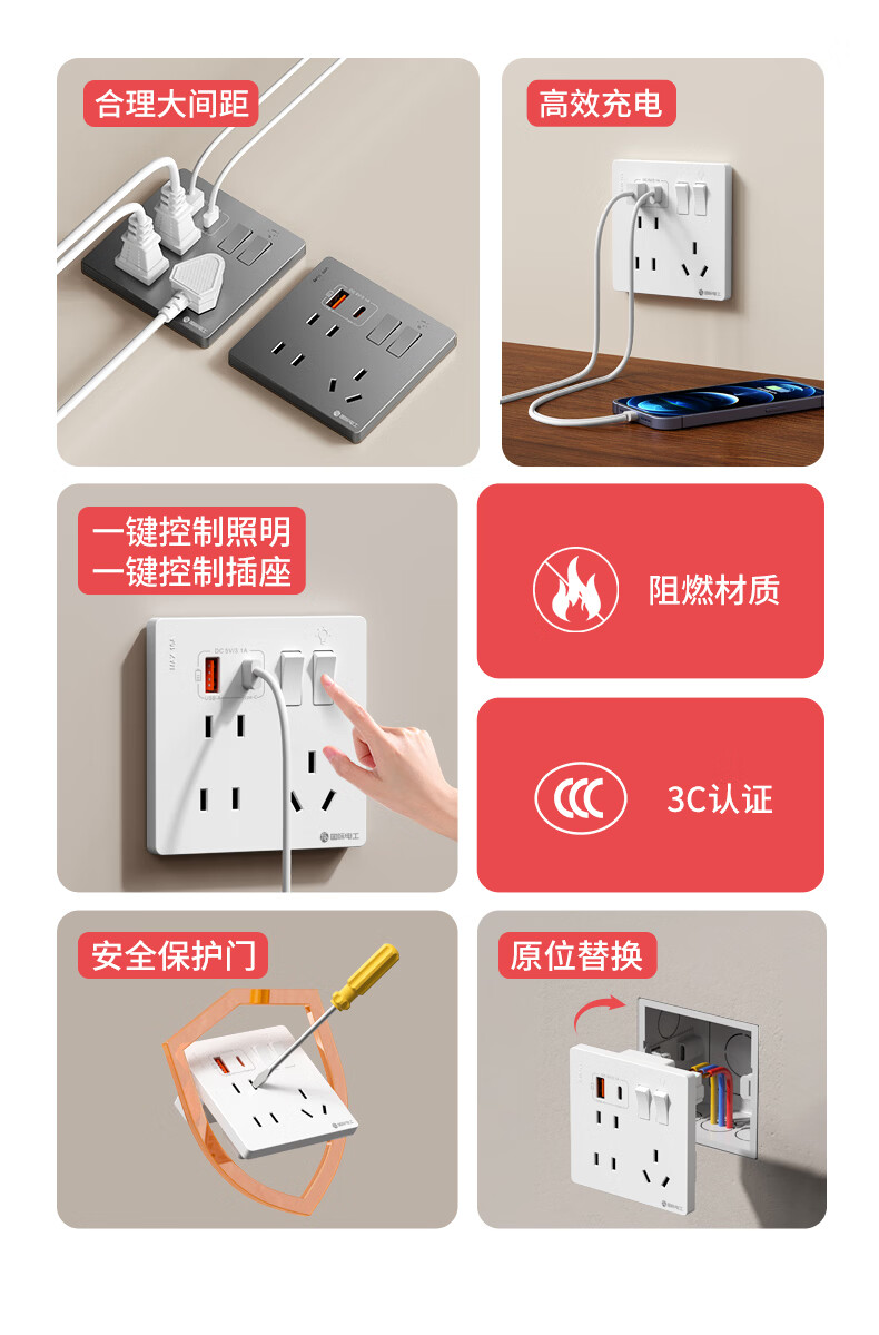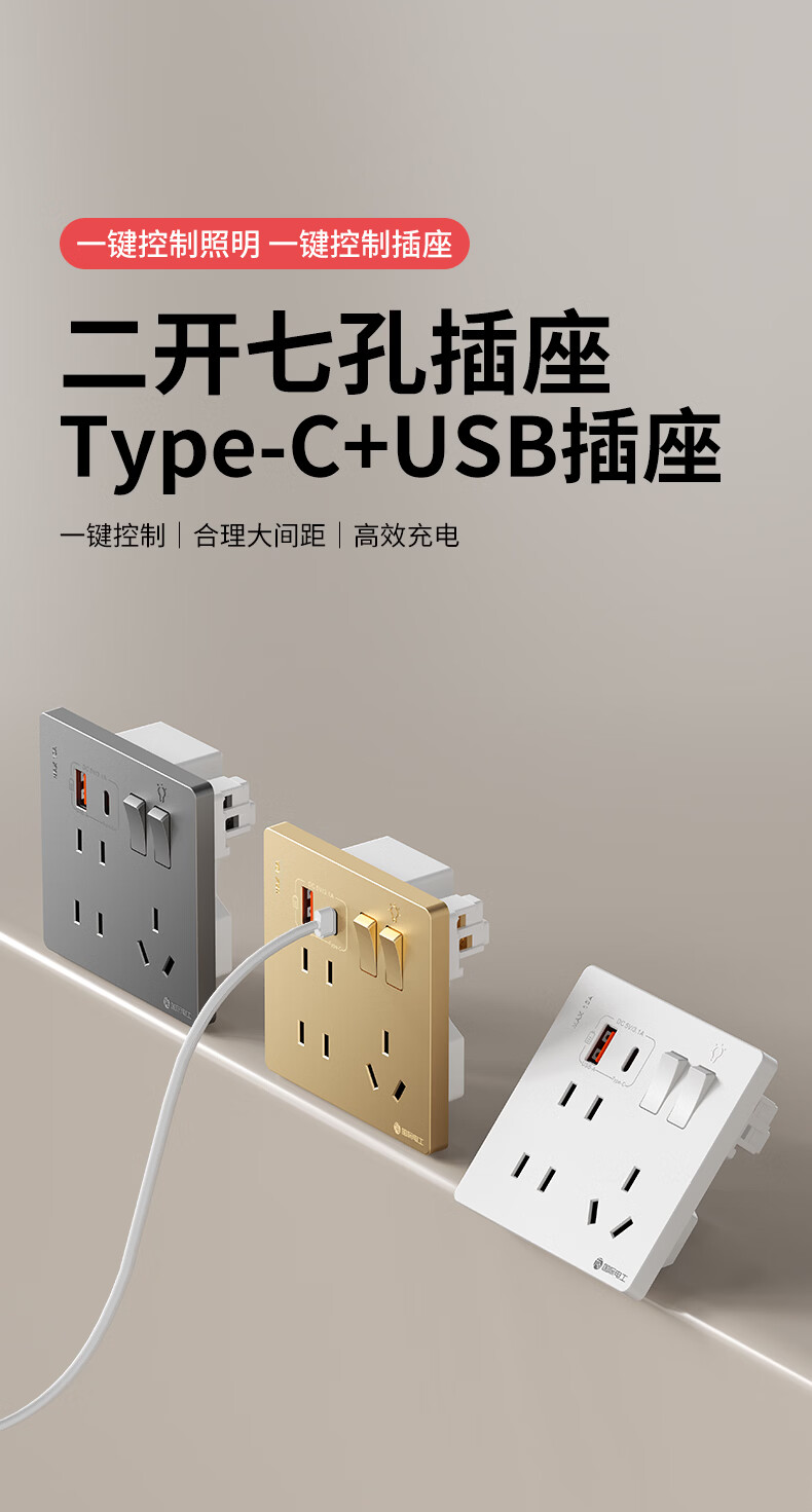 国际电工(FDD)86型二开七孔USB快充插座面板家用墙壁手机Type-c双开控制开关 二开七孔USB插座【白色】