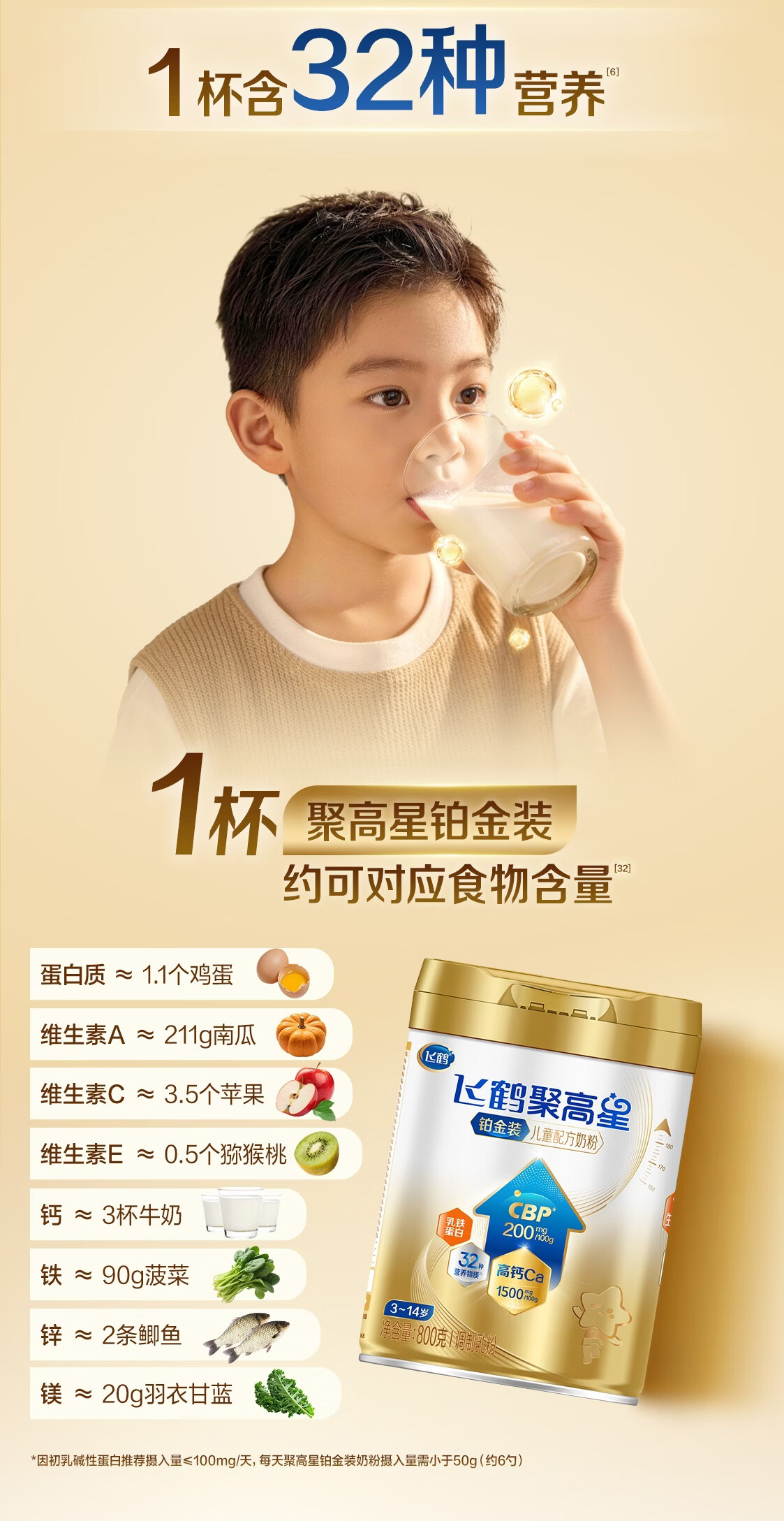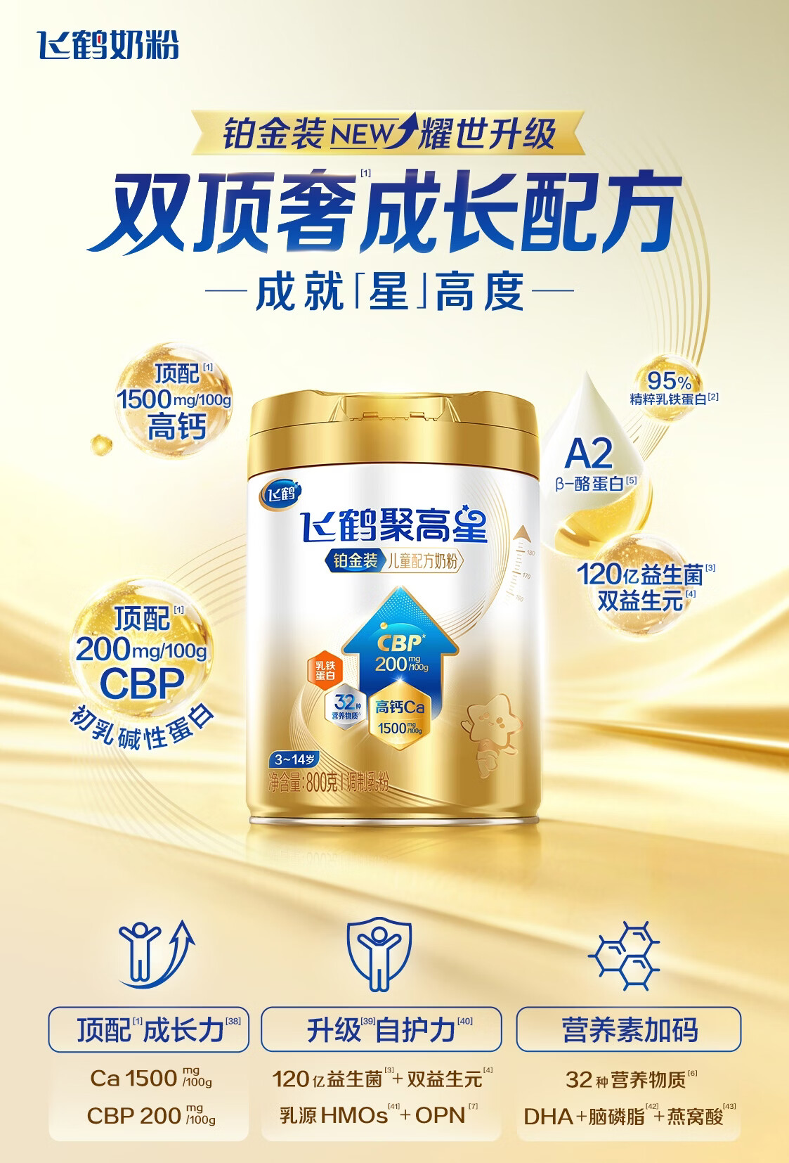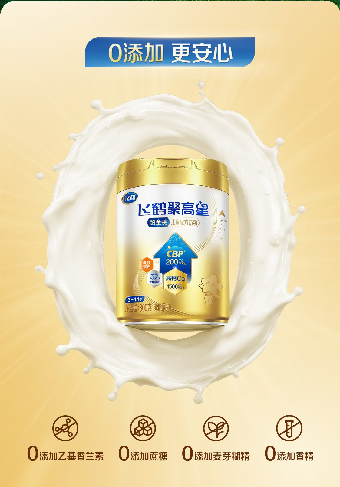 飞鹤聚高星铂金CBP骨骼发育乳铁蛋白儿童成长奶粉4段(3-14岁)800g*1罐