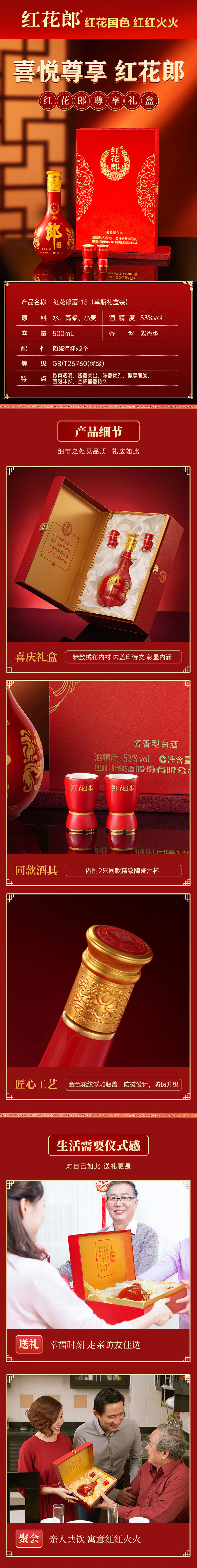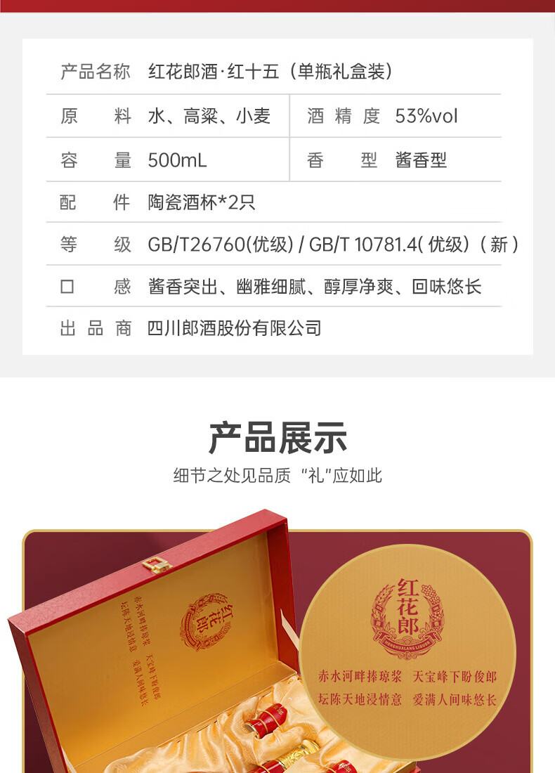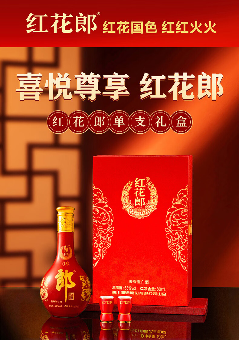 郎酒红花郎15 酱香型白酒 53度 500ml*1瓶*2盒 礼盒装 年货礼盒