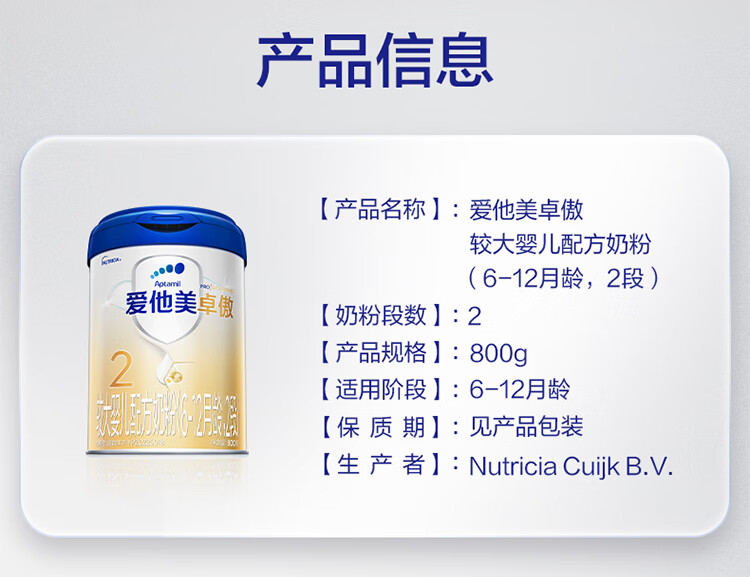 爱他美(Aptamil)卓傲较大婴儿配方奶粉2段(6—12月龄)800g*6罐 爱他美卓傲