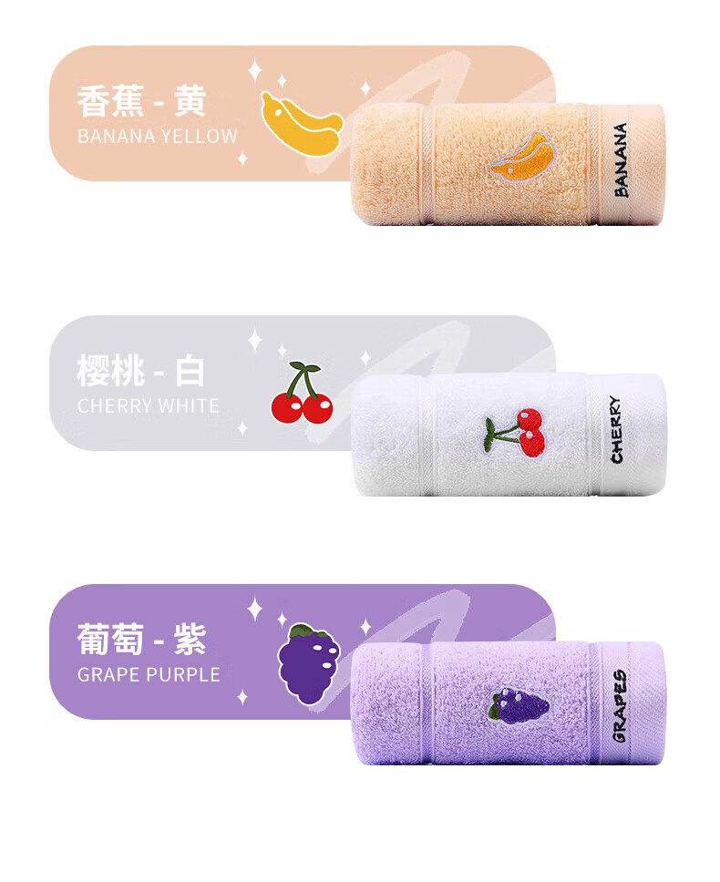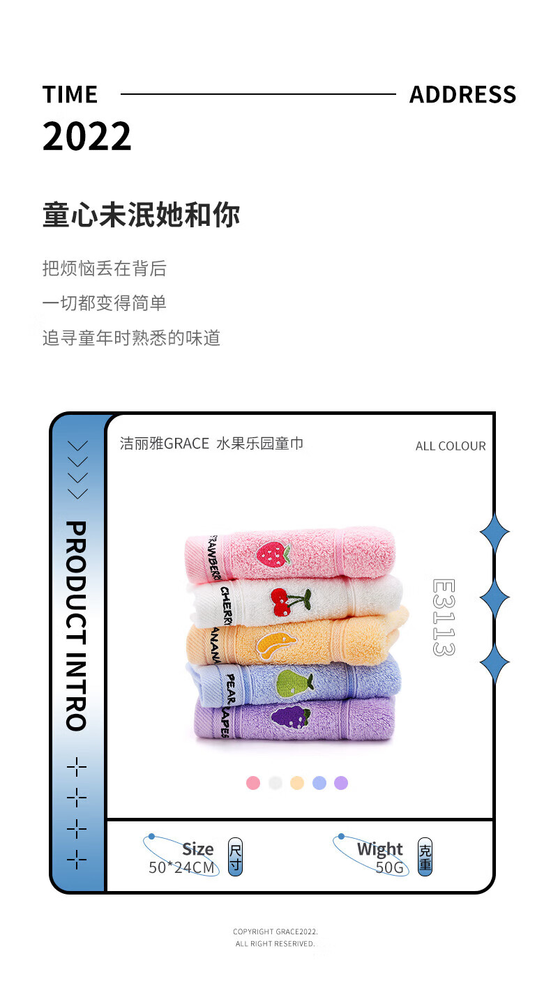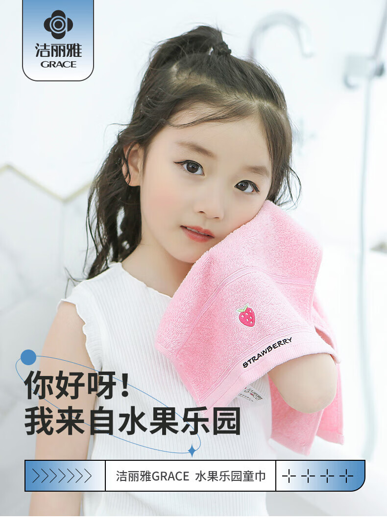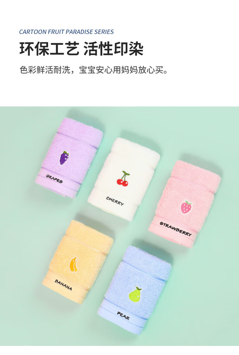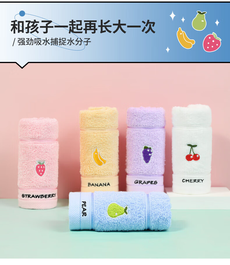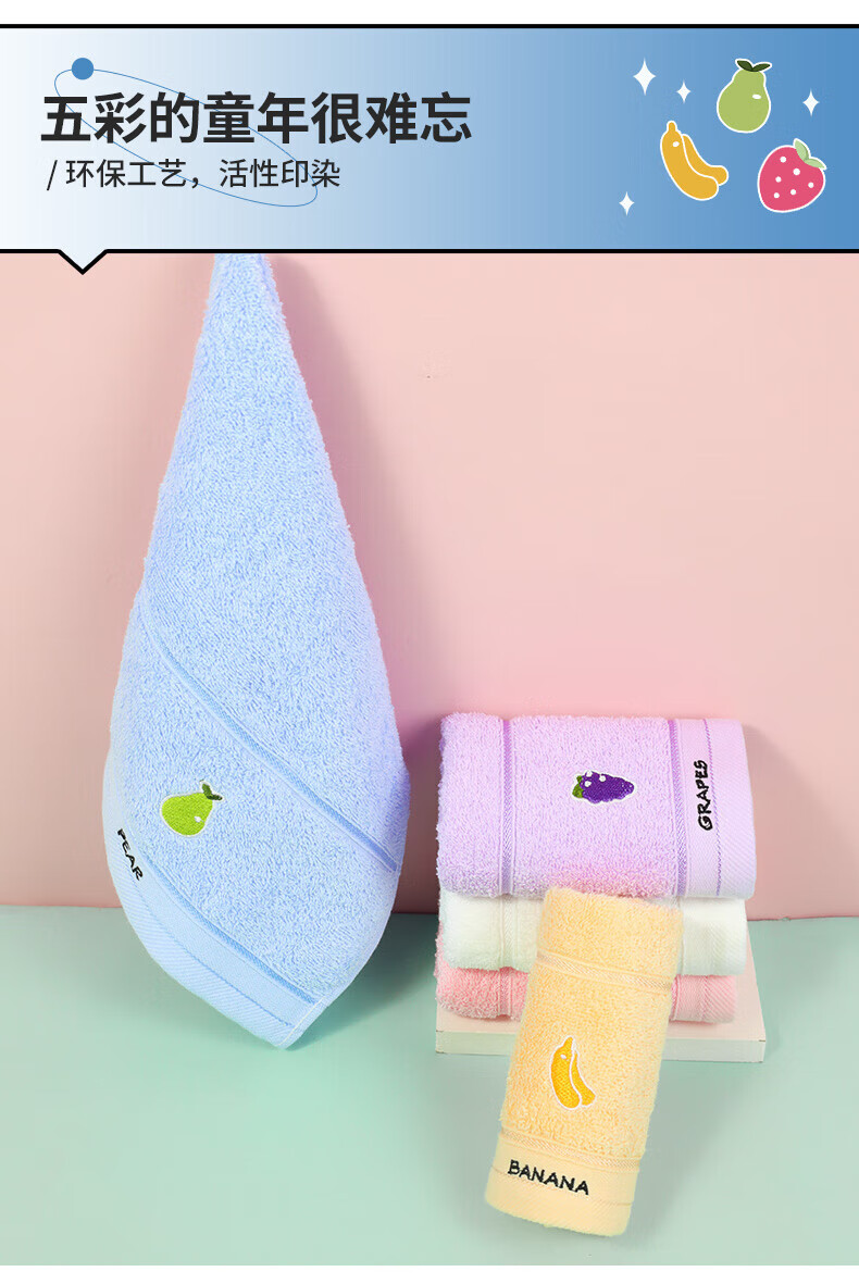 洁丽雅(grace)4条装A类儿童毛巾纯棉卡通吸水毛巾洗脸面巾中巾口水巾 【水果系列 黄蓝红紫】4条装