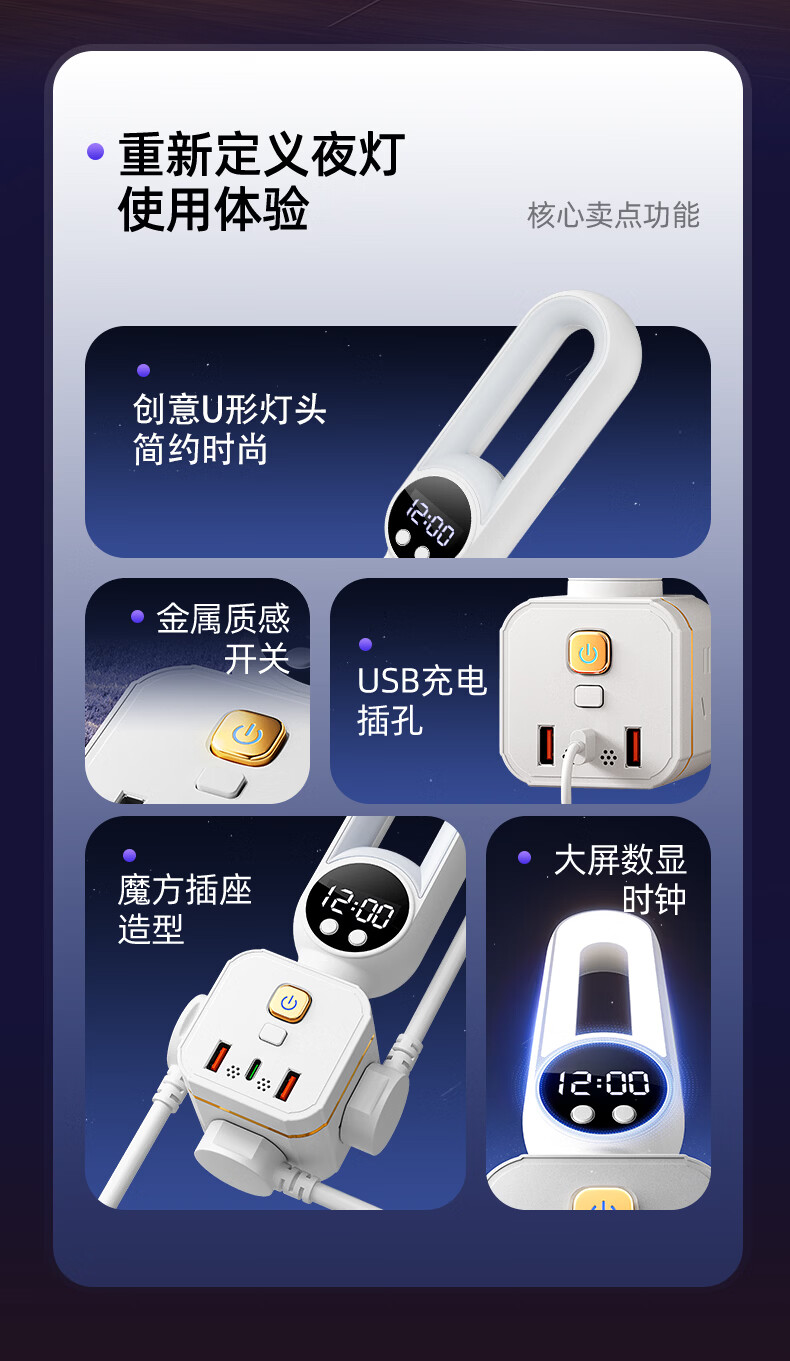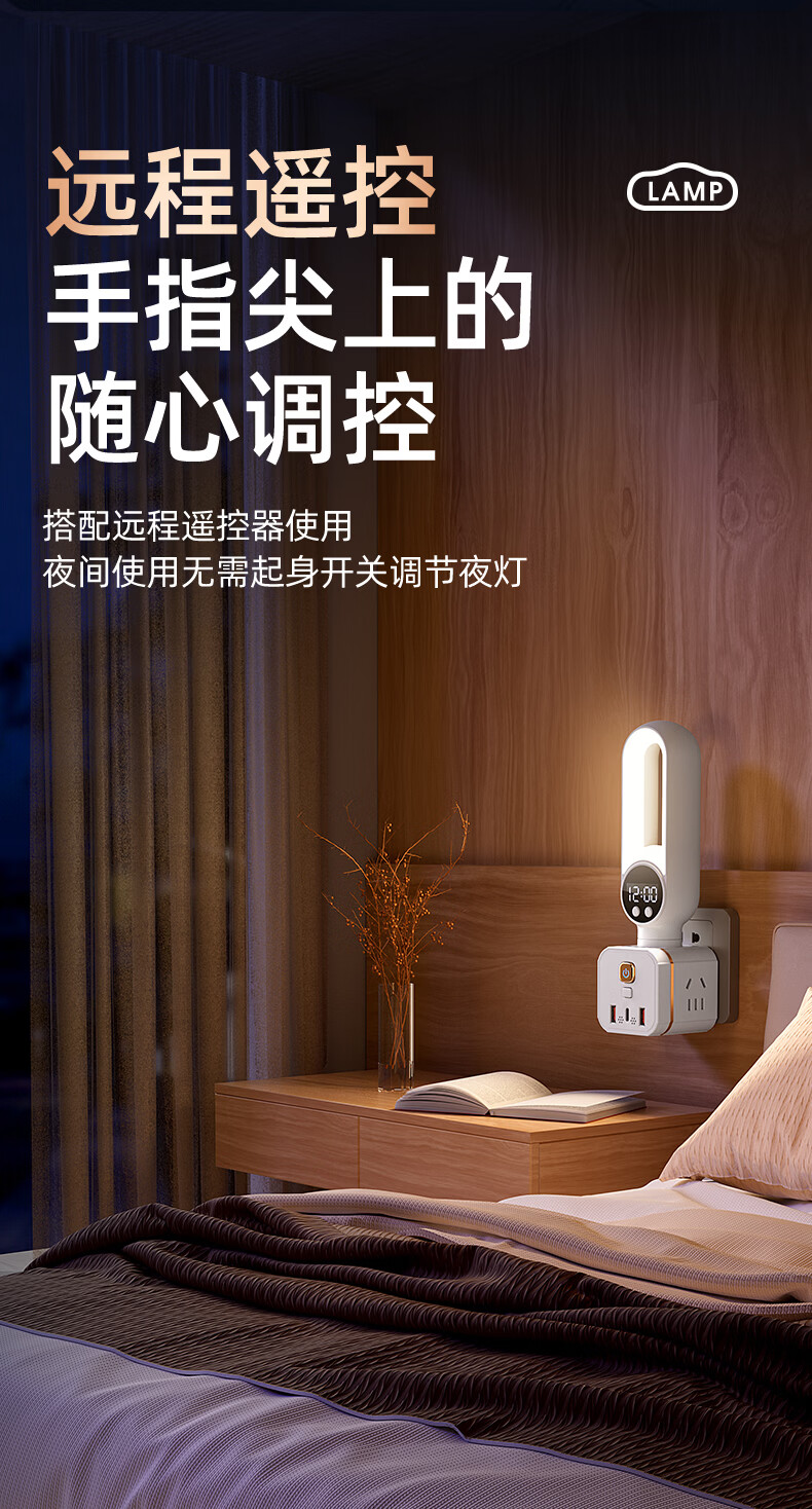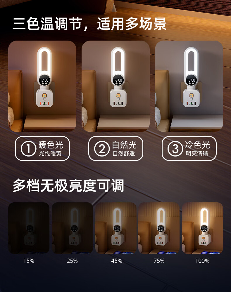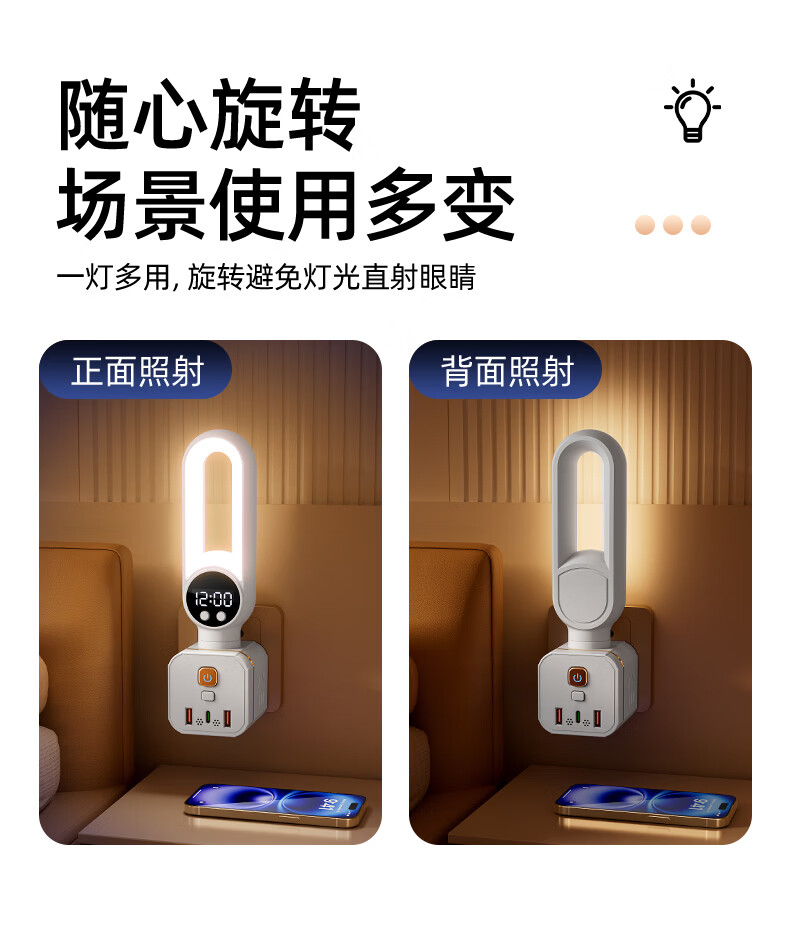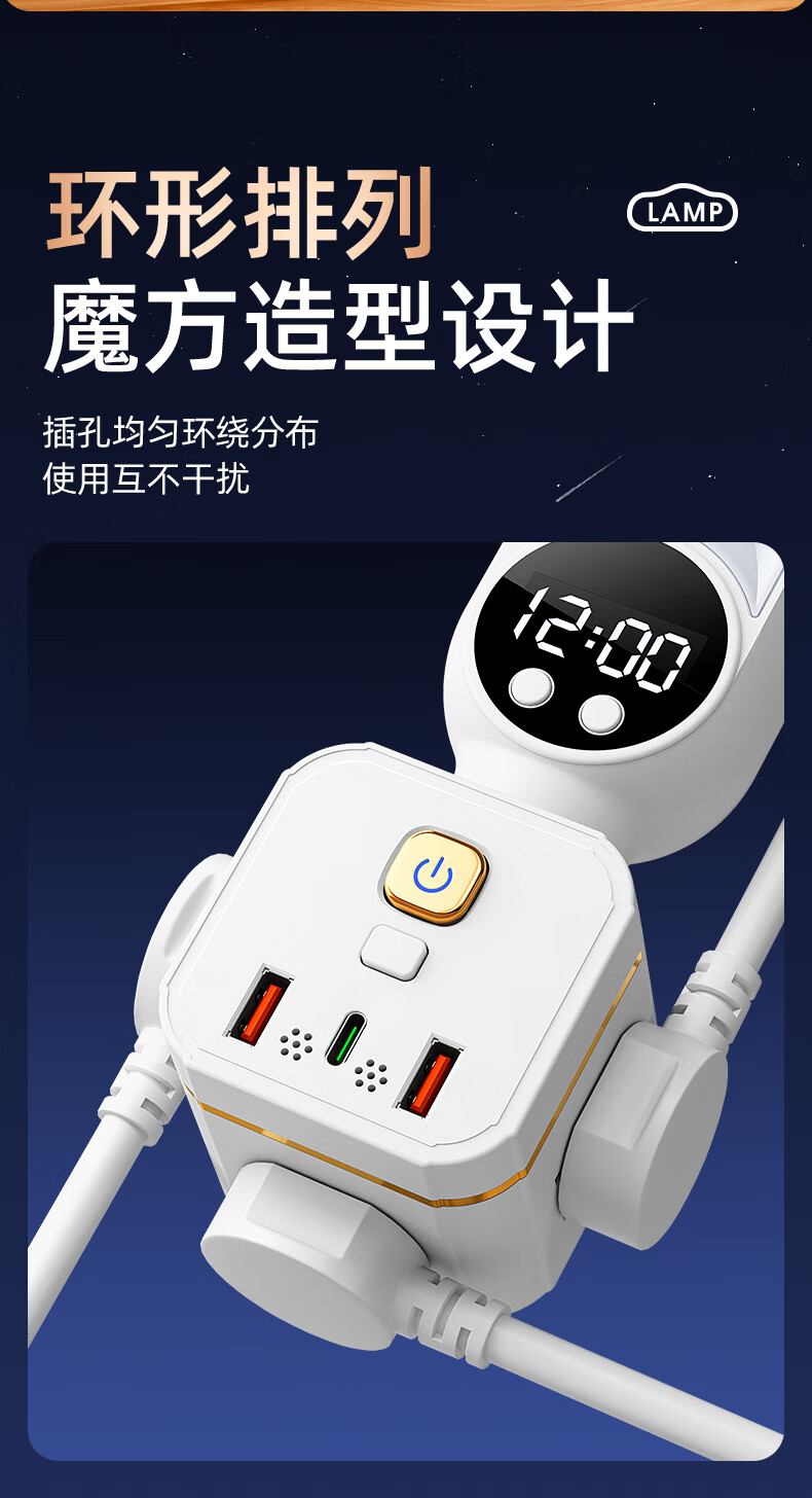苏士赫尔摩 一件包邮【三色温 + 350° 旋转小夜灯】无线魔方插座转换器 三档调色小夜灯 卧室床头一转多插排 魔方夜灯语音款+时显+遥控 3位2U1C