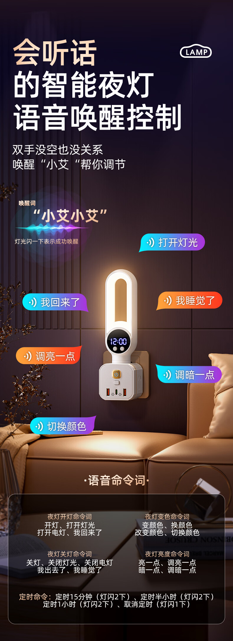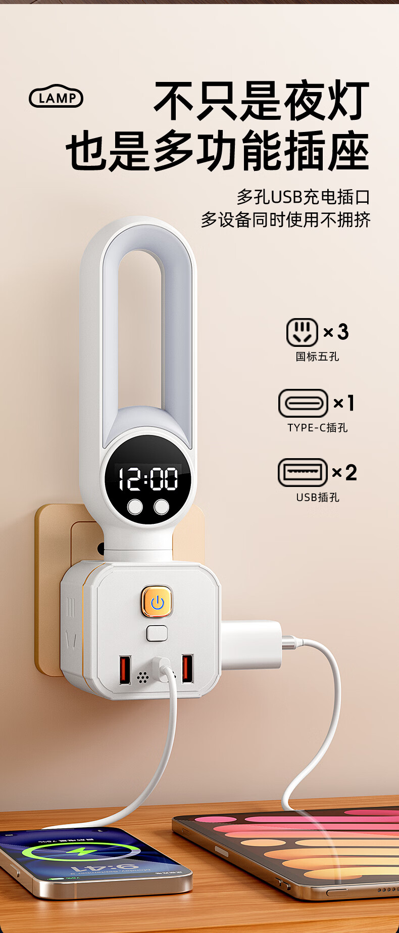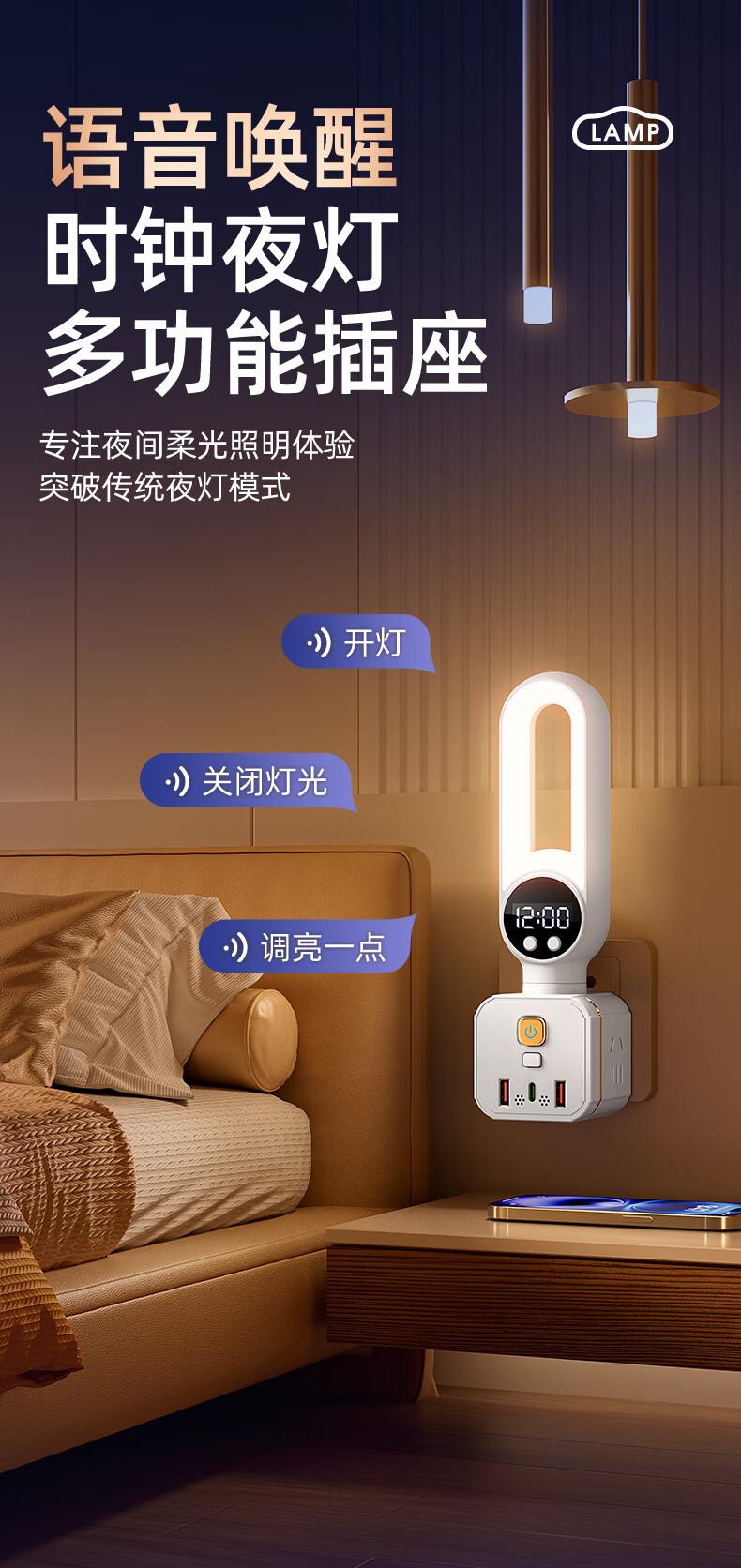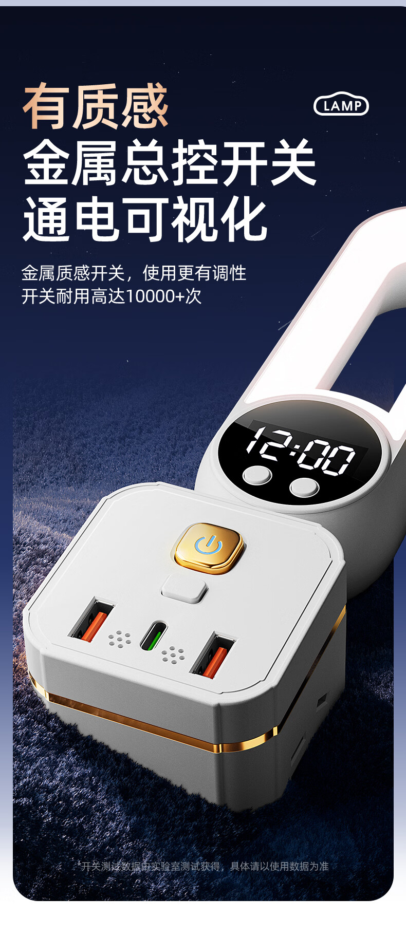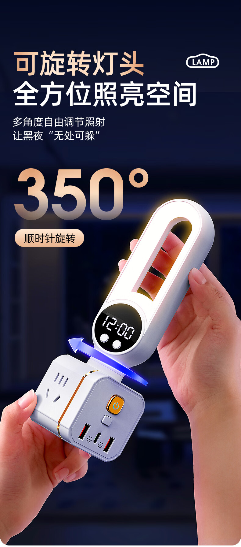 苏士赫尔摩 一件包邮【三色温 + 350° 旋转小夜灯】无线魔方插座转换器 三档调色小夜灯 卧室床头一转多插排 魔方夜灯语音款+时显+遥控 3位2U1C