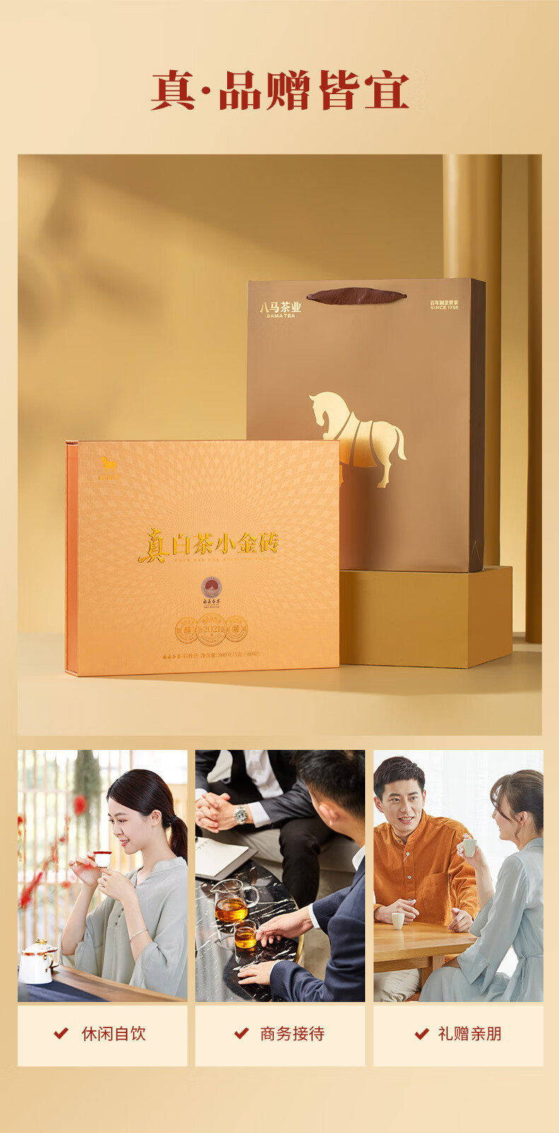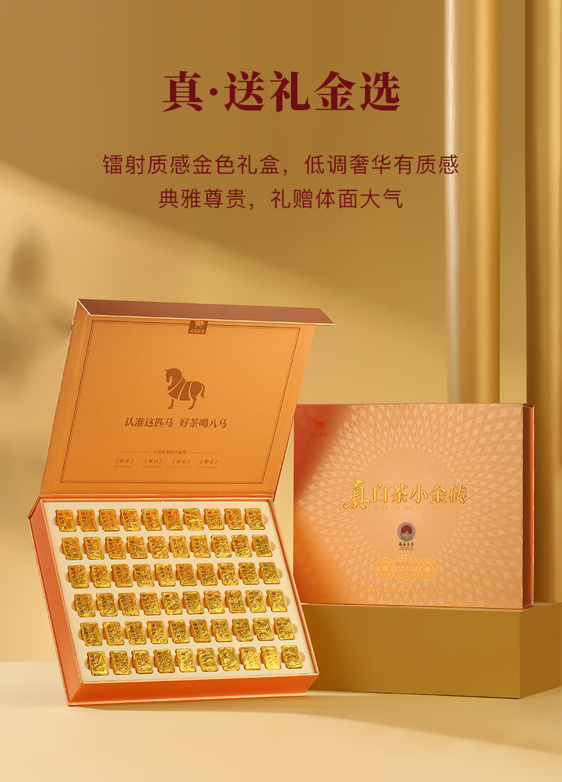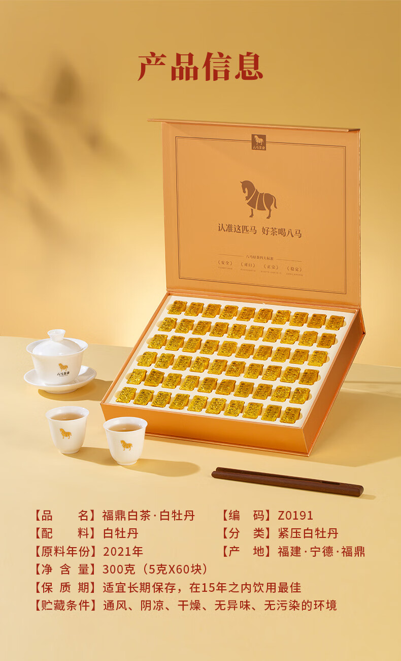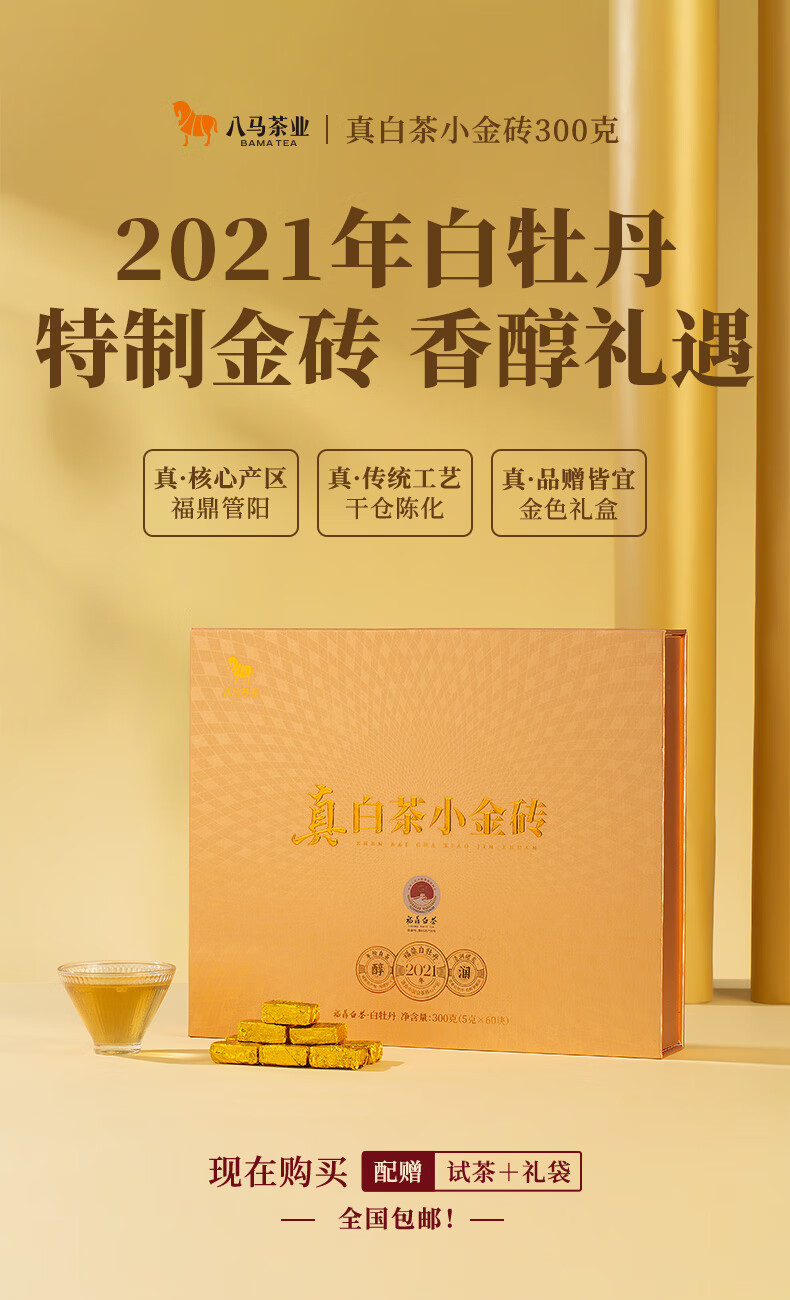 八马茶业 福鼎白茶 白牡丹 小金砖 2021年原料 送礼茶叶 礼盒装 300g(5克*60颗)