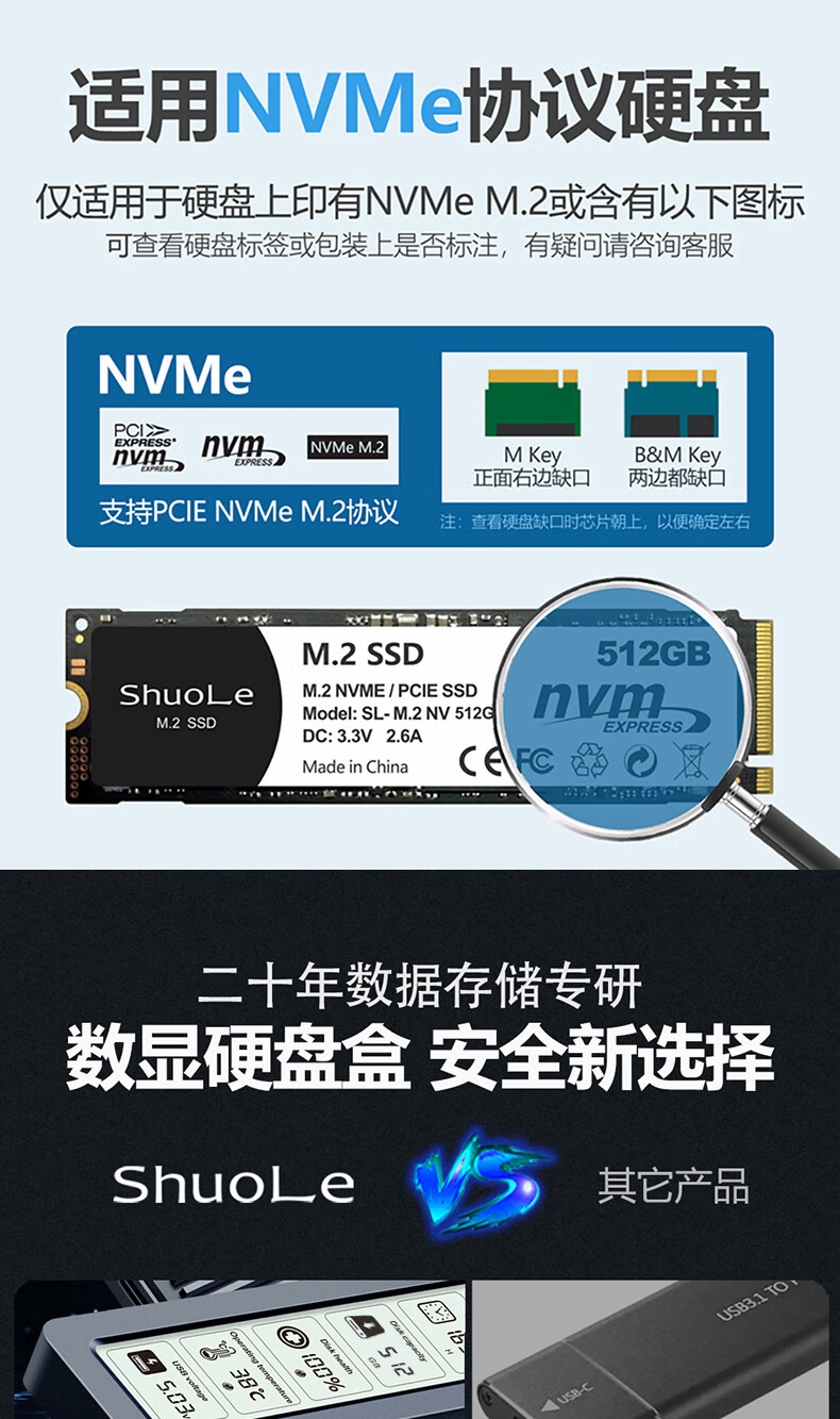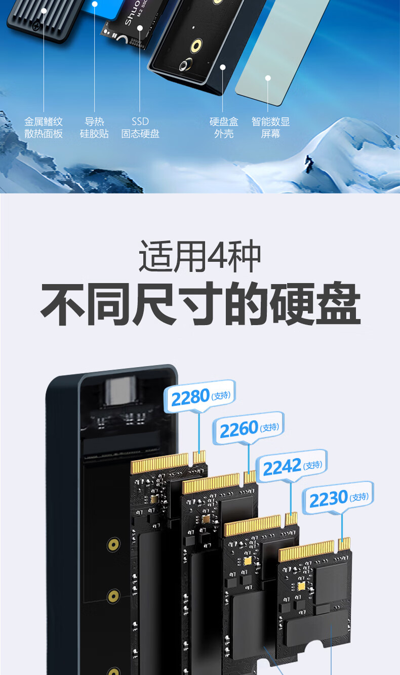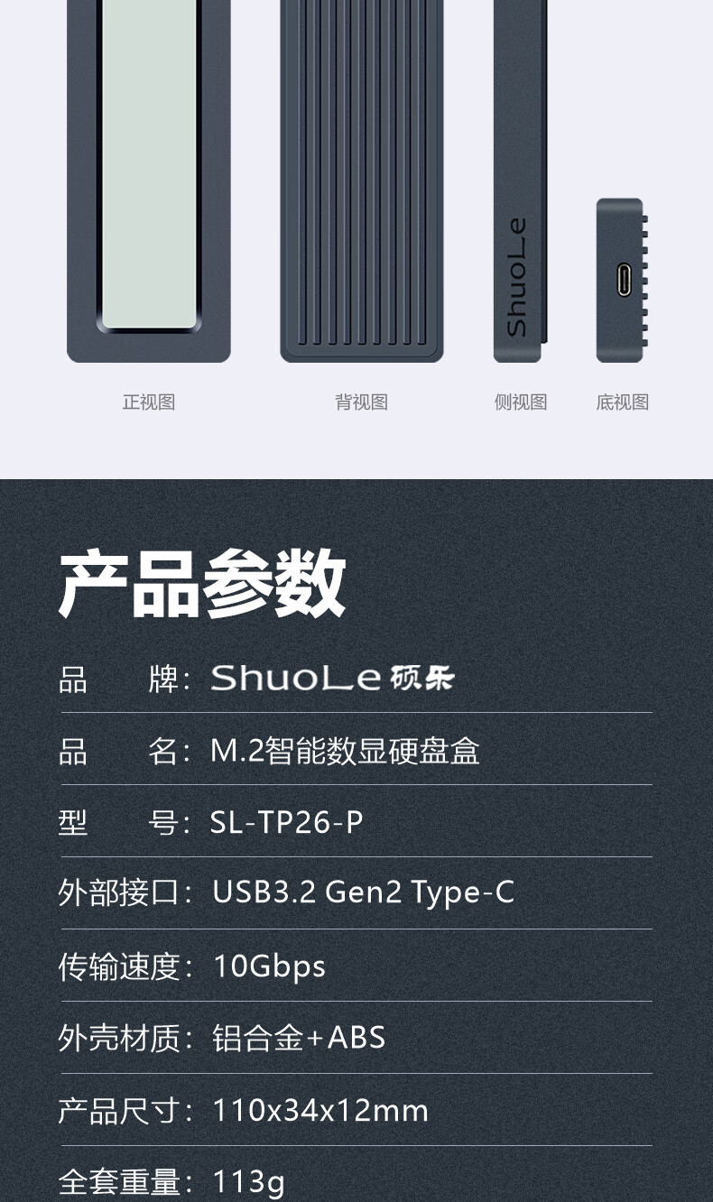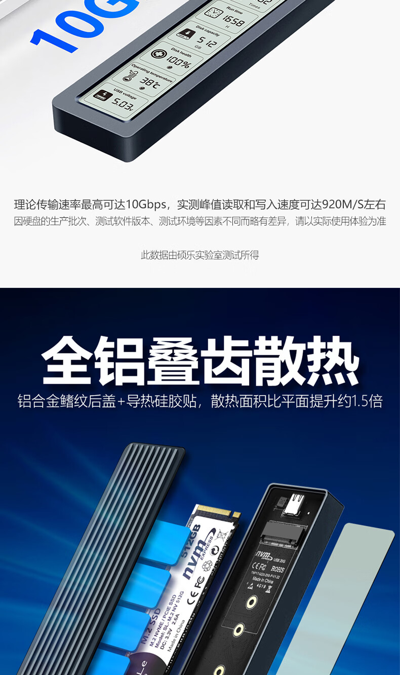 硕乐智能数显m.2固态SSD硬盘盒m2笔记本NVME协议SATA转接 单NVME协议10Gbps+双数据线