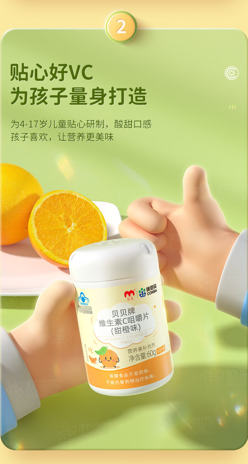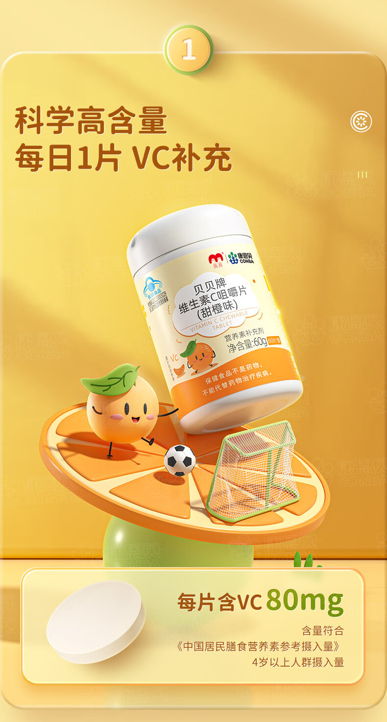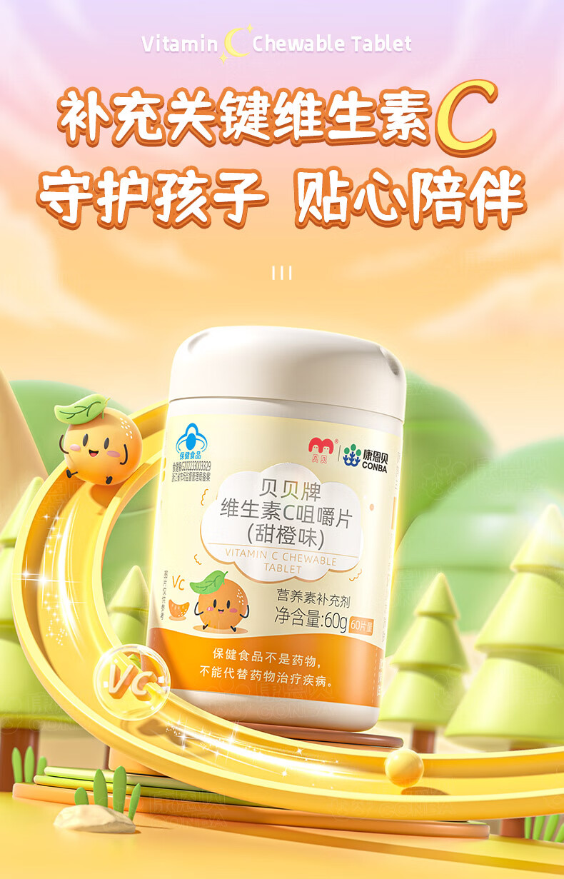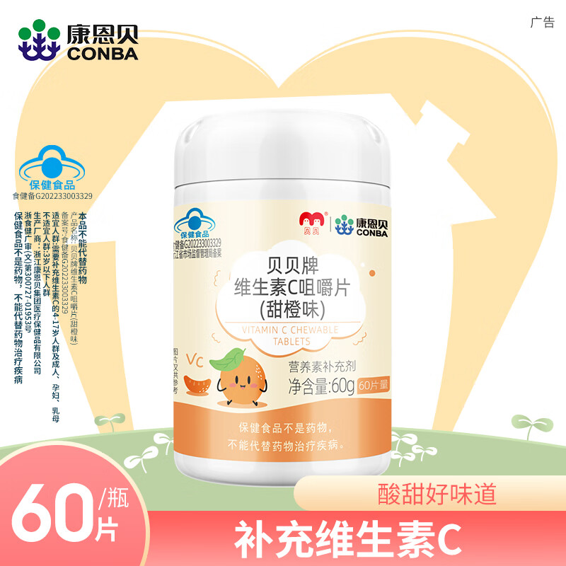 康恩贝维生素c咀嚼片60片维cvc片咀嚼片儿童学生4岁-17岁及成人孕妇乳母