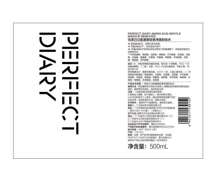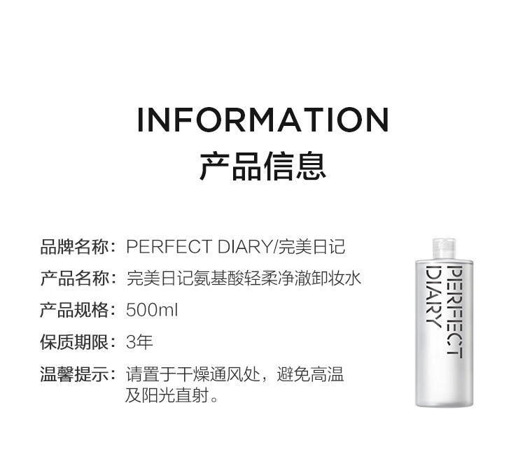 完美日记氨基酸轻柔净澈卸妆水500ml清洁眼唇卸温和新年礼物送女生