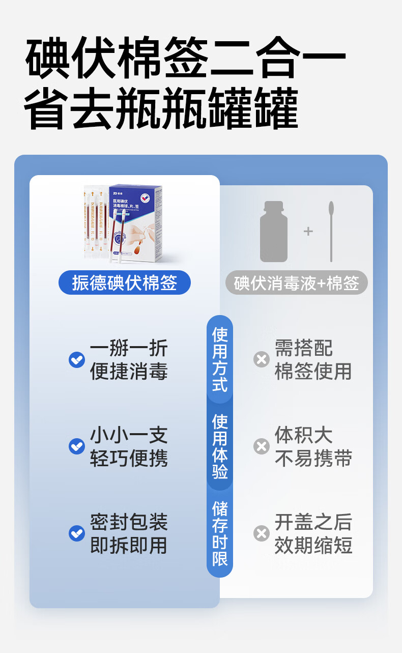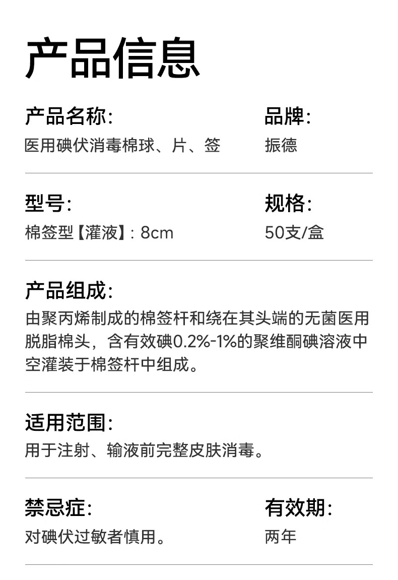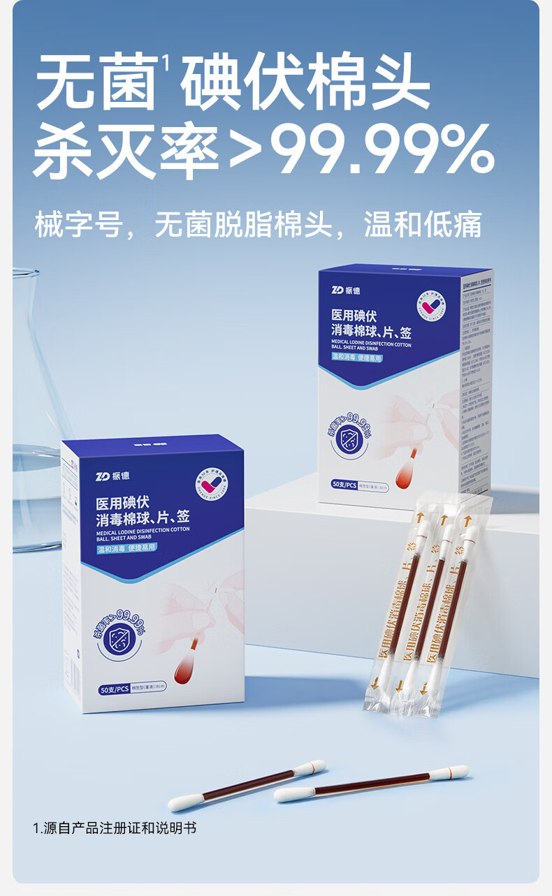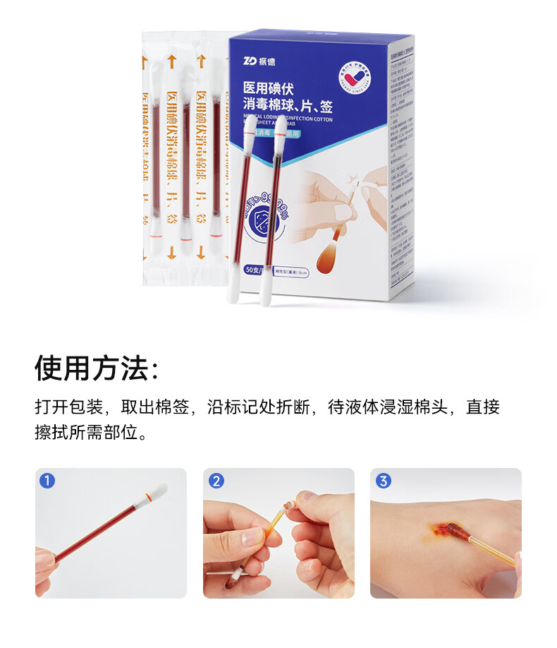 振德医用碘伏消毒液棉签50支 独立装碘伏棉棒伤口清洁棉棒成人婴儿