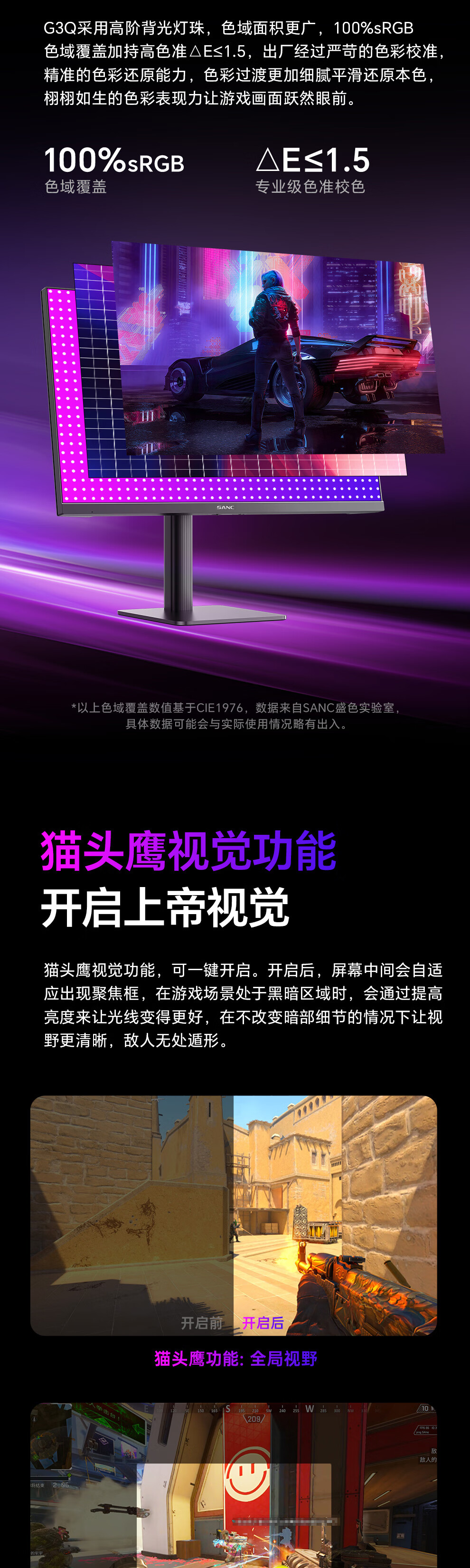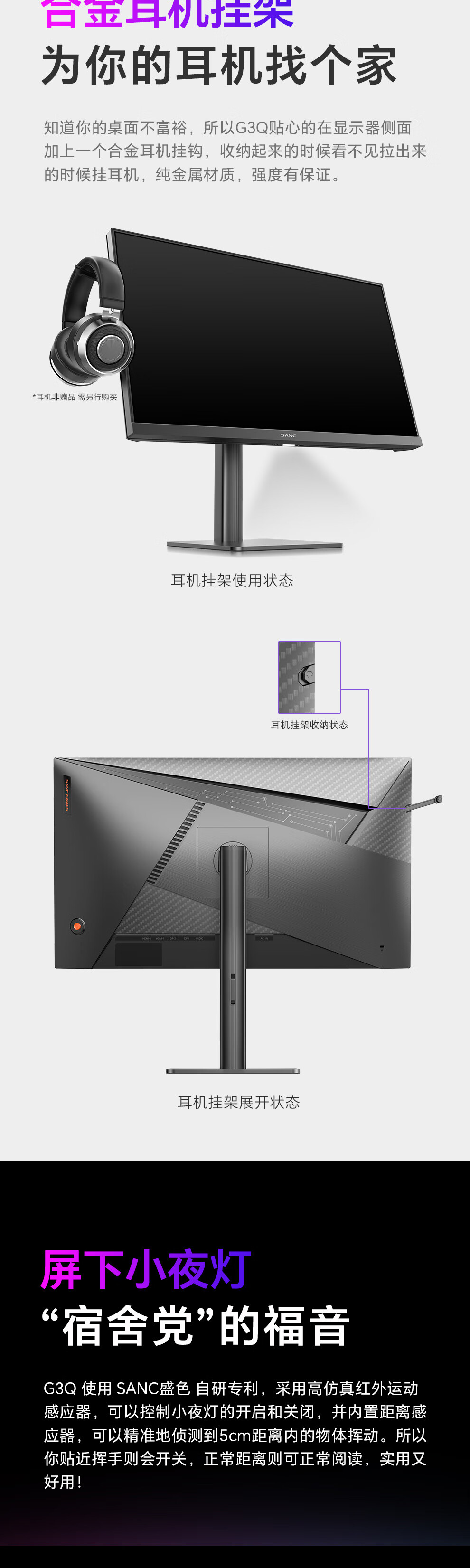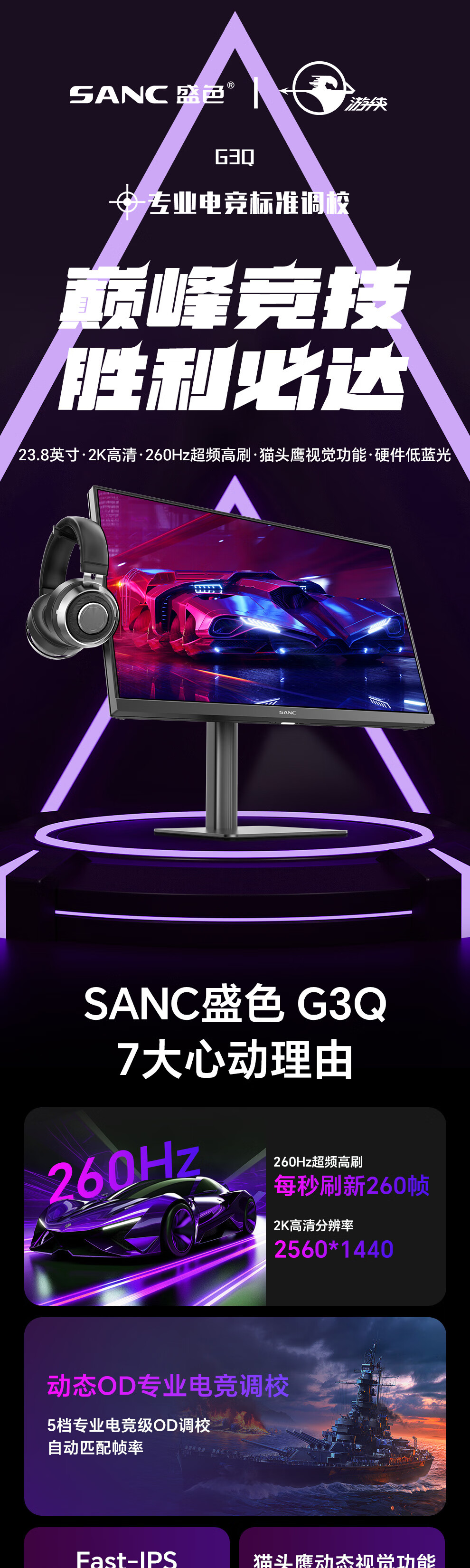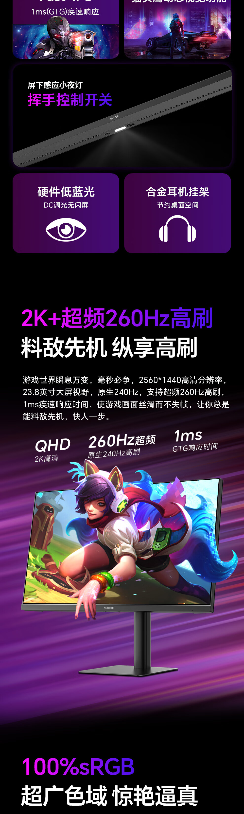 SANC盛色23.8英寸2K超频260Hz FastIPS显示器1ms 硬件低蓝光 耳机挂架小夜灯 升降支架电竞电脑屏幕G3Q