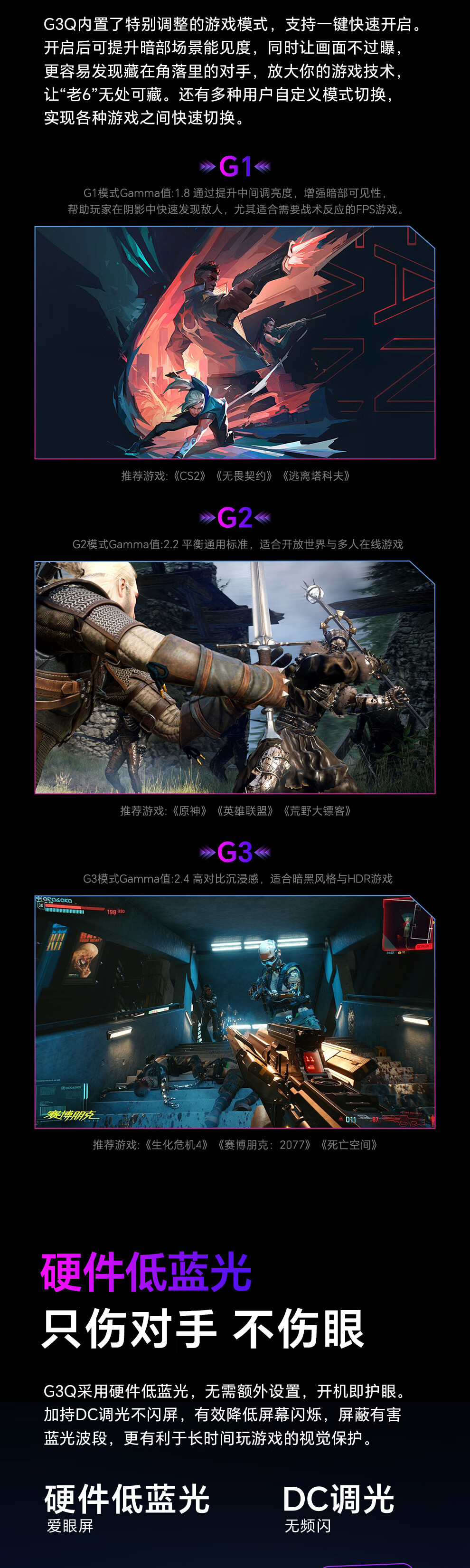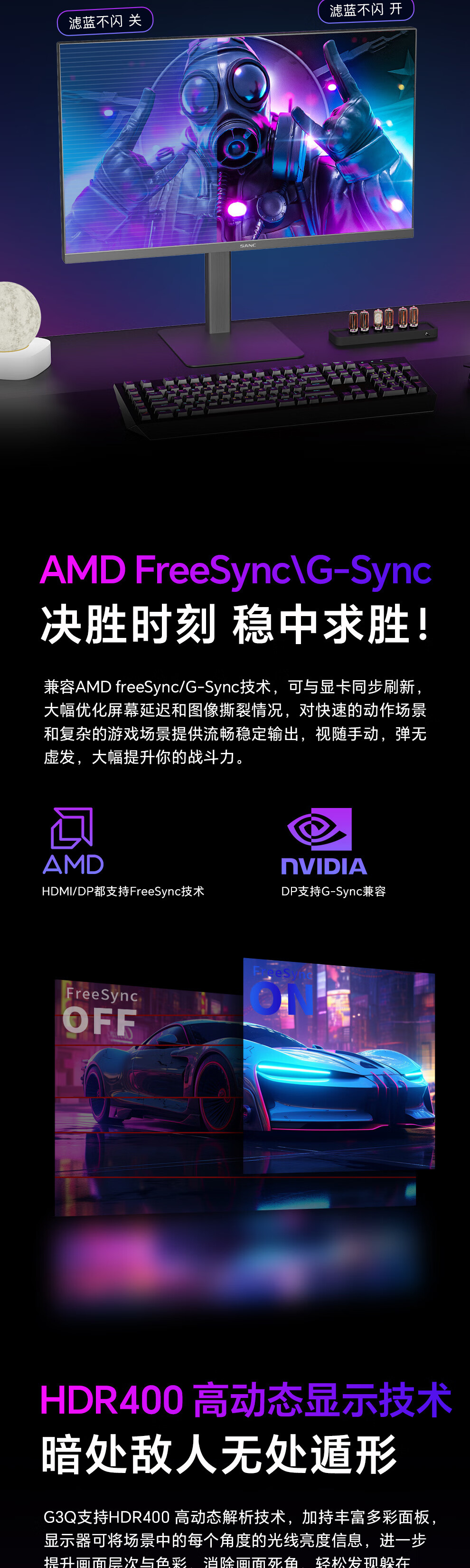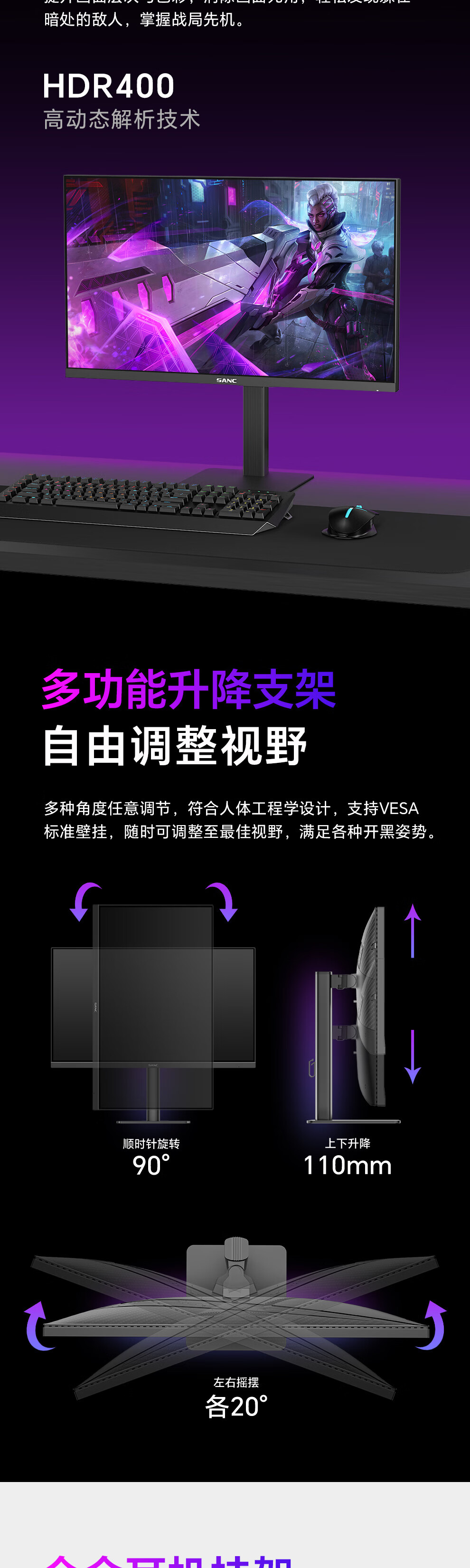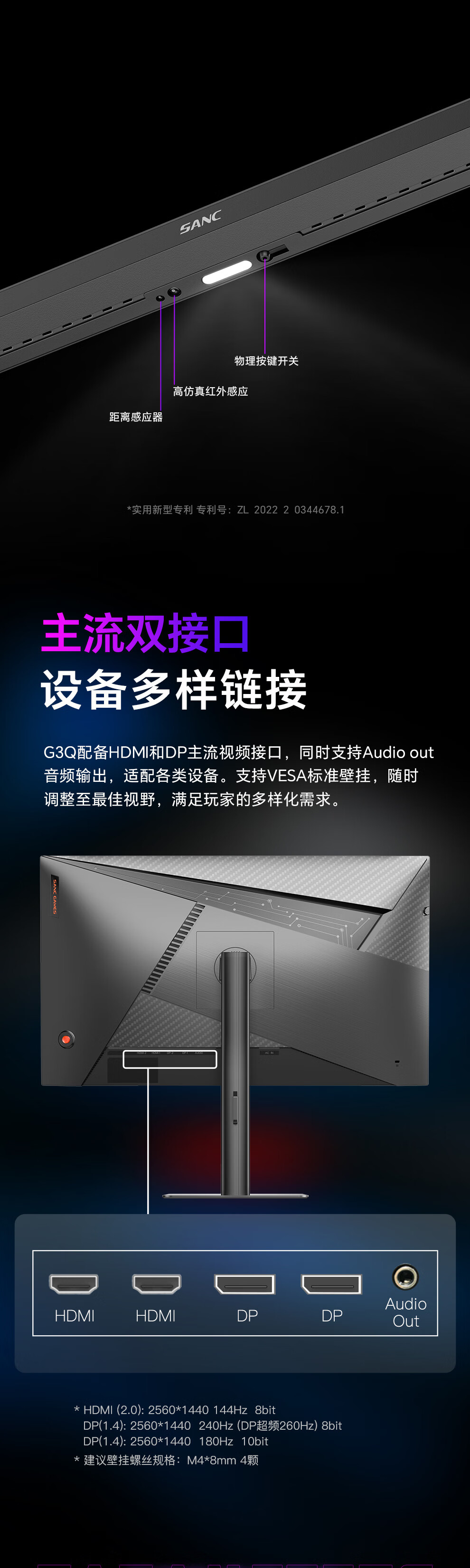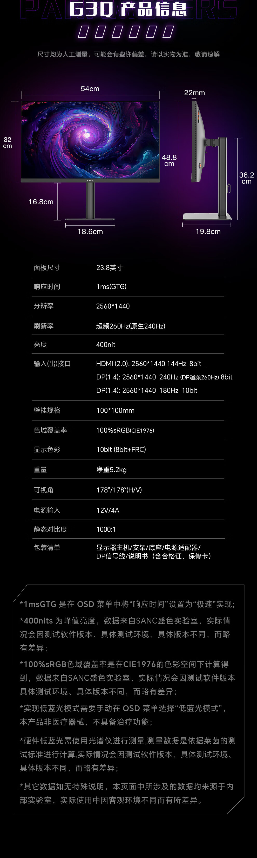 SANC盛色23.8英寸2K超频260Hz FastIPS显示器1ms 硬件低蓝光 耳机挂架小夜灯 升降支架电竞电脑屏幕G3Q