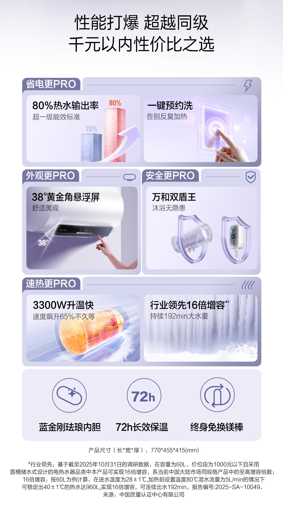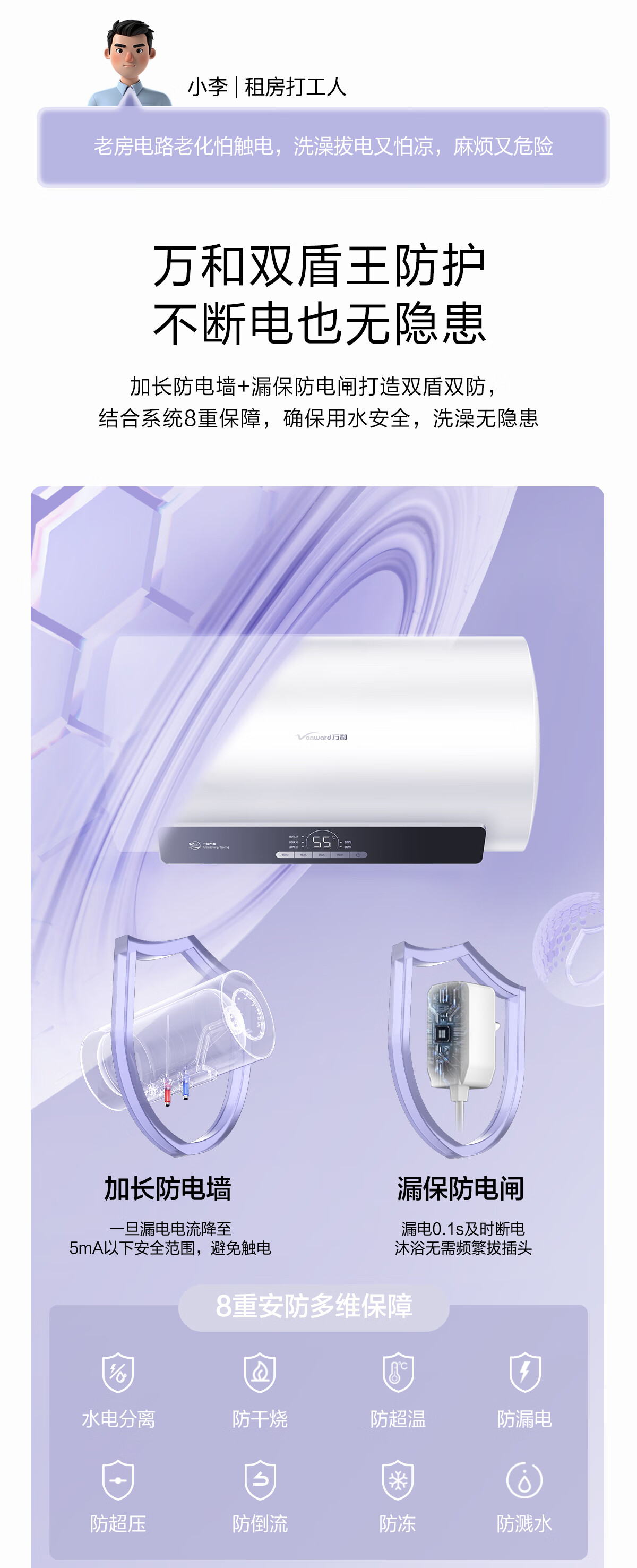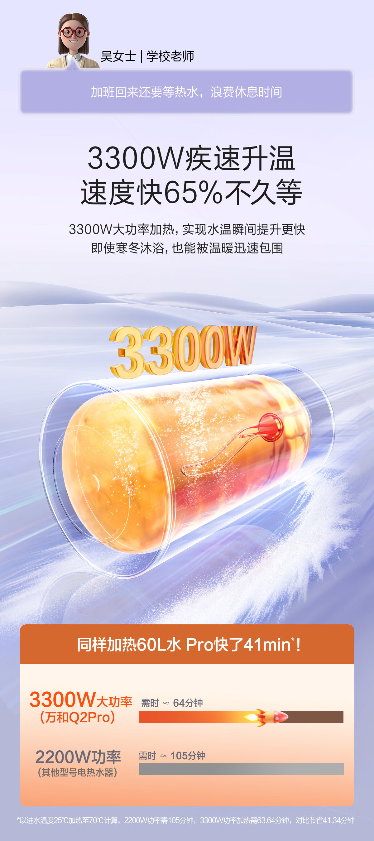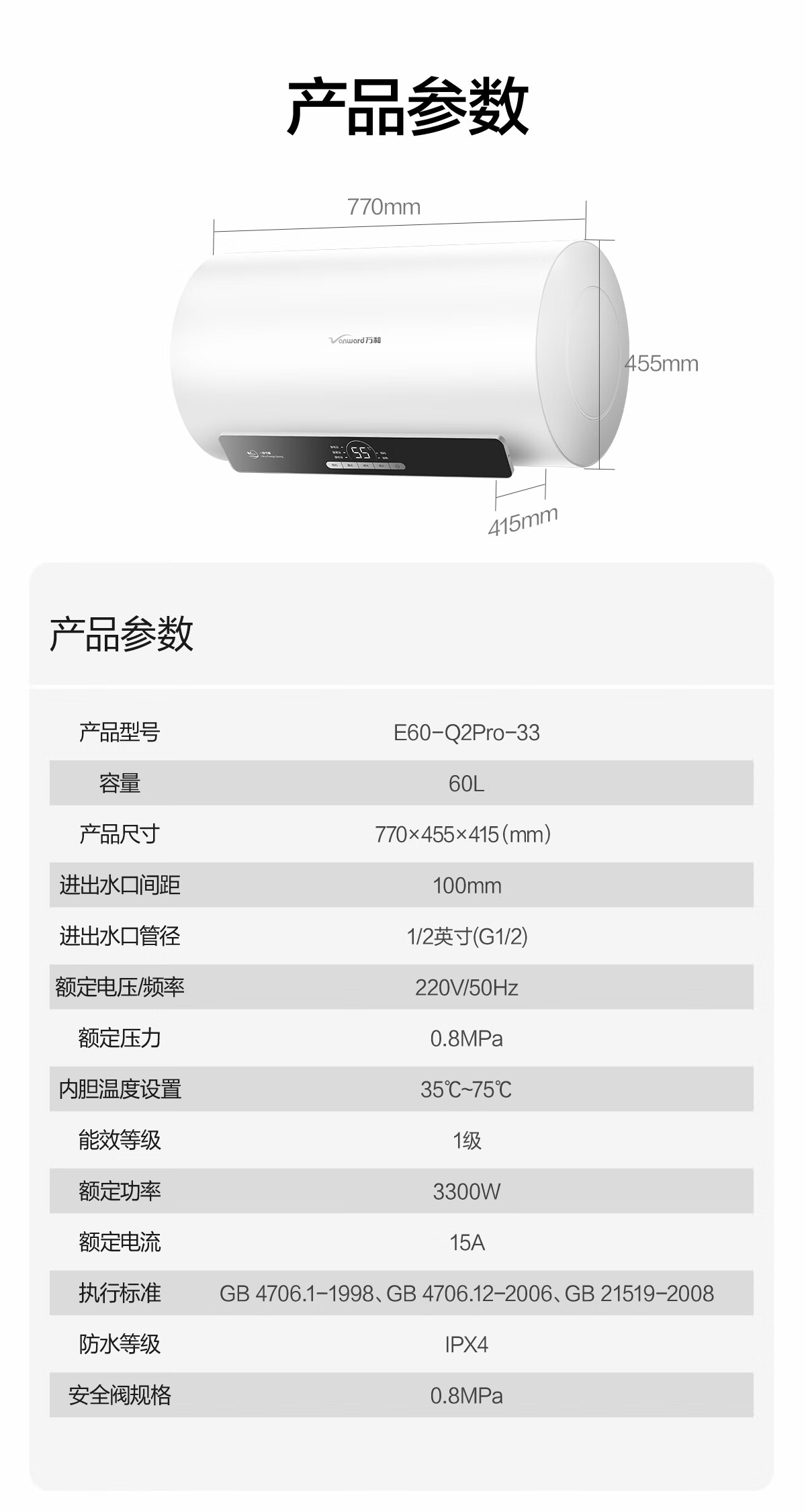 万和【节能星Q2Pro】60升3300W速热超一级能效约一吨出水量水电分离终身免换镁棒电热水器国家补贴15%
