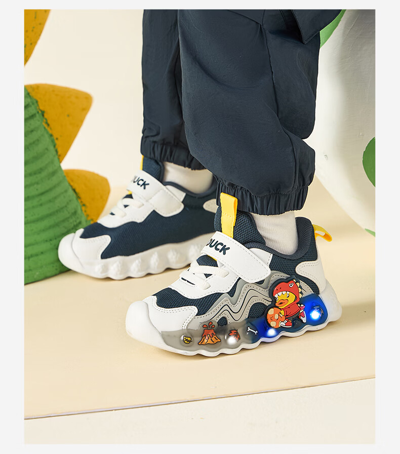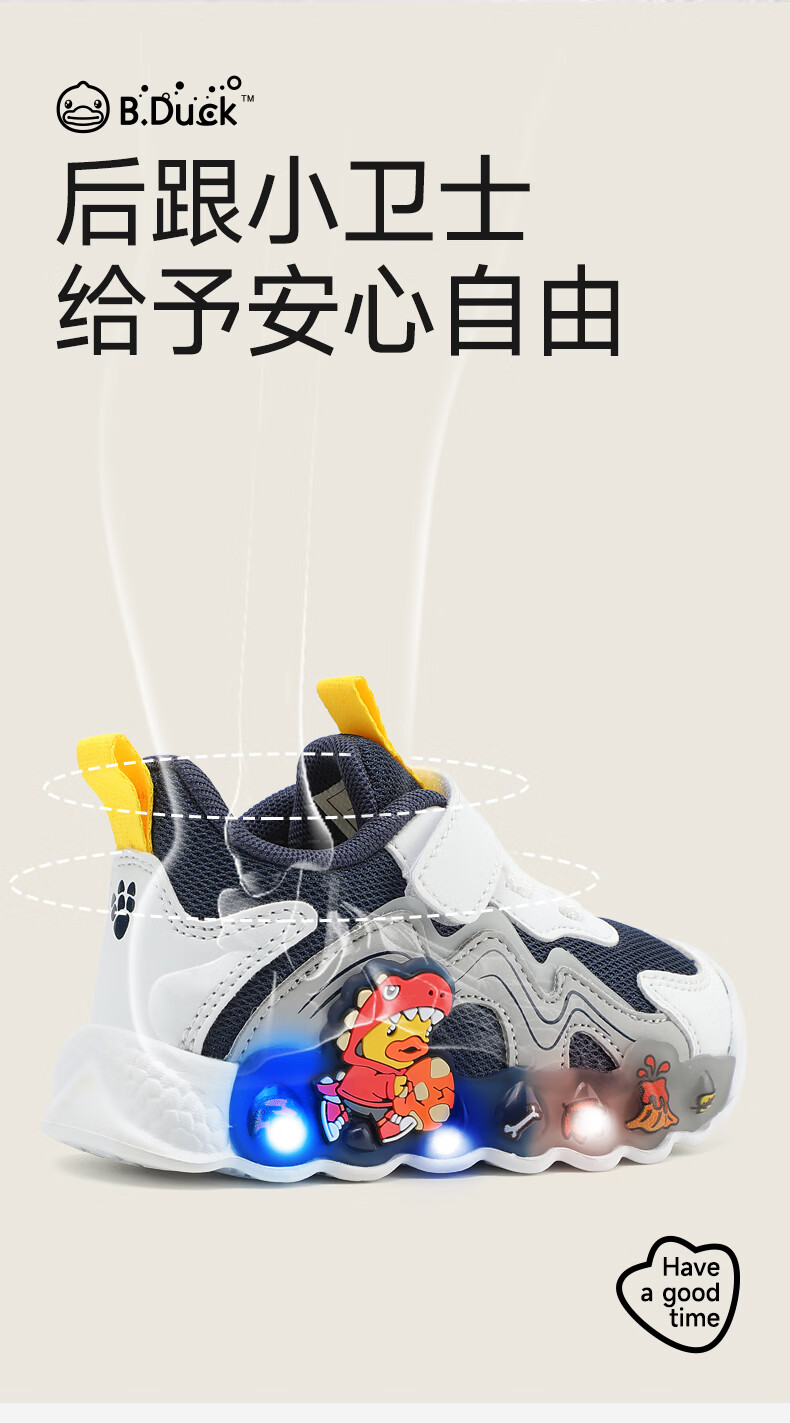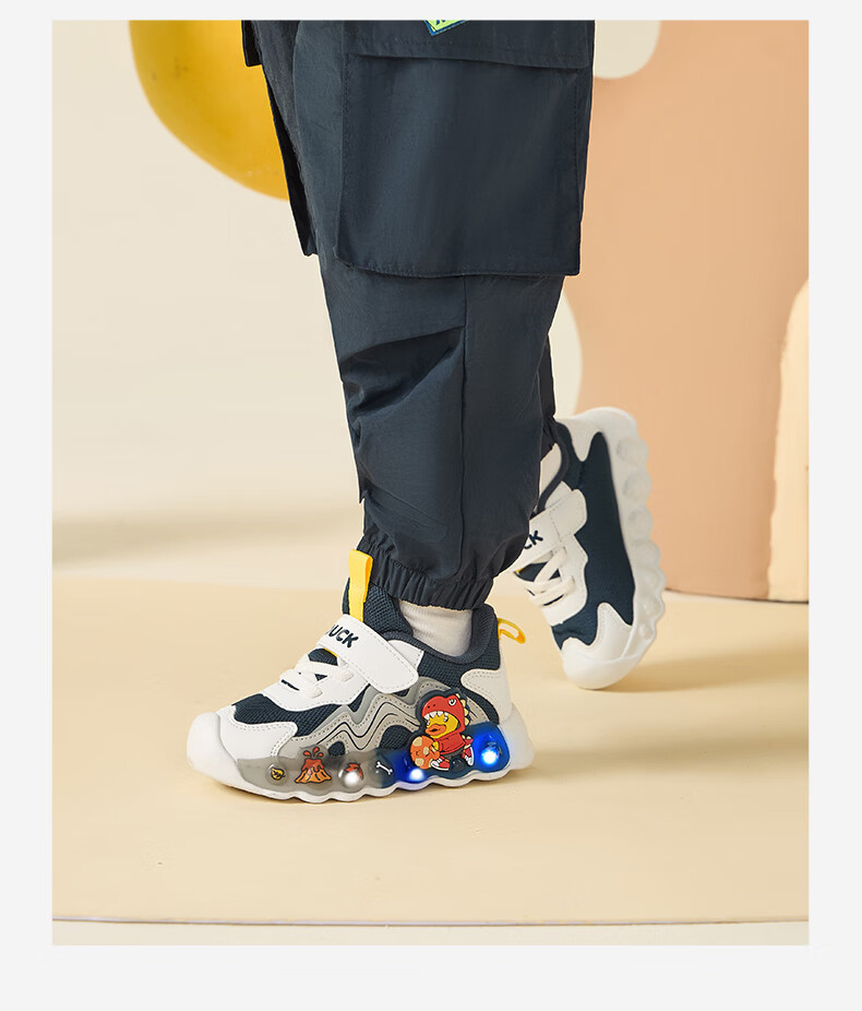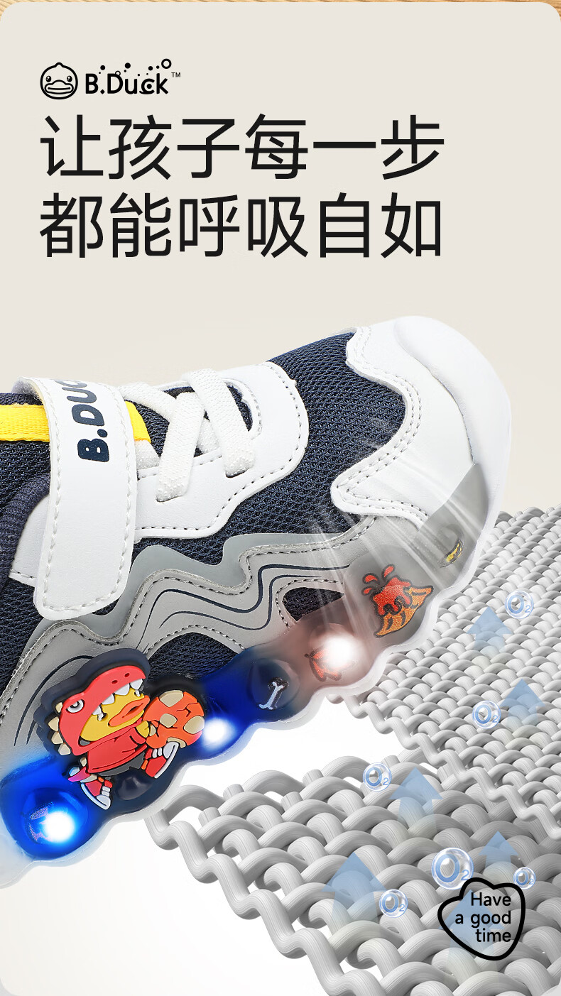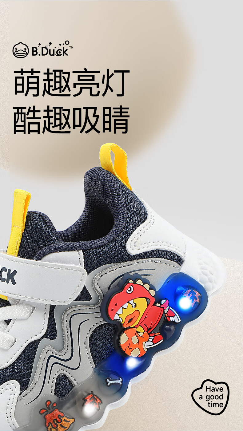 B.Duck小黄鸭童鞋男童春秋季新款亮灯儿童运动鞋女童网面透气灯鞋跑步鞋 黑米绿 22 码脚长12.7-13.2cm