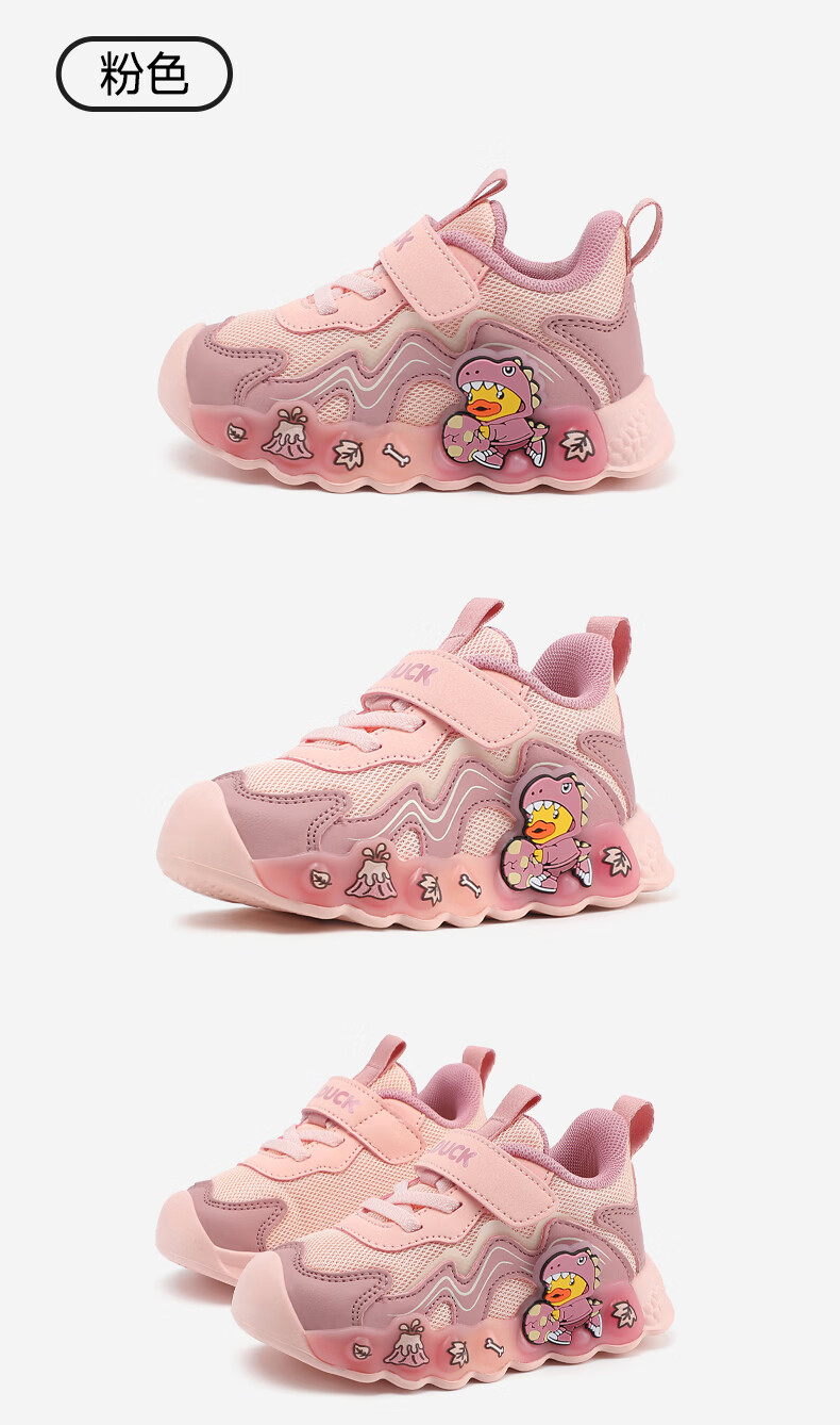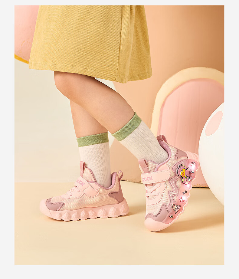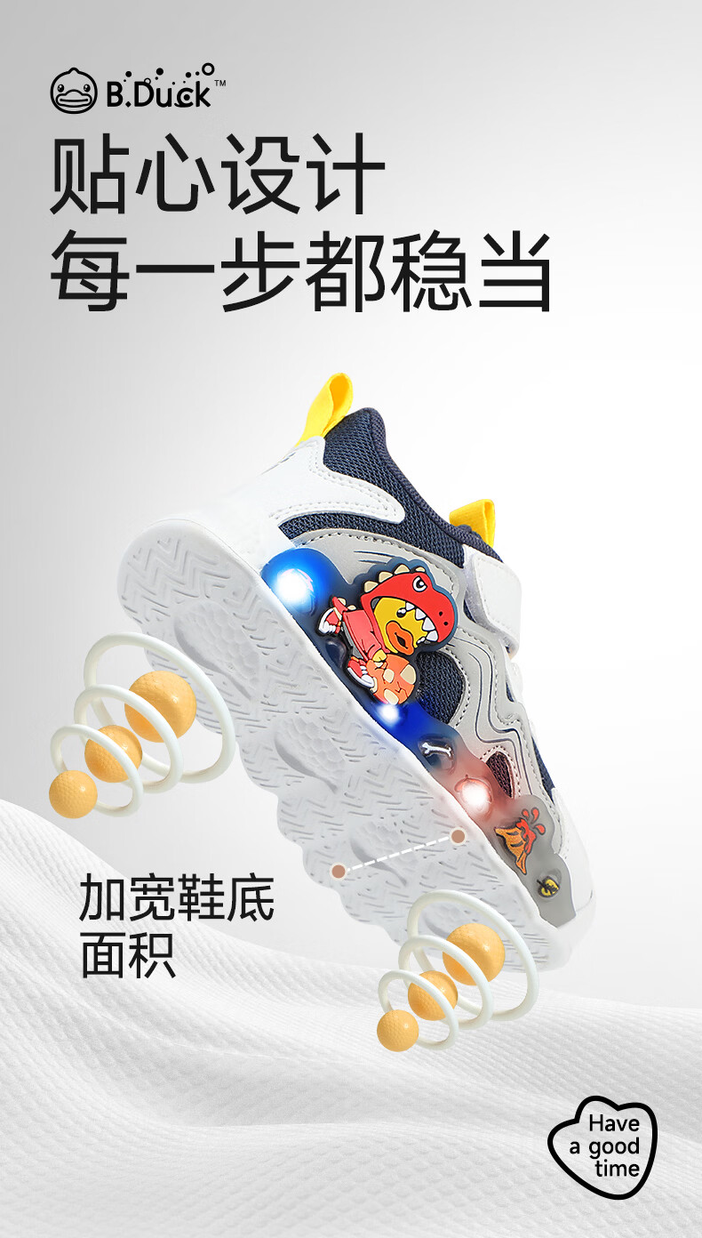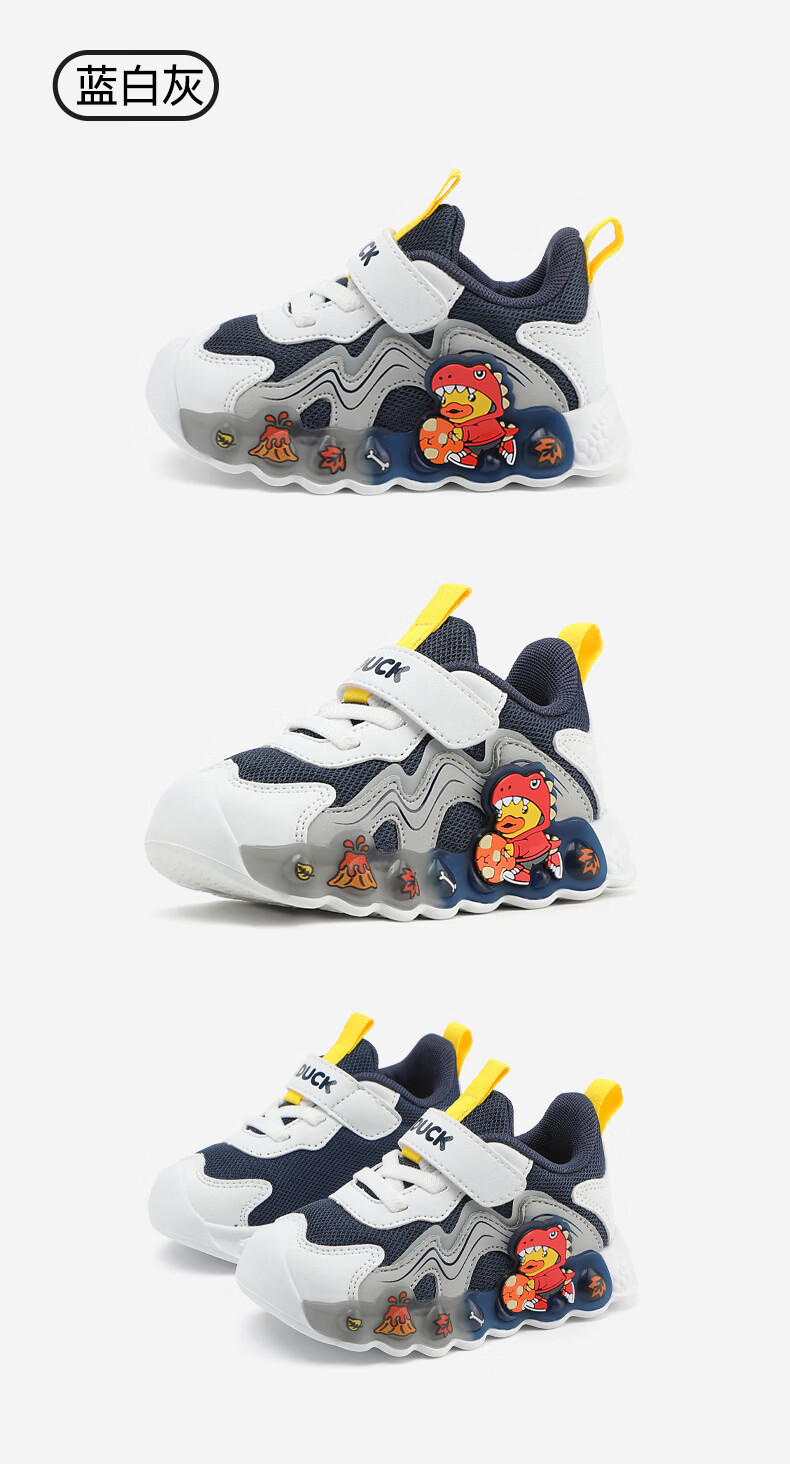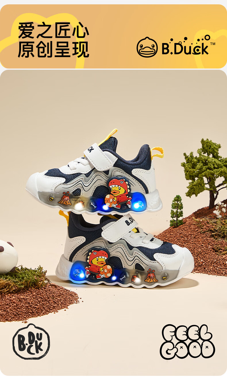B.Duck小黄鸭童鞋男童春秋季新款亮灯儿童运动鞋女童网面透气灯鞋跑步鞋 黑米绿 22 码脚长12.7-13.2cm