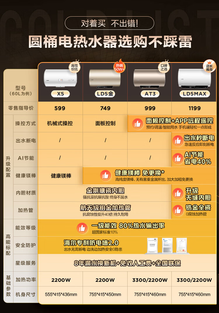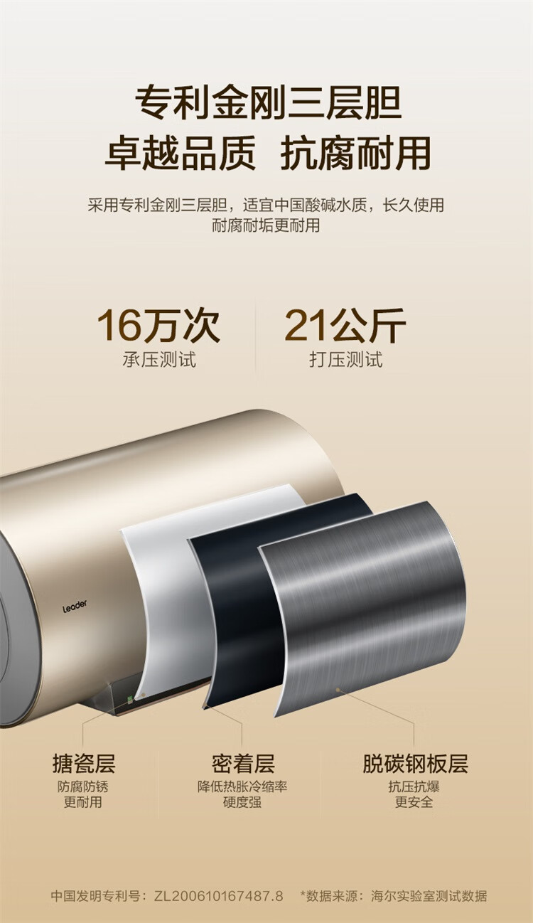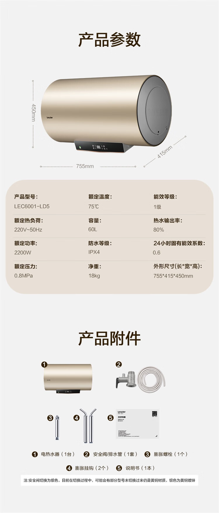 海尔出品统帅60升电热水器京东自营上门安装 国家补贴 2200W节能速热一级能效家用储水式LEC6001-LD5金