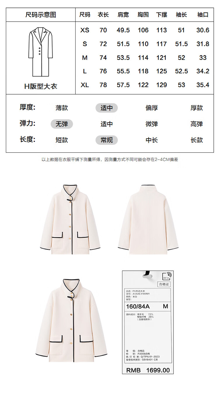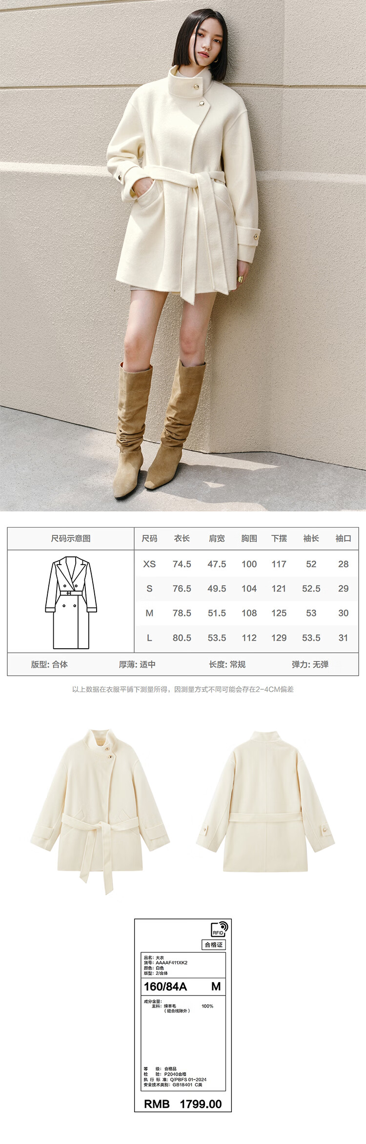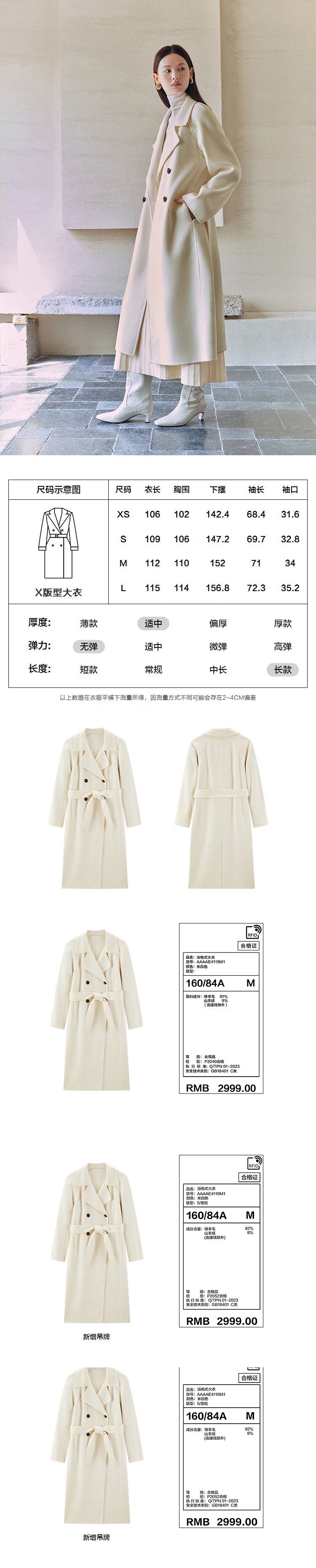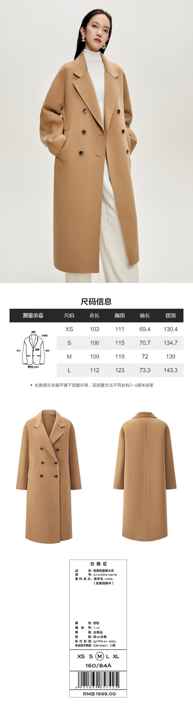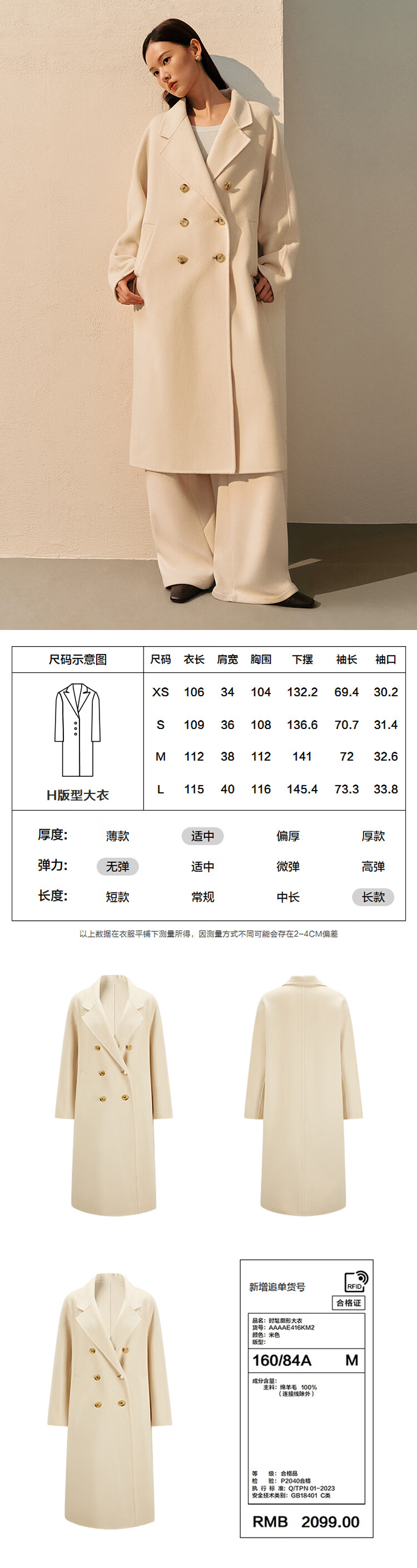 太平鸟大师甄绒甄毛系列新中式优雅双面呢大衣冬季毛呢外套合集 大衣米色 常规 M