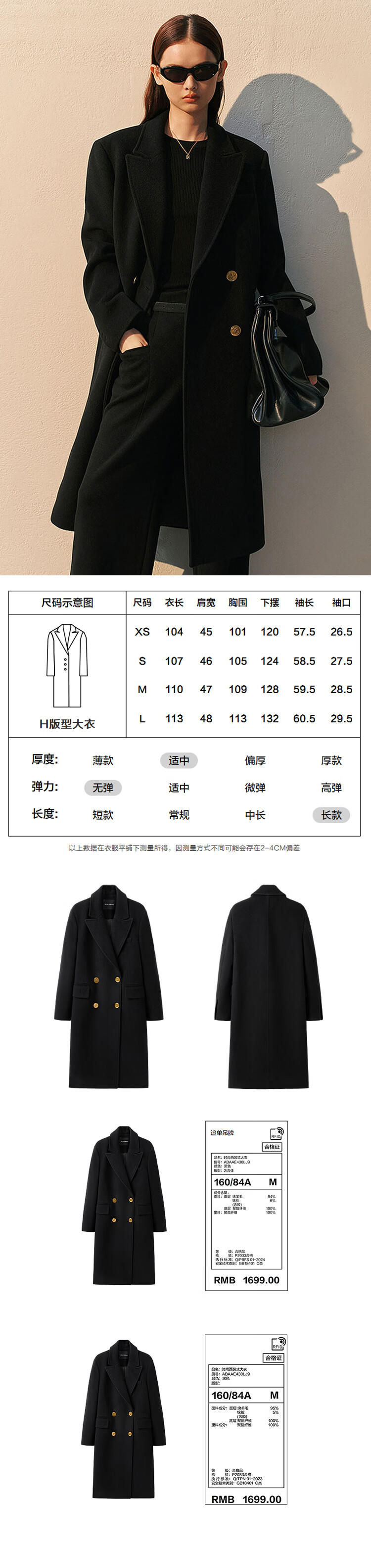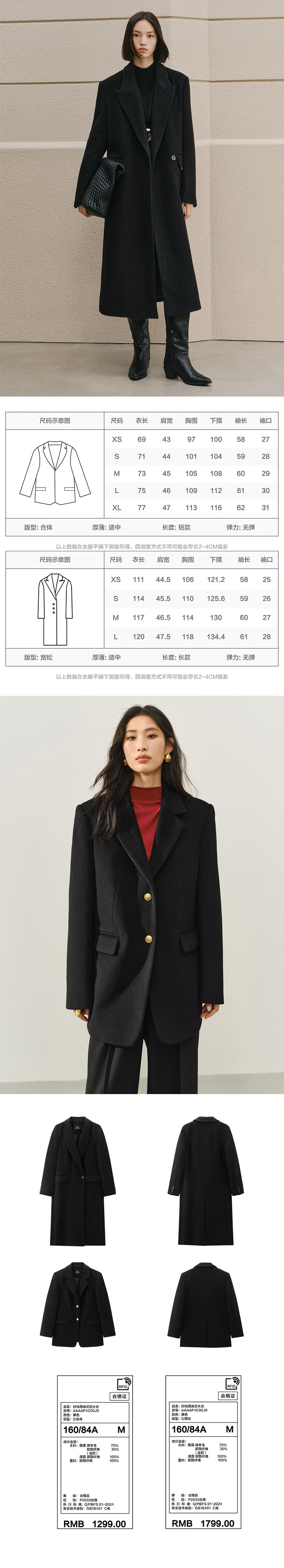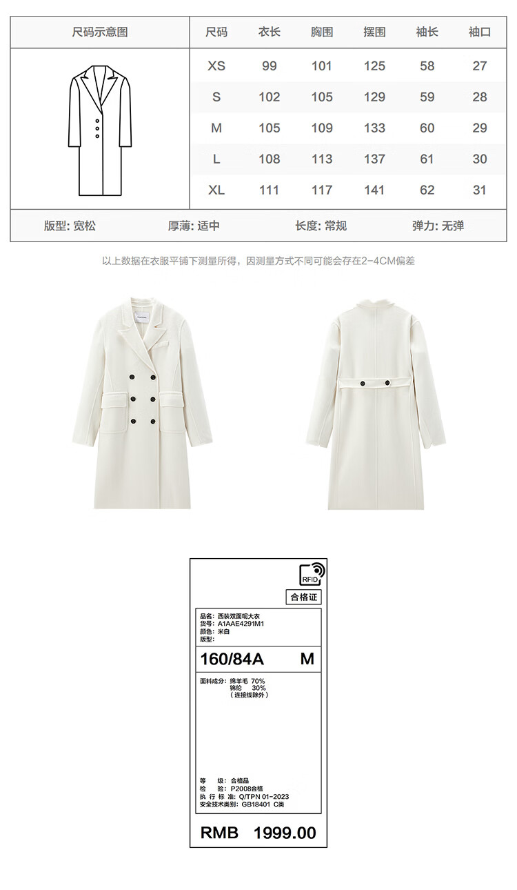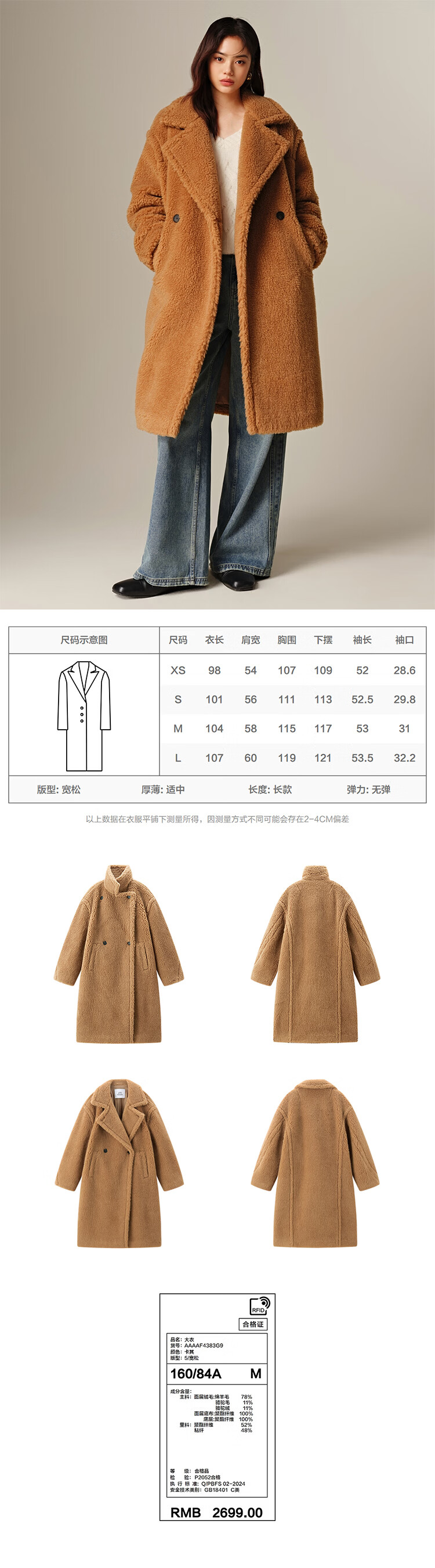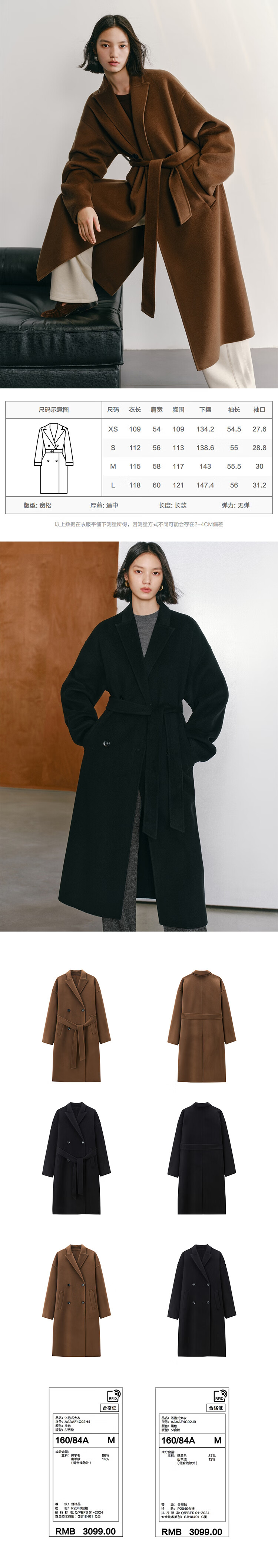 太平鸟大师甄绒甄毛系列新中式优雅双面呢大衣冬季毛呢外套合集 大衣米色 常规 M