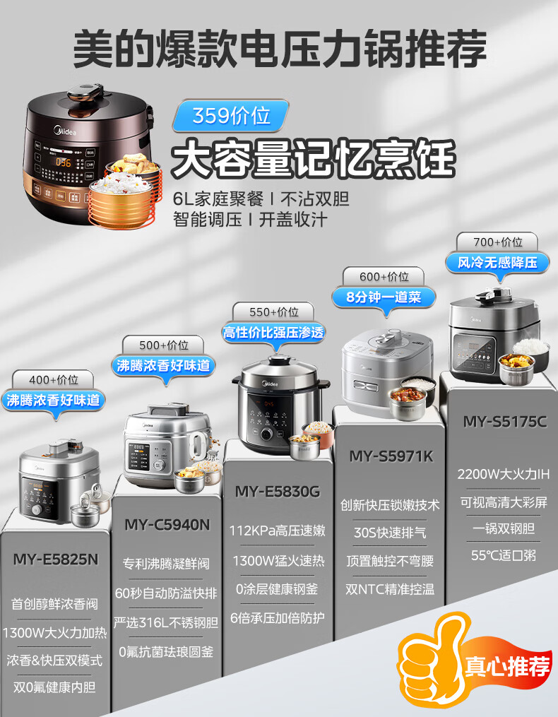 美的(Midea)品牌官方全自动智能预约电压力锅6L大容量家用双胆煲汤电饭煲60Easy203多功能高压锅4-6人