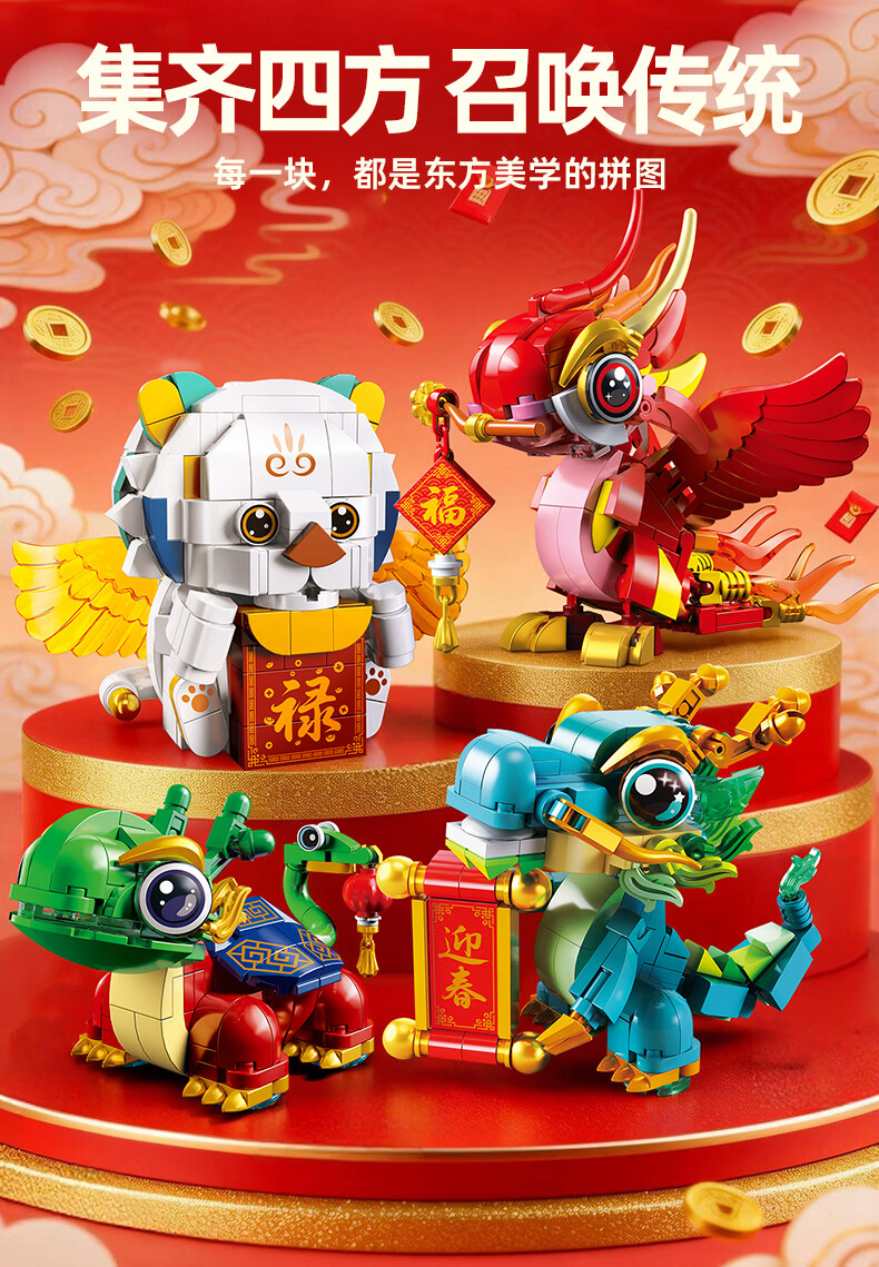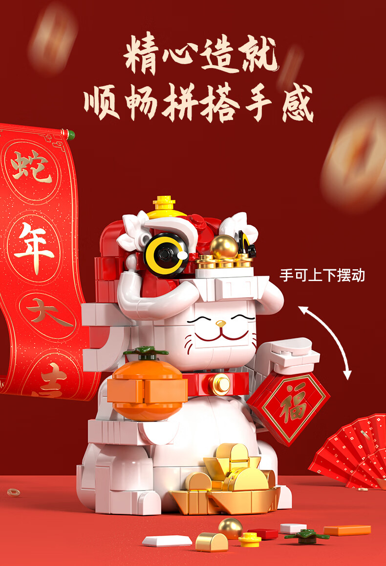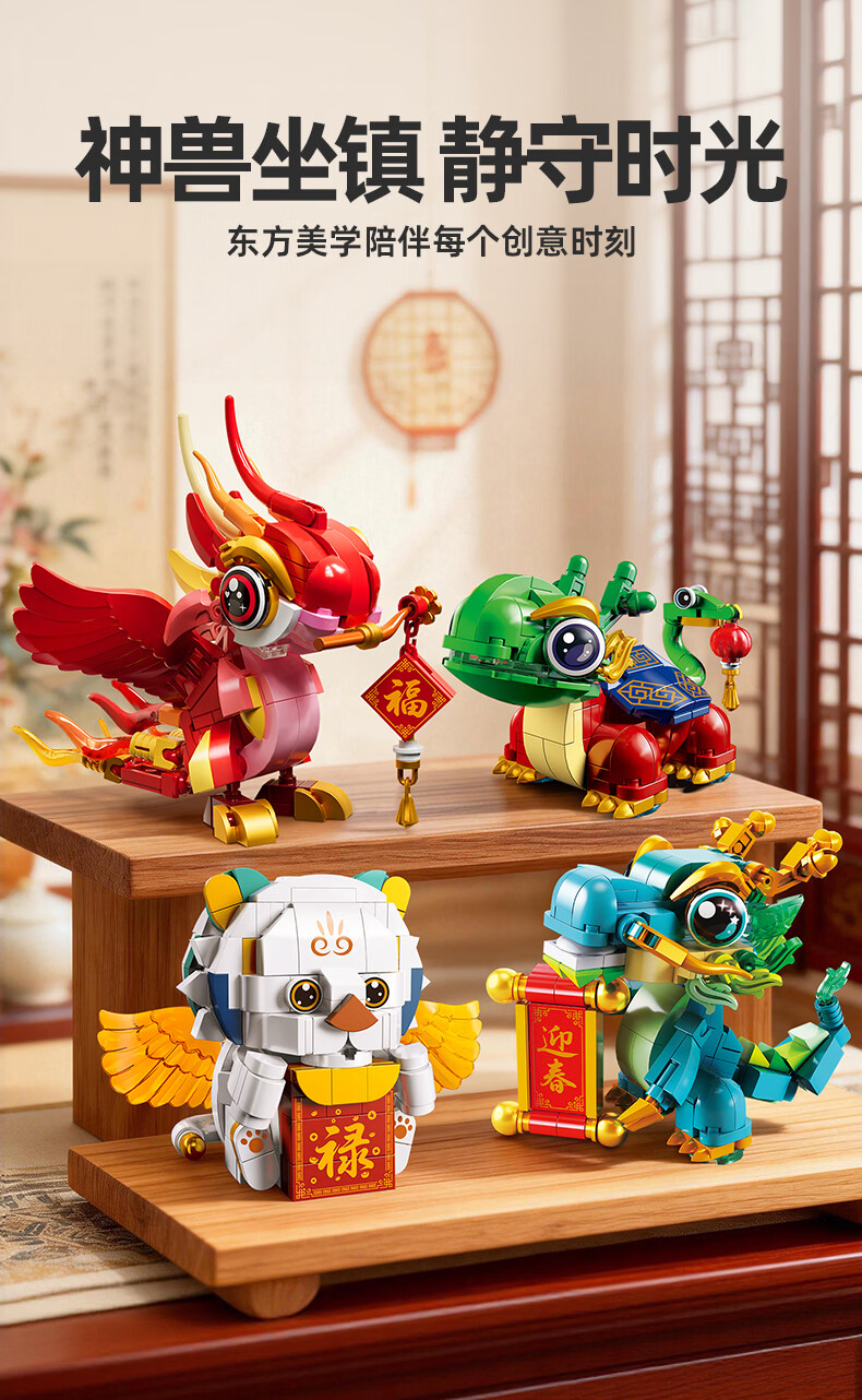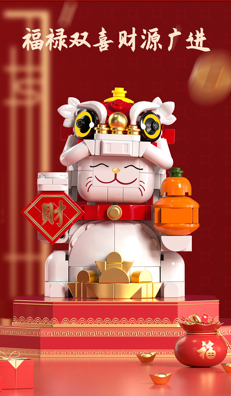 乐凑(L)中国四大神兽积木拼装模型儿童玩具摆件男孩6-12岁过年礼物礼盒 醒狮招财猫800+Pcs