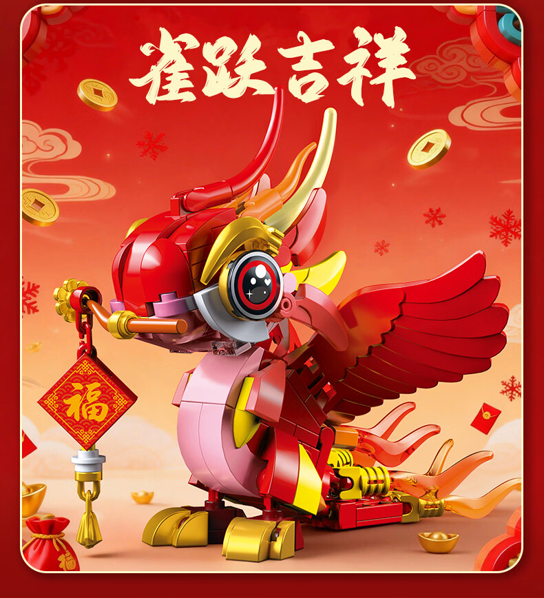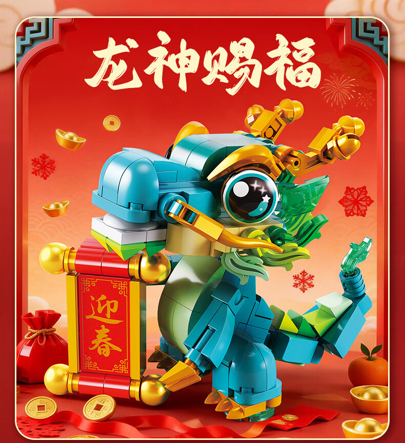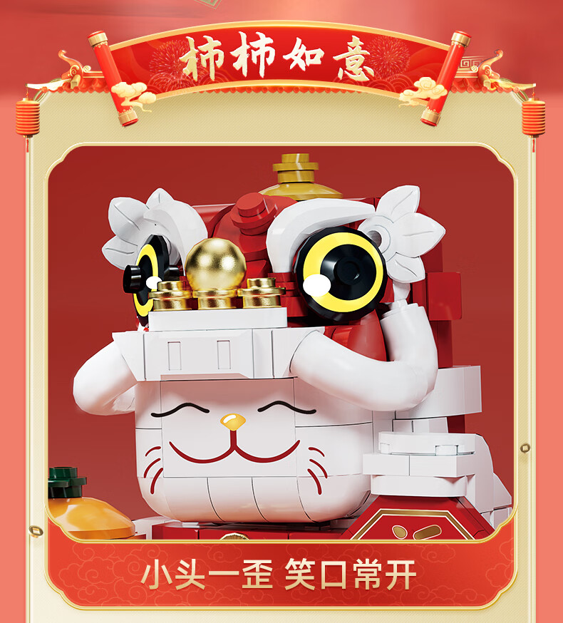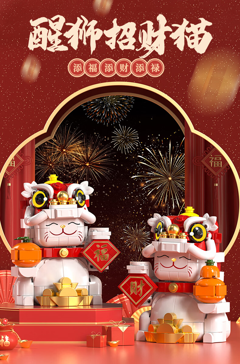 乐凑(L)国潮神兽积木拼装新年装饰品摆件醒狮锦鲤招财猫玩具儿童节礼物 【醒狮】9.2*7.2*10cm