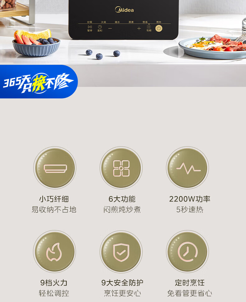 美的(Midea)电磁炉电陶炉家用 电磁炉2200W大功率猛火小型耐用易洁面板九档火力电磁灶一体面板智能定时火锅炉 【单灶】高性价比爆款