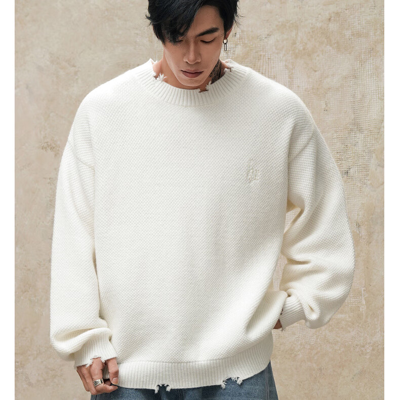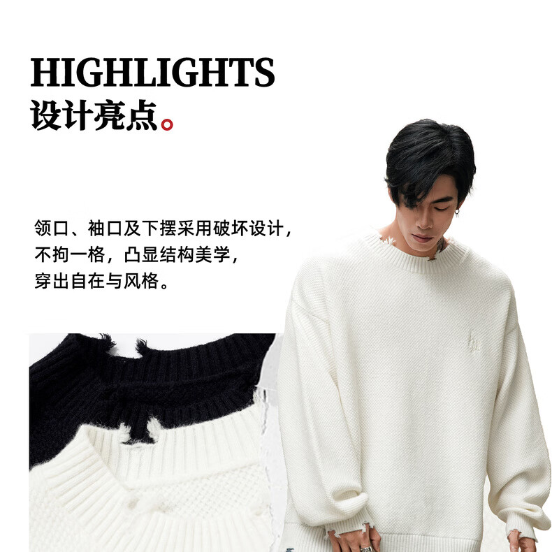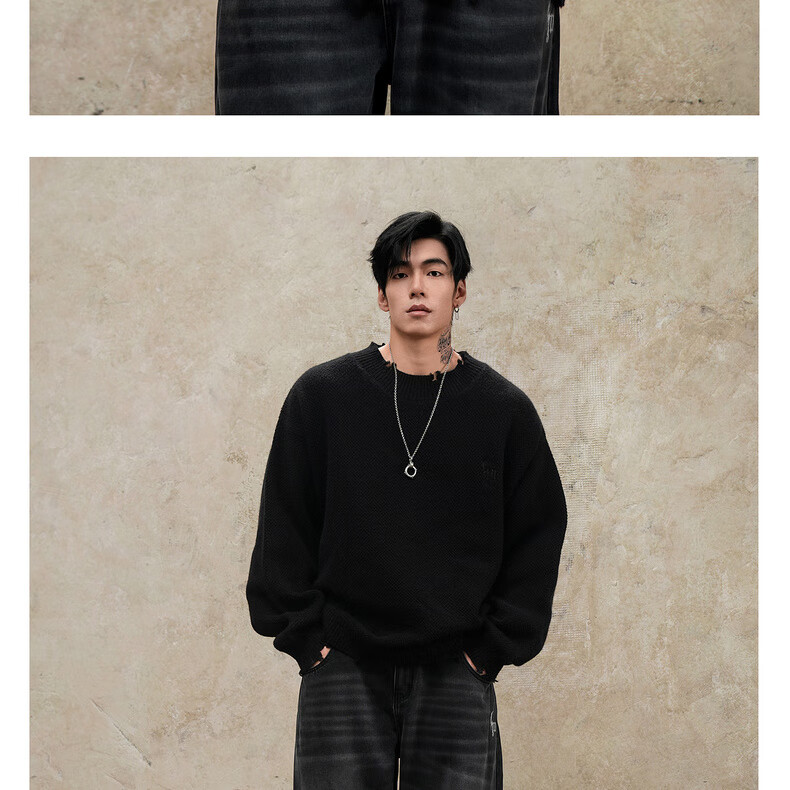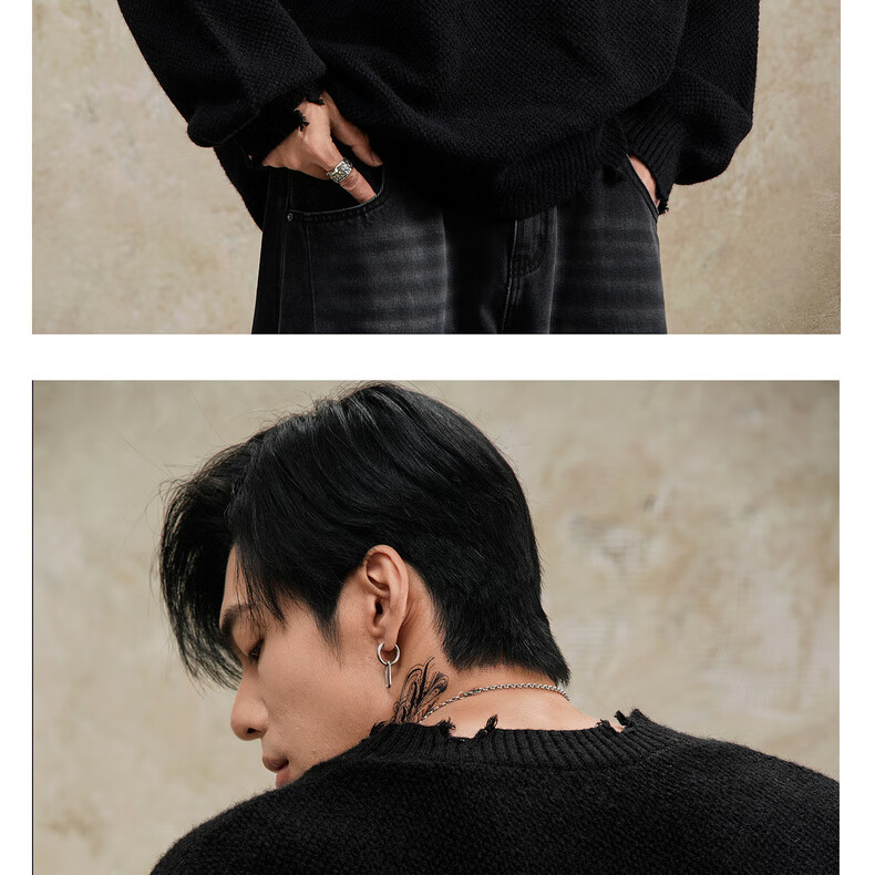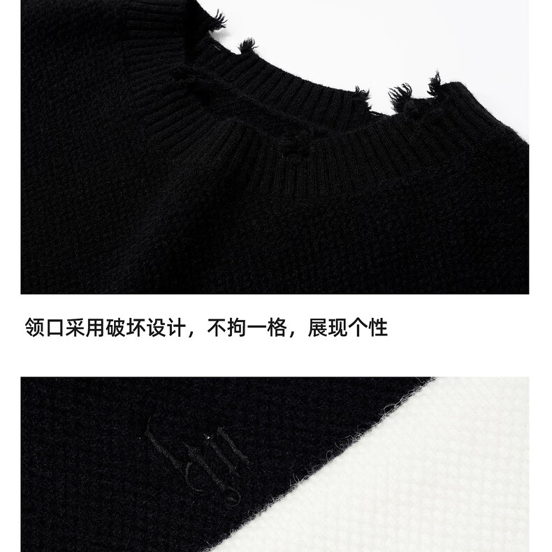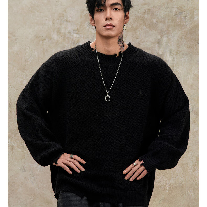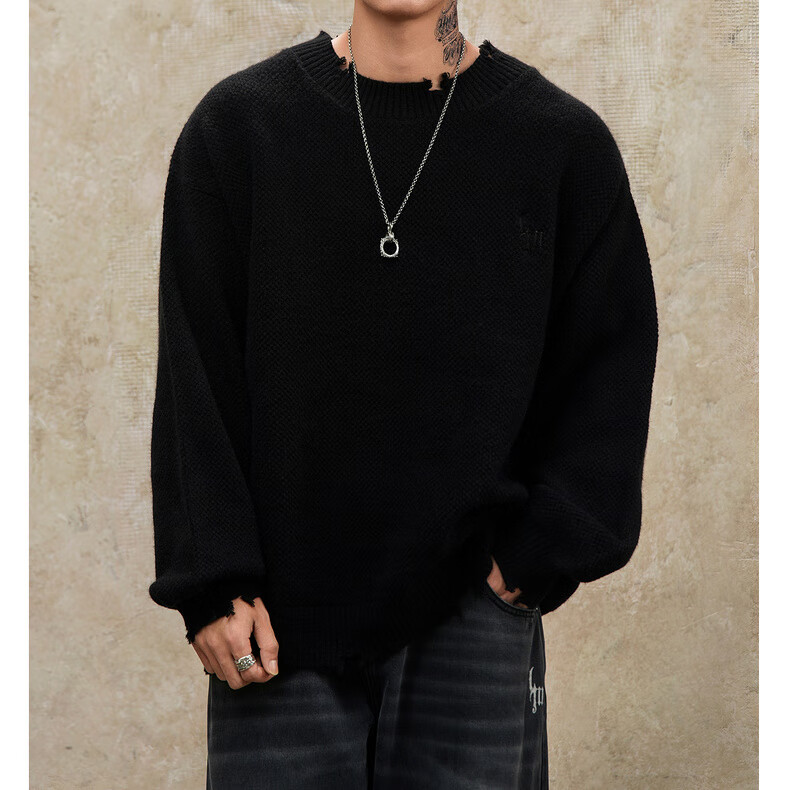 鹿家门秋冬重磅破洞套头毛衣慵懒高级感男士圆领加厚保暖打底衫 黑色 M 推荐90-140斤