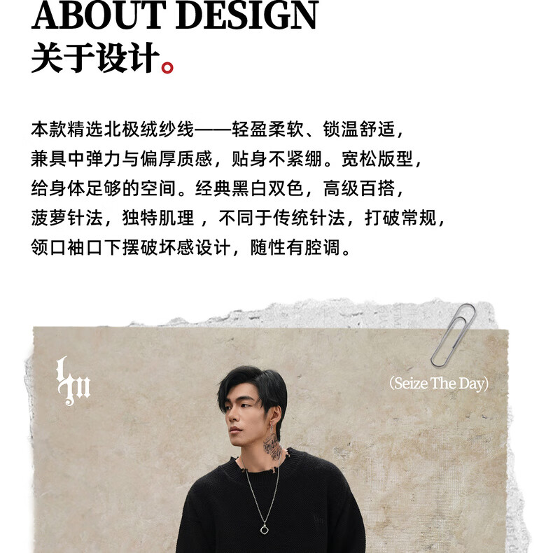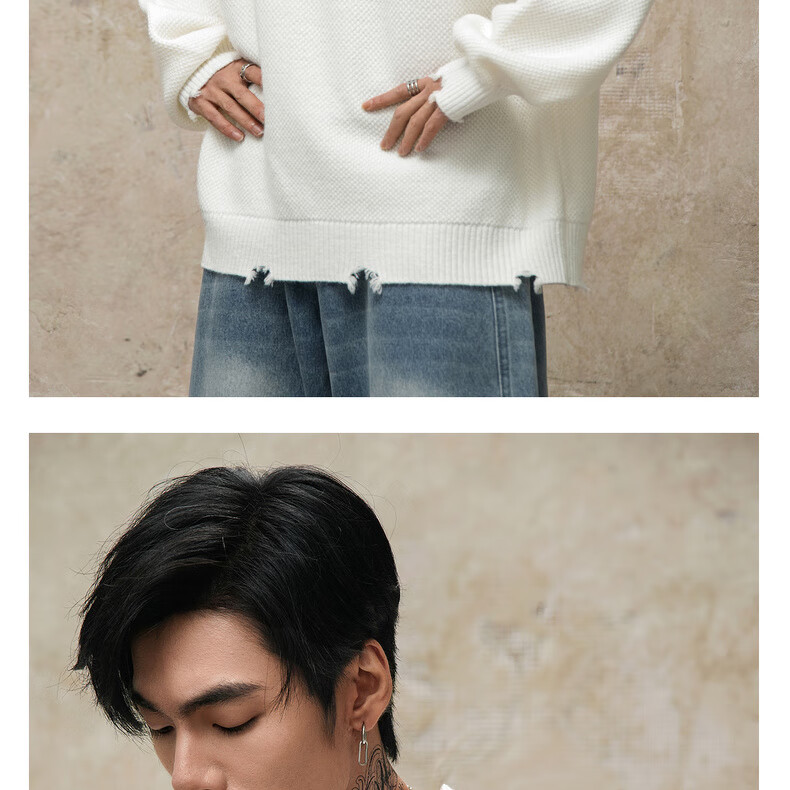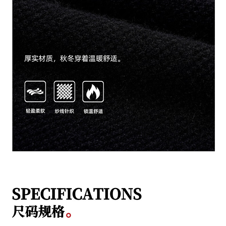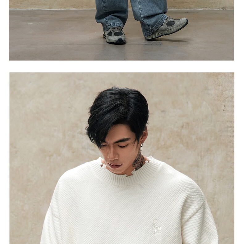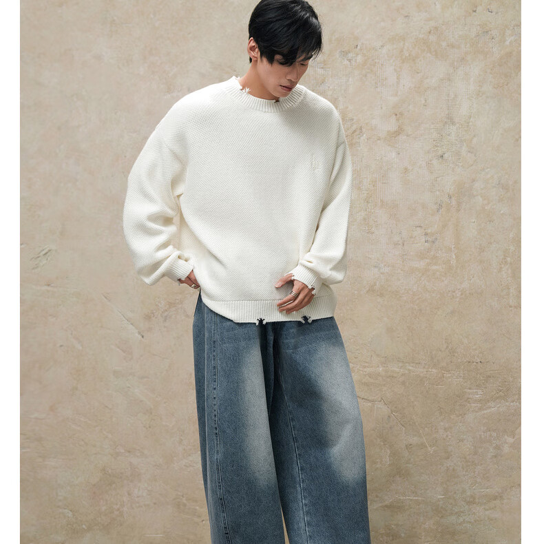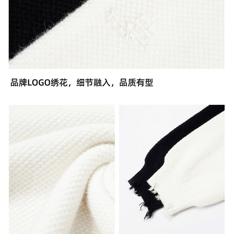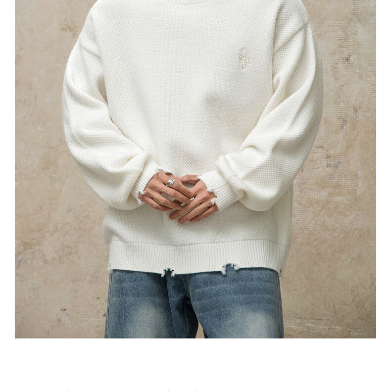 鹿家门秋冬重磅破洞套头毛衣慵懒高级感男士圆领加厚保暖打底衫 黑色 M 推荐90-140斤
