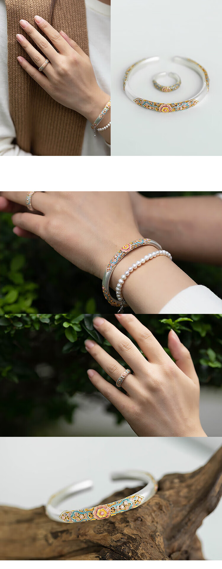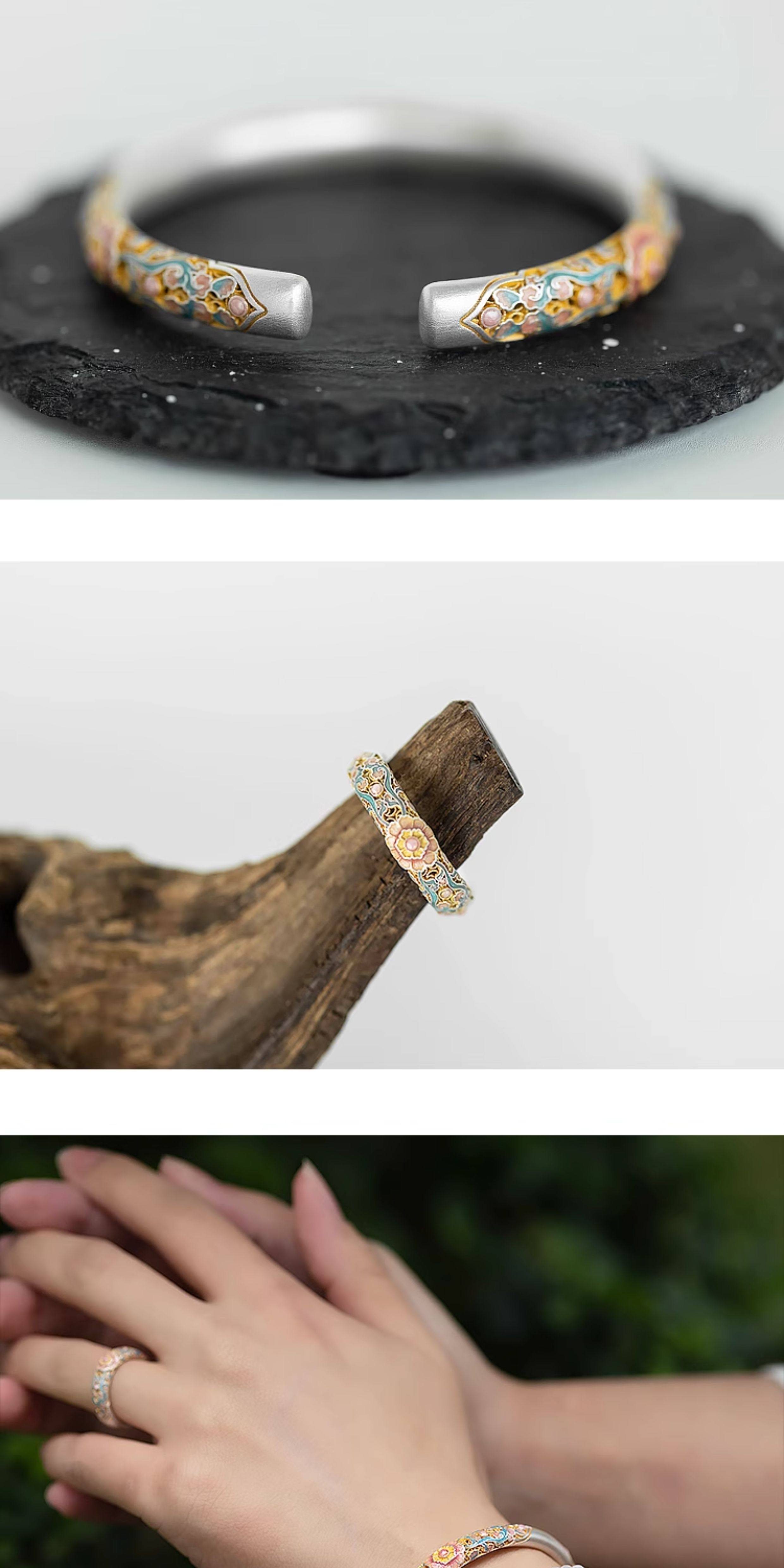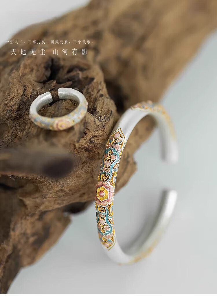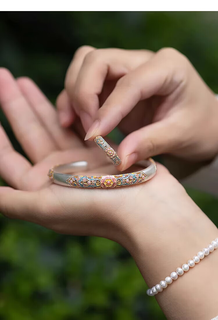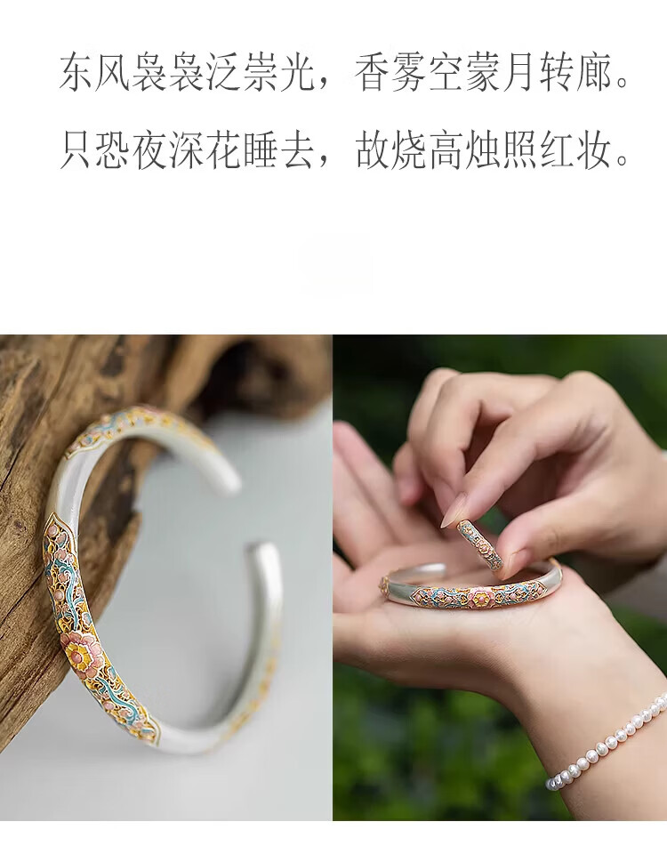 银手镯珐琅彩蜀锦 海棠花9999描金镂空开口手环新代购 蜀锦手镯(约22g±1g)