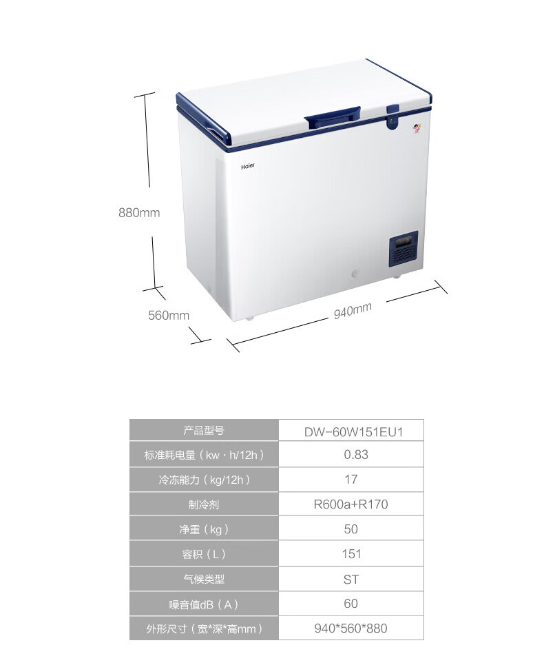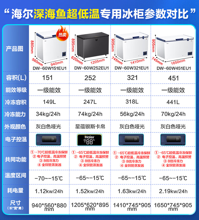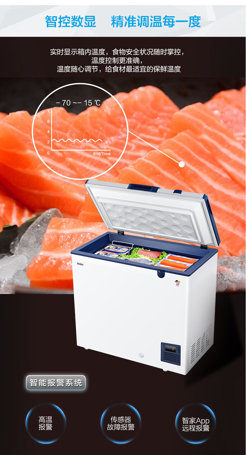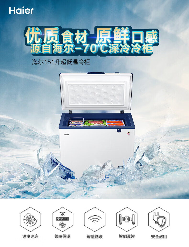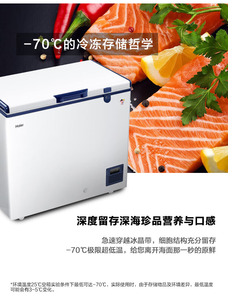 海尔(Haier)超低温冰柜零下负-70/-65/-60℃度商用家用大容量卧式冷冻柜金枪鱼海鲜柜一级能效以旧换新 零下70度|不锈钢内胆|全铜管|手机互联 151L