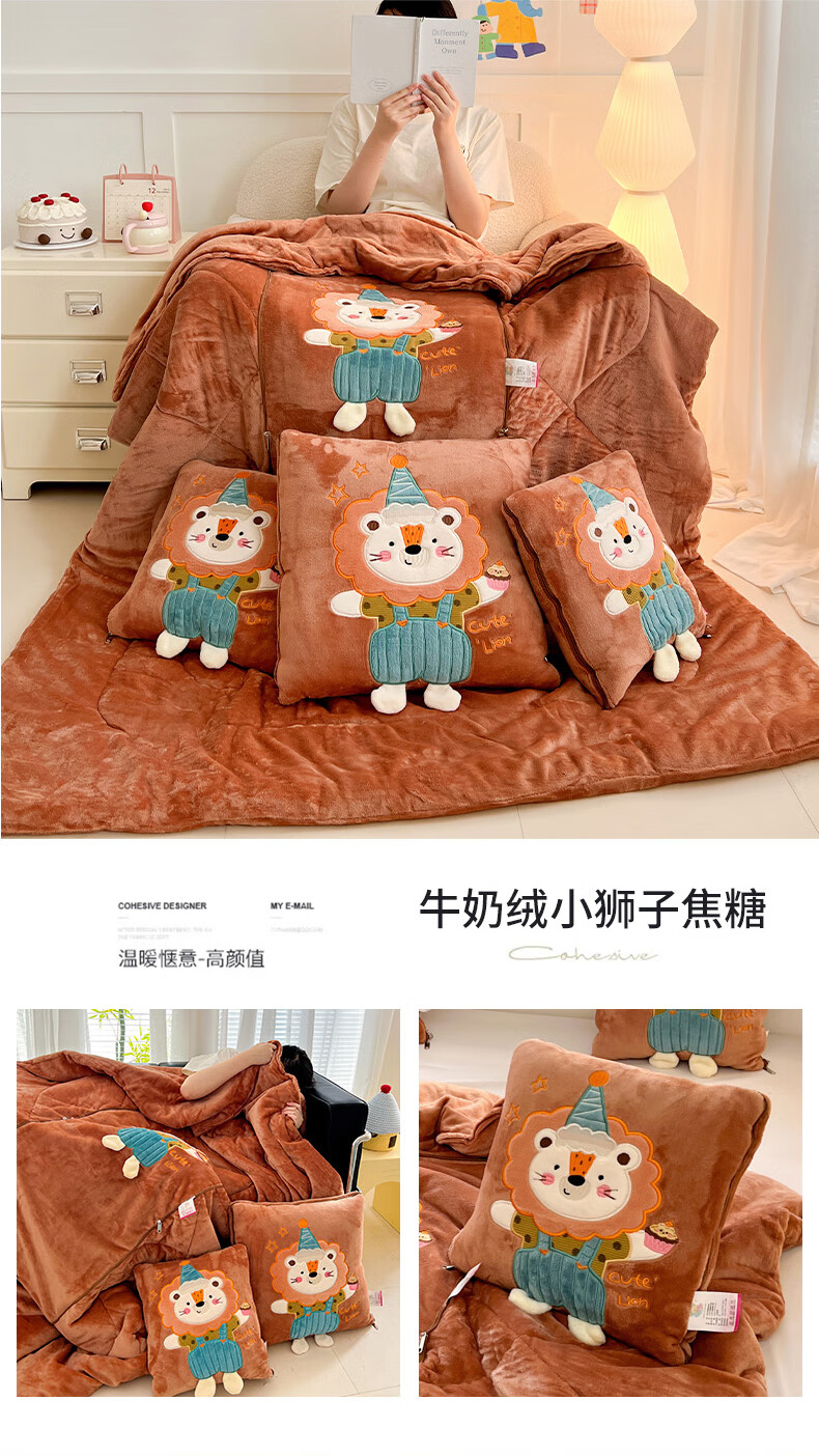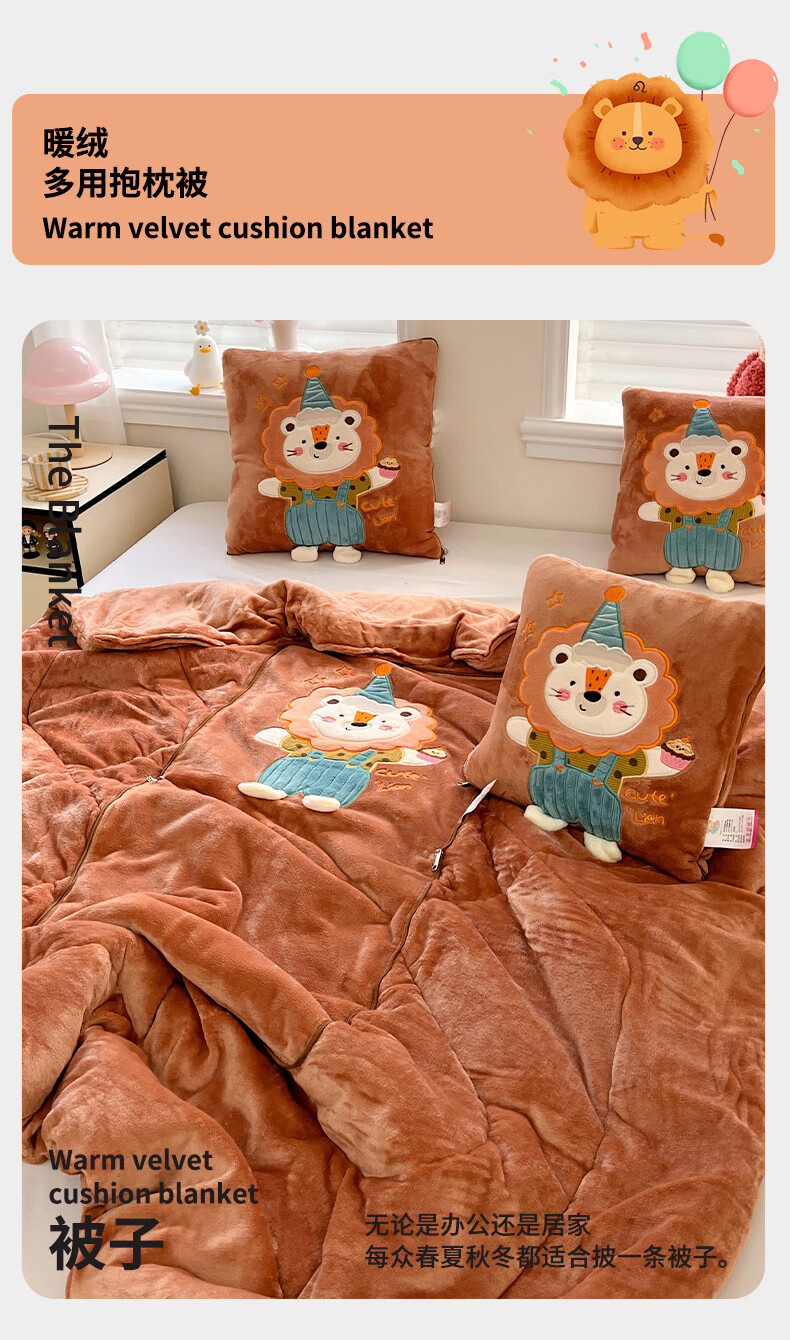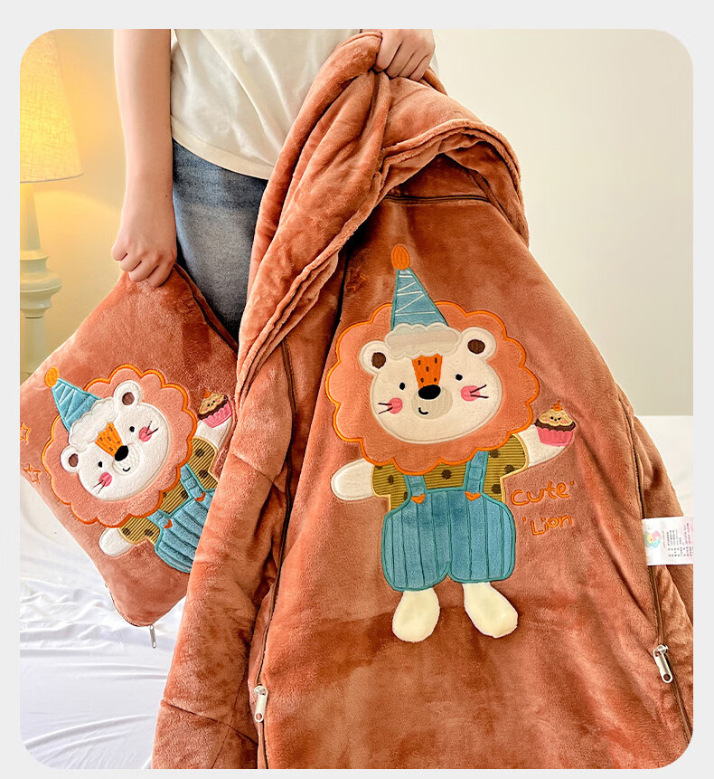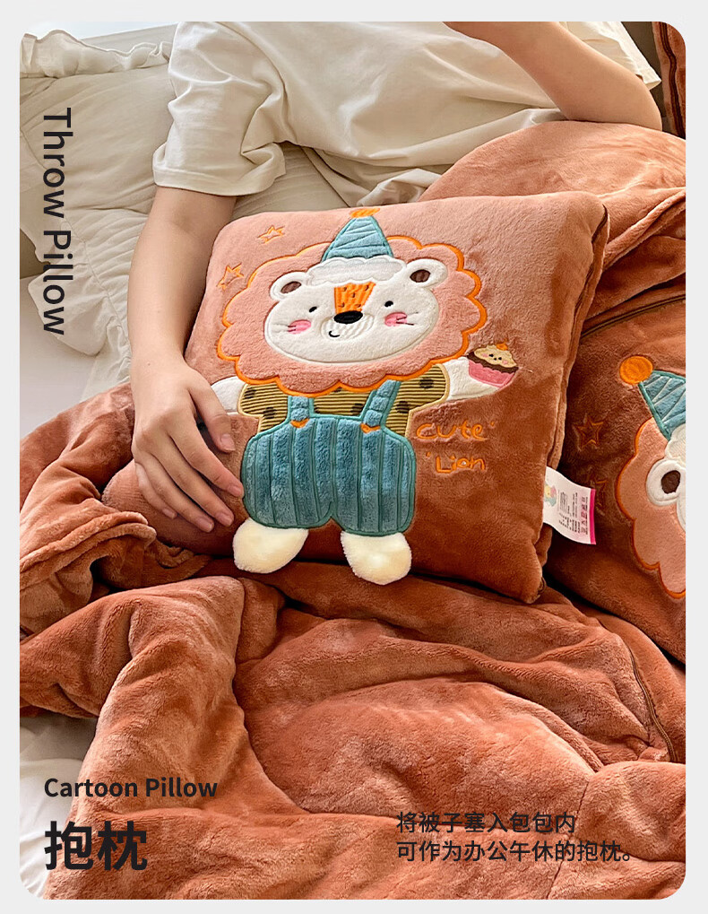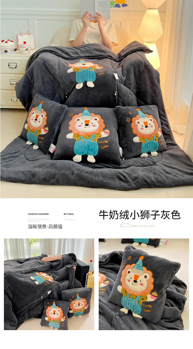 恒源祥牛奶绒小狮子抱枕被二合一加绒办公室午睡毯车载毛毯汽车抱枕被 牛奶绒小狮子抱枕被 -灰色 40cm*40cm 展开105*145cm