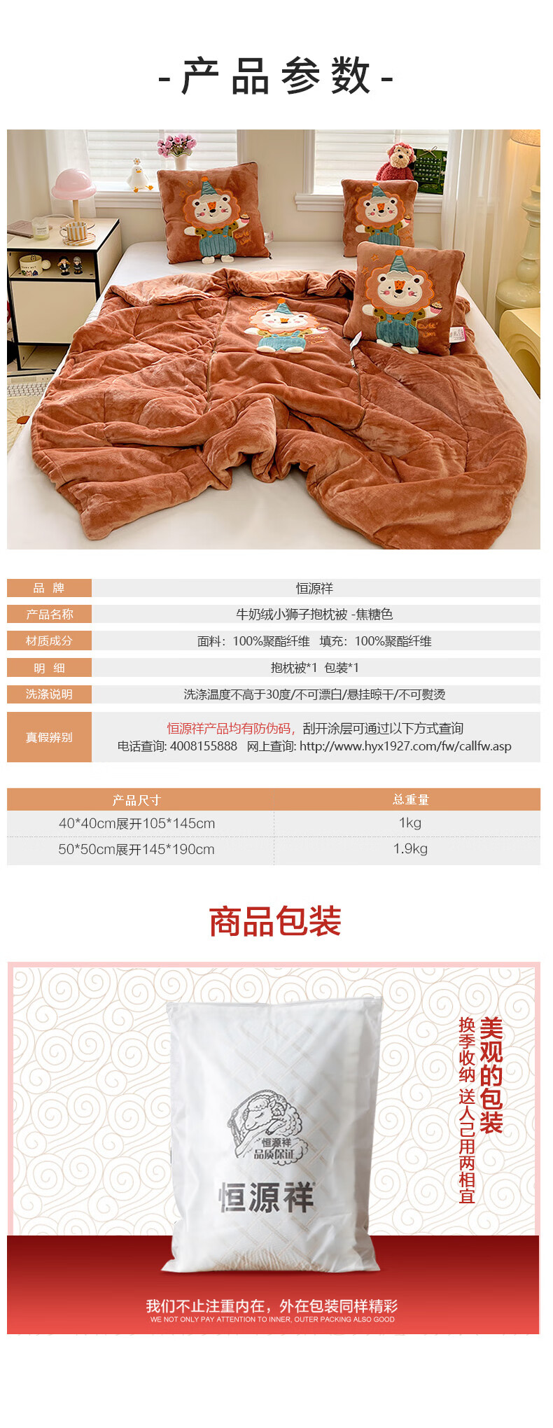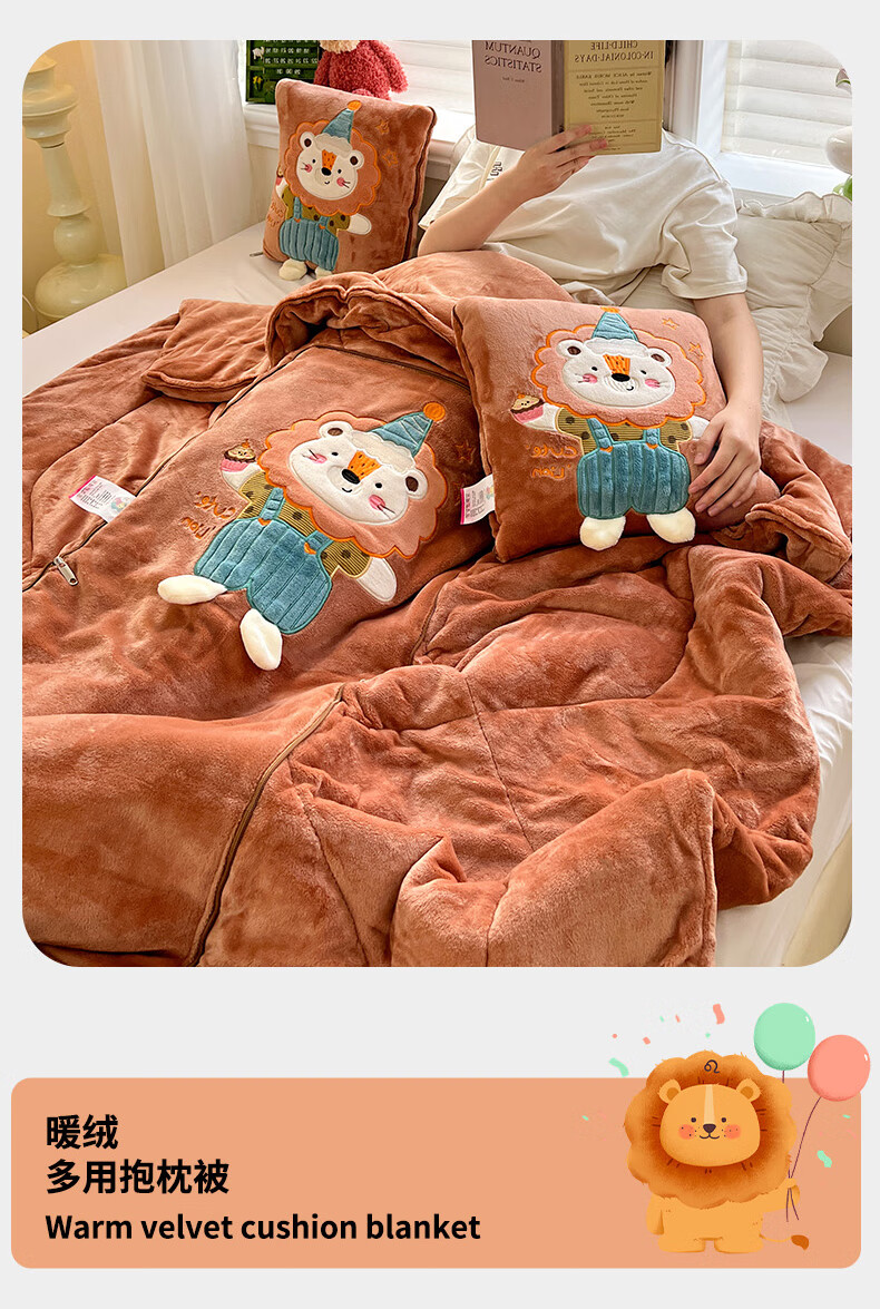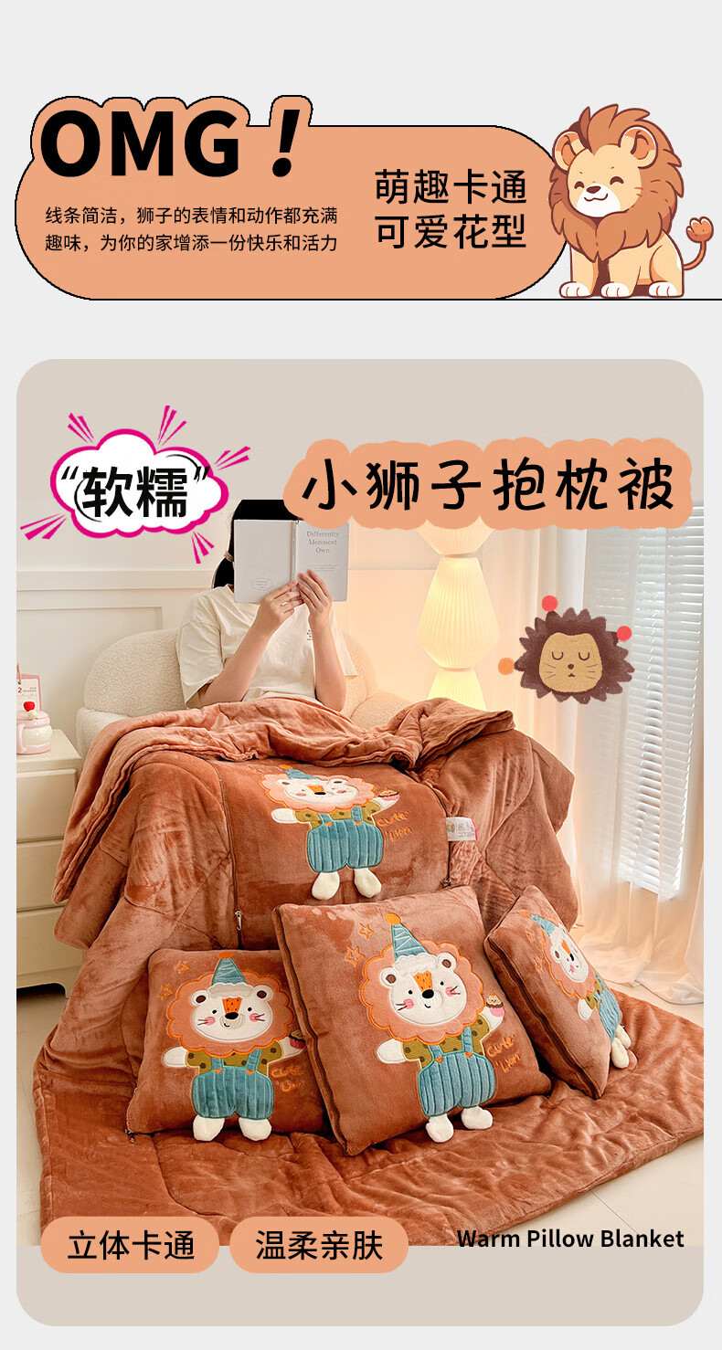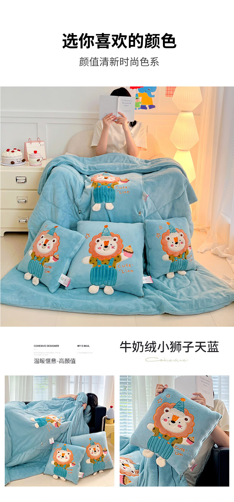 恒源祥牛奶绒小狮子抱枕被二合一加绒办公室午睡毯车载毛毯汽车抱枕被 牛奶绒小狮子抱枕被 -灰色 40cm*40cm 展开105*145cm