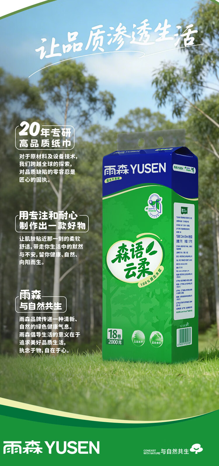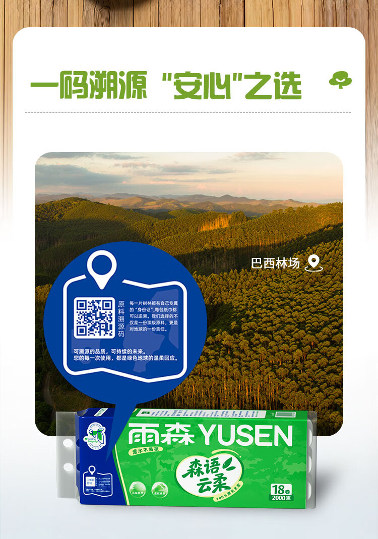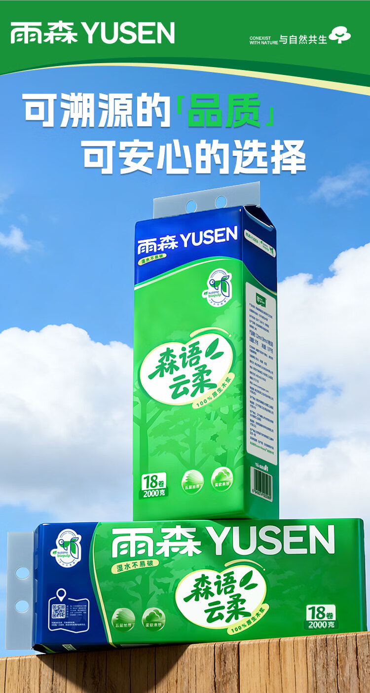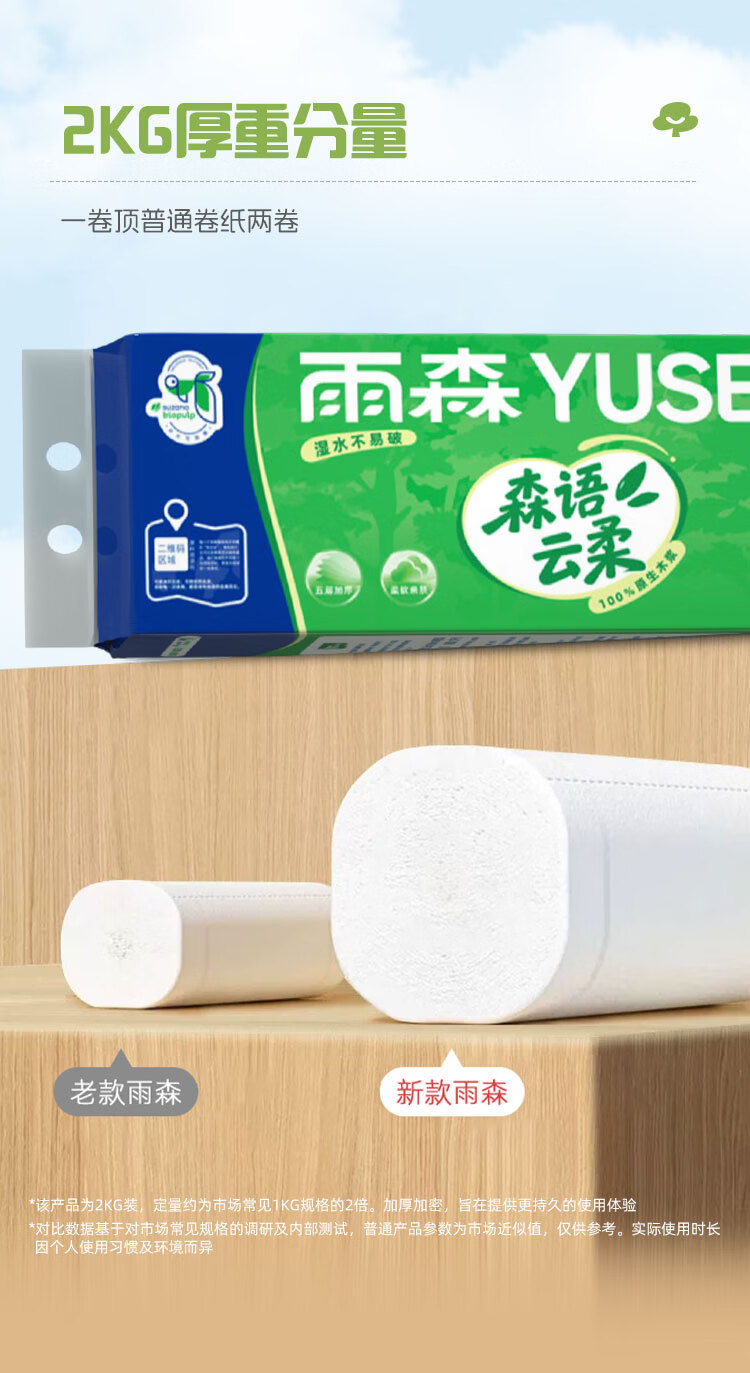 雨森无芯卷纸5层加厚湿水不易破家用卫生纸100%原生木浆纸巾厕纸 5层 111g/卷*18卷 【2000克】