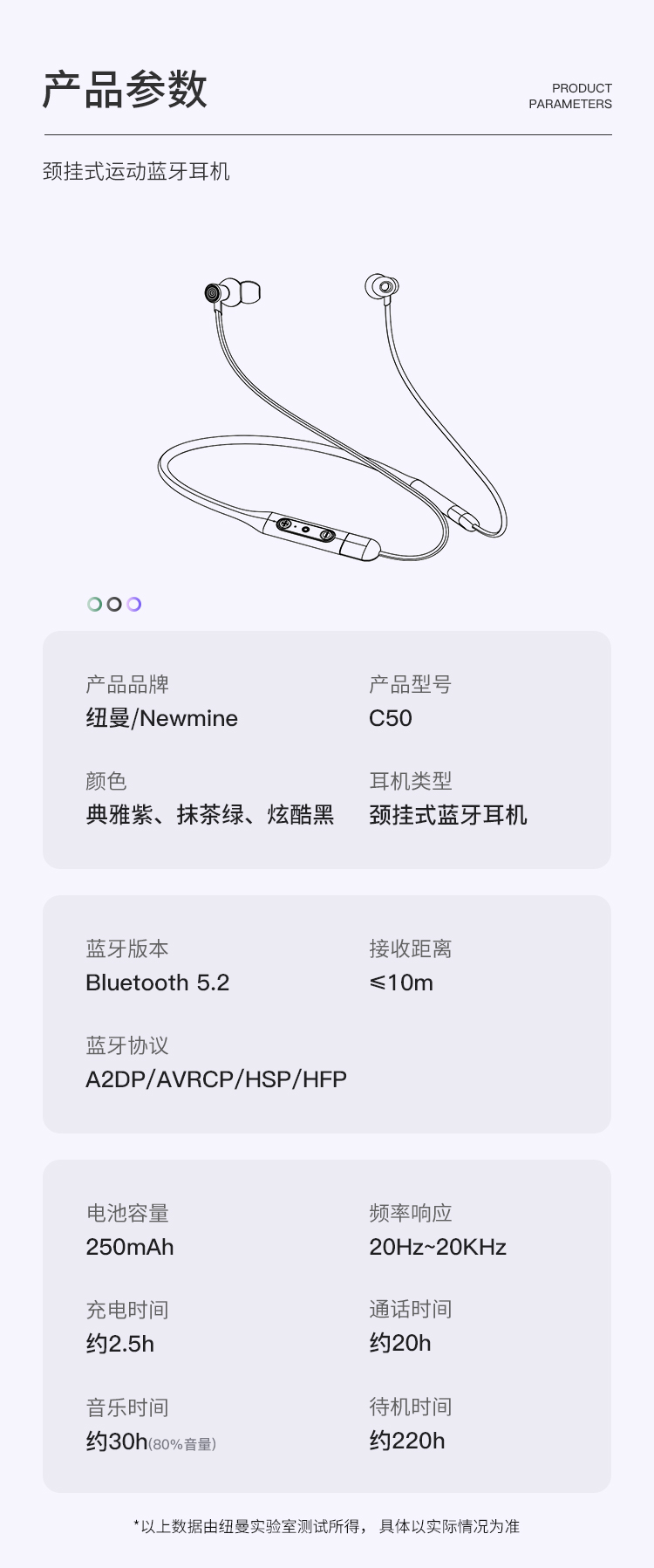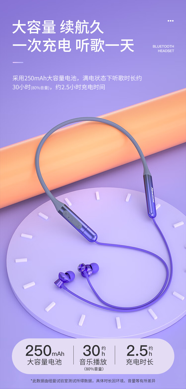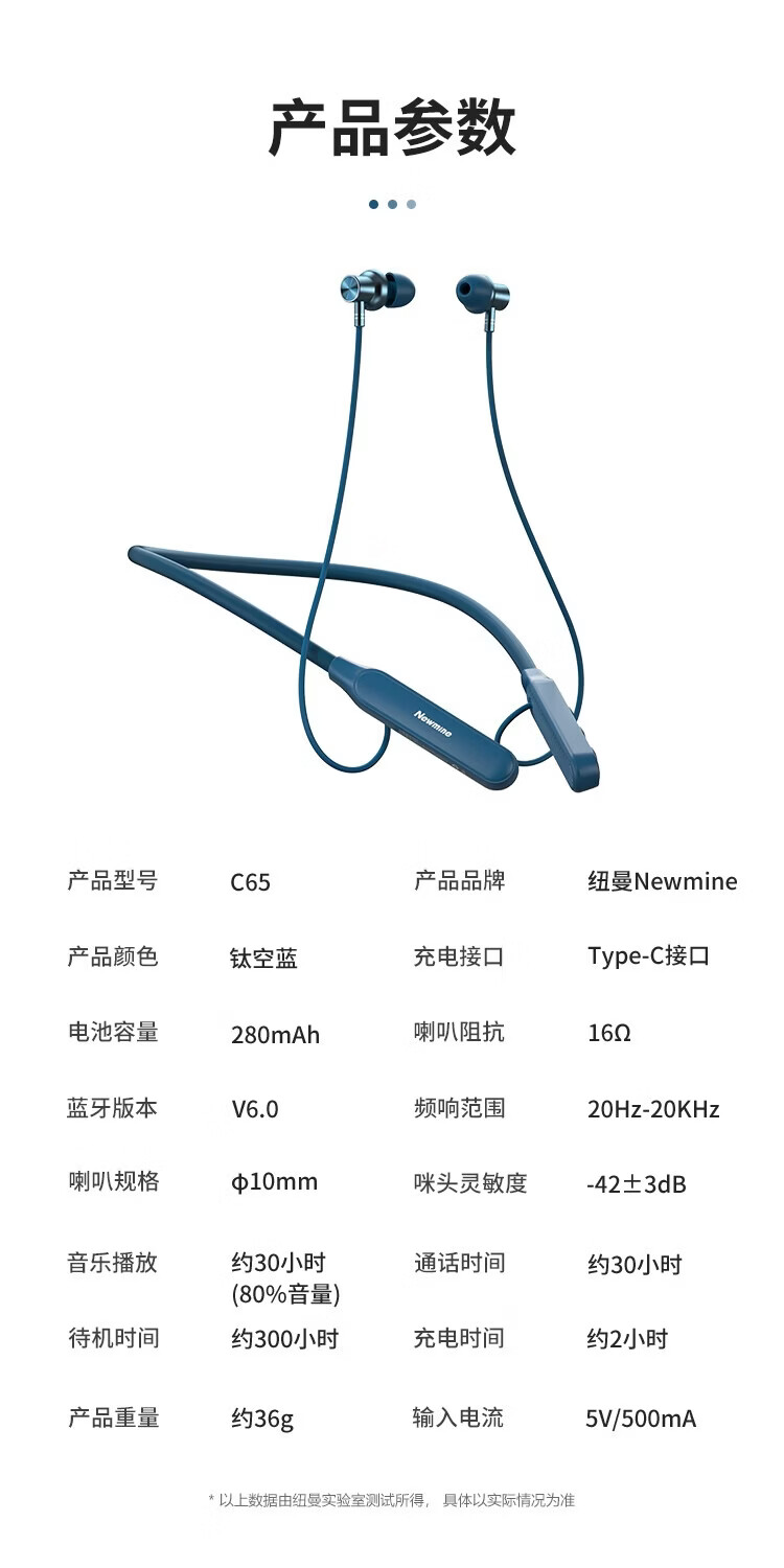 纽曼(Newmine)无线蓝牙耳机挂脖入耳式颈挂跑步运动型超长续航防汗高音质低延时大容量适用于华为苹果手机通用 30H续航丨来电震动丨通话降噪丨C65钛空蓝 官方标配